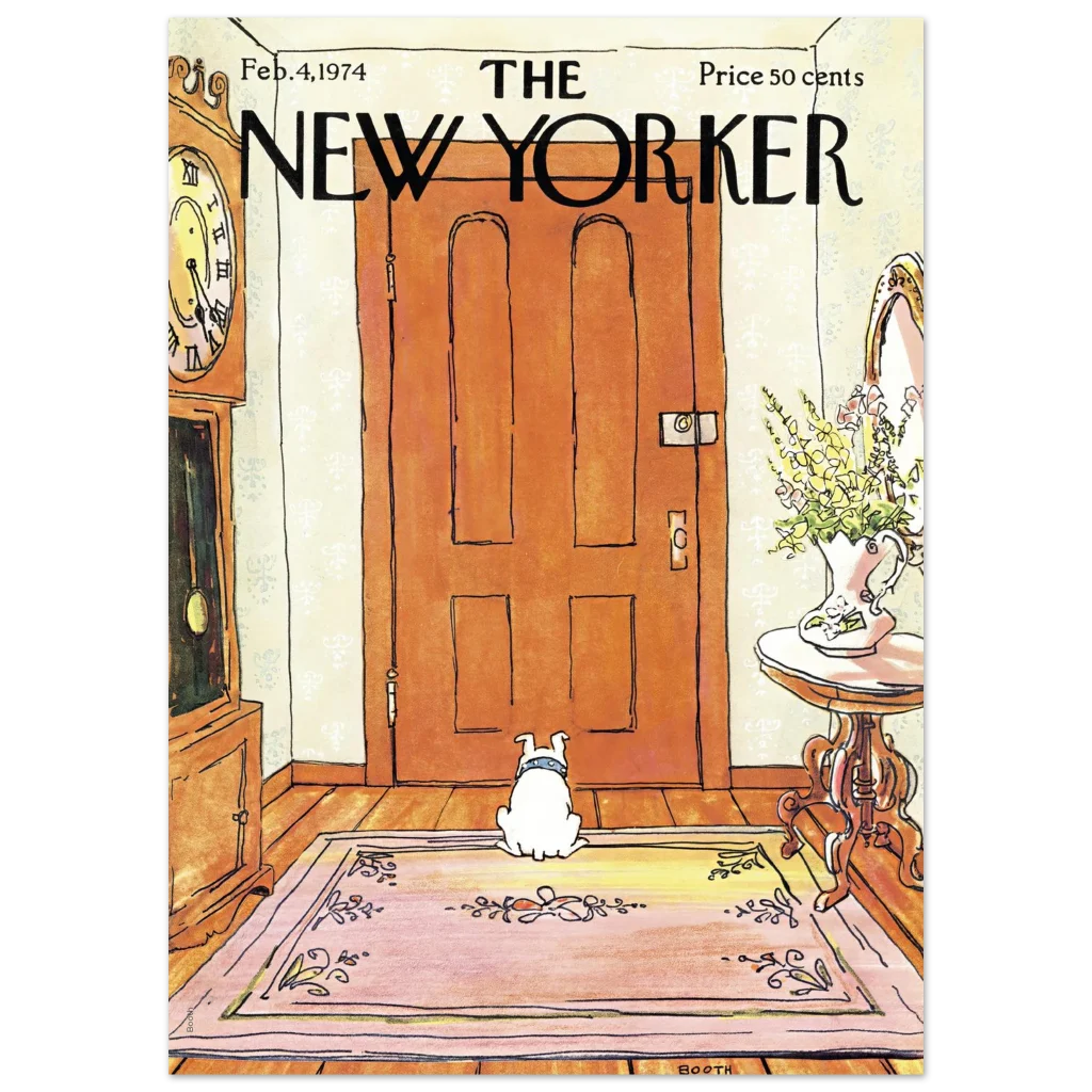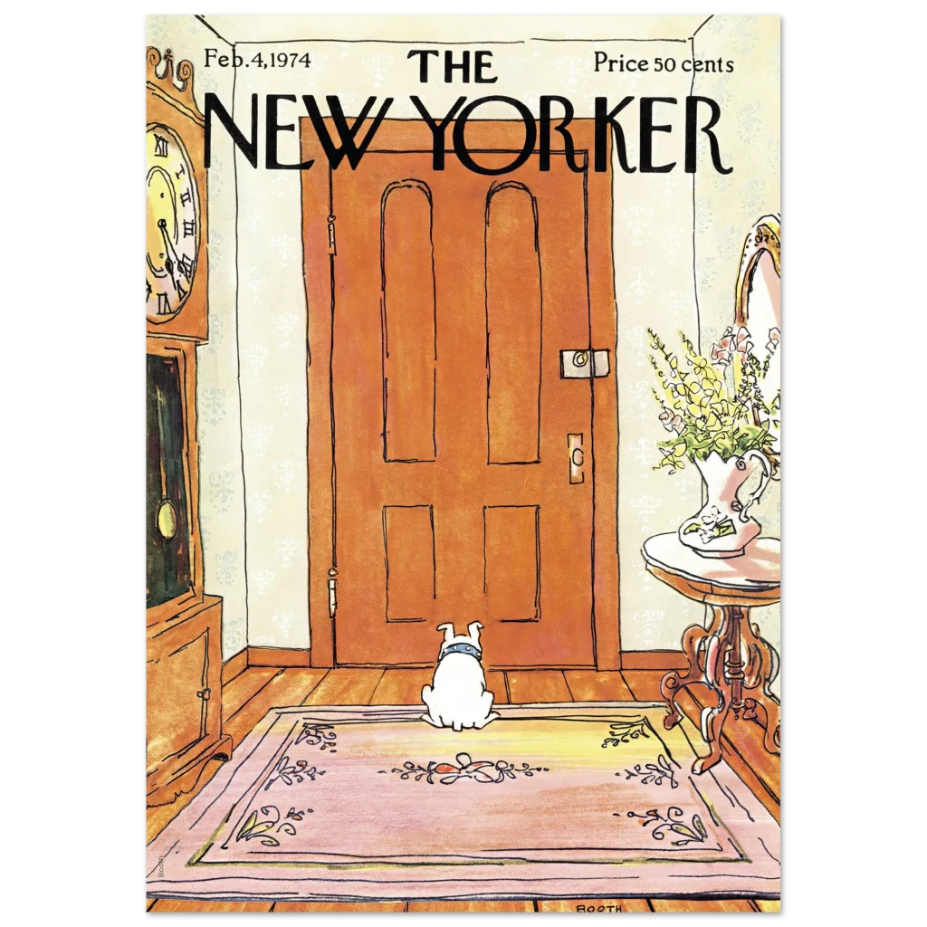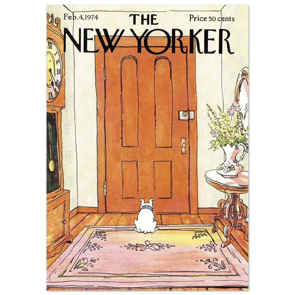 Capture a moment of timeless loyalty and anticipation with our “Waiting for You” poster, featuring the iconic New Yorker cover from February 4, 1974. This heartwarming illustration, with its warm, inviting palette of soft oranges, creams, and gentle pinks, perfectly encapsulates the quiet devotion of a pet awaiting its beloved owner. It’s an ideal piece to bring a touch of nostalgic charm and heartfelt sentiment to any room.