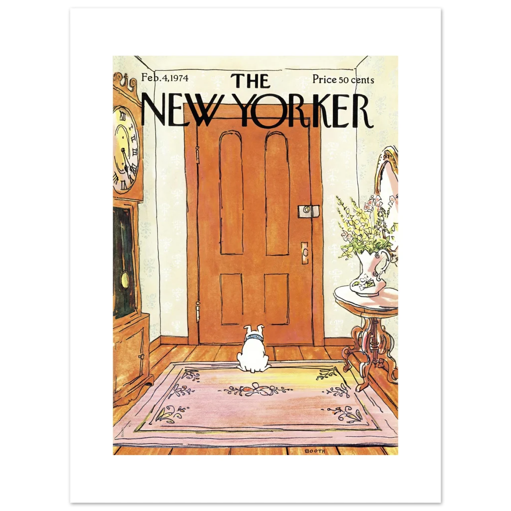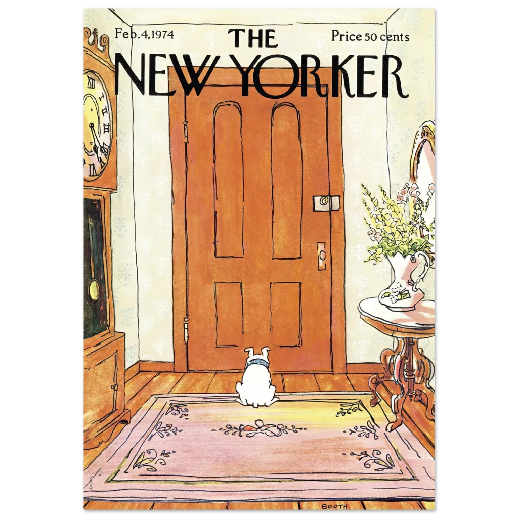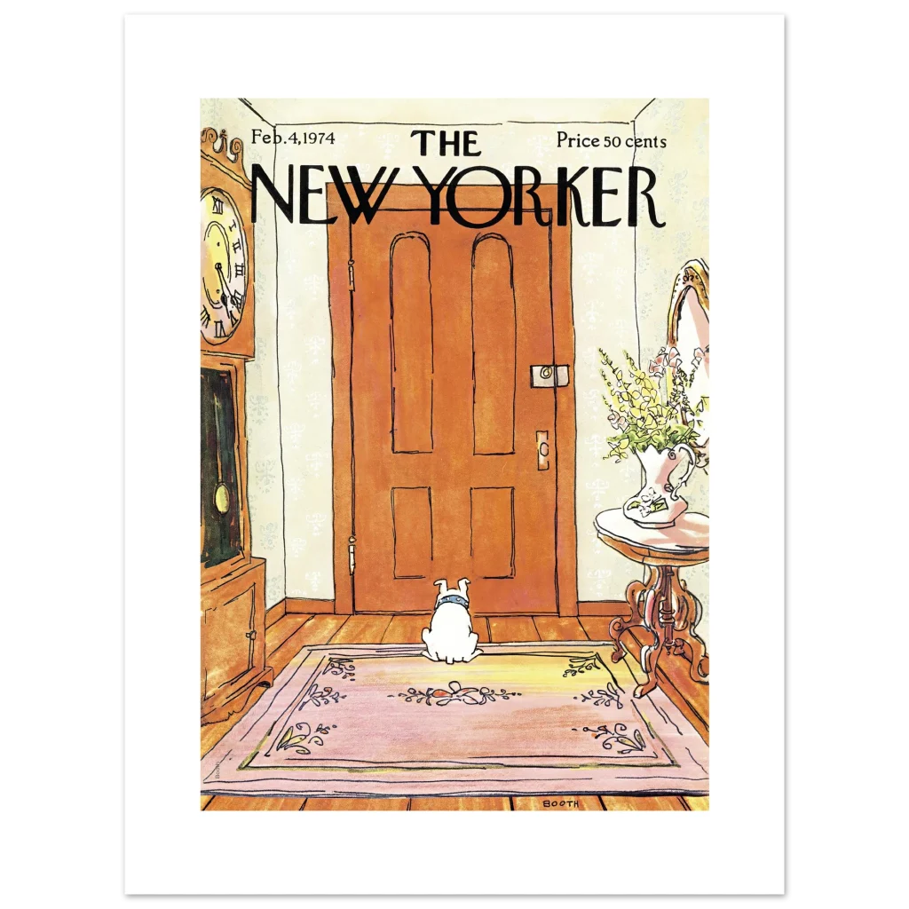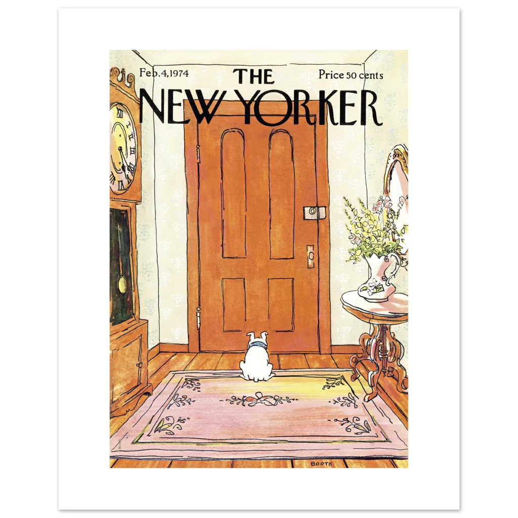 Capture a moment of timeless loyalty and anticipation with our “Waiting for You” poster, featuring the iconic New Yorker cover from February 4, 1974. This heartwarming illustration, with its warm, inviting palette of soft oranges, creams, and gentle pinks, perfectly encapsulates the quiet devotion of a pet awaiting its beloved owner. It’s an ideal piece to bring a touch of nostalgic charm and heartfelt sentiment to any room.