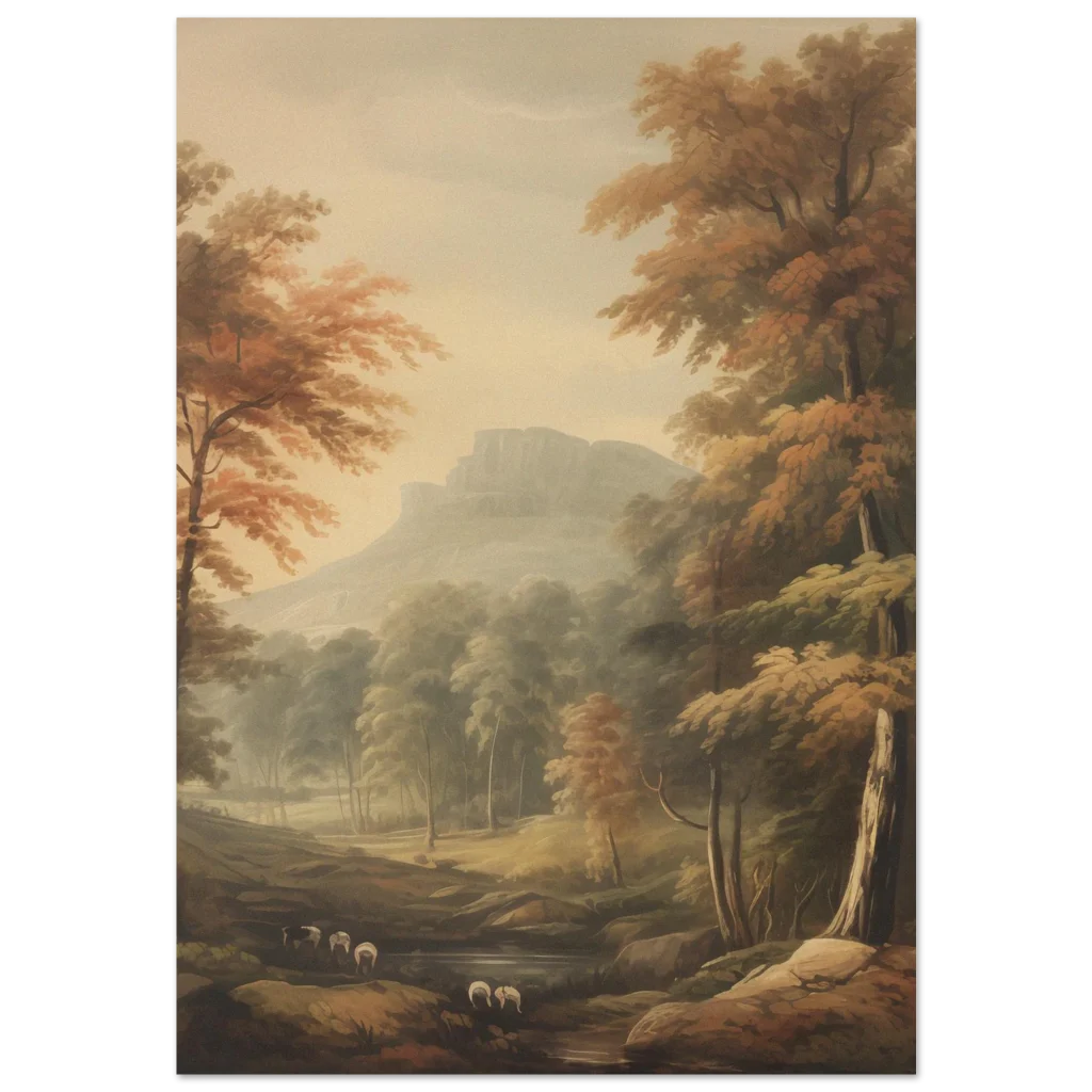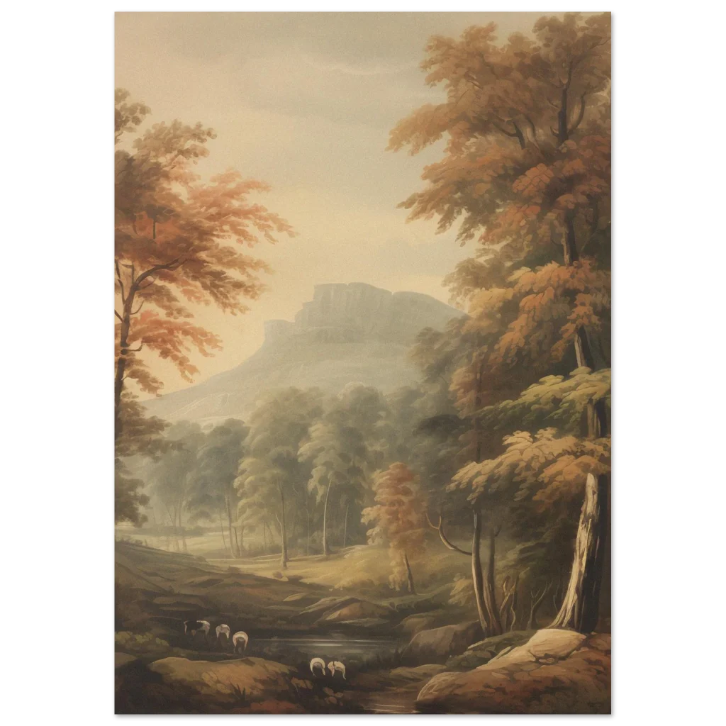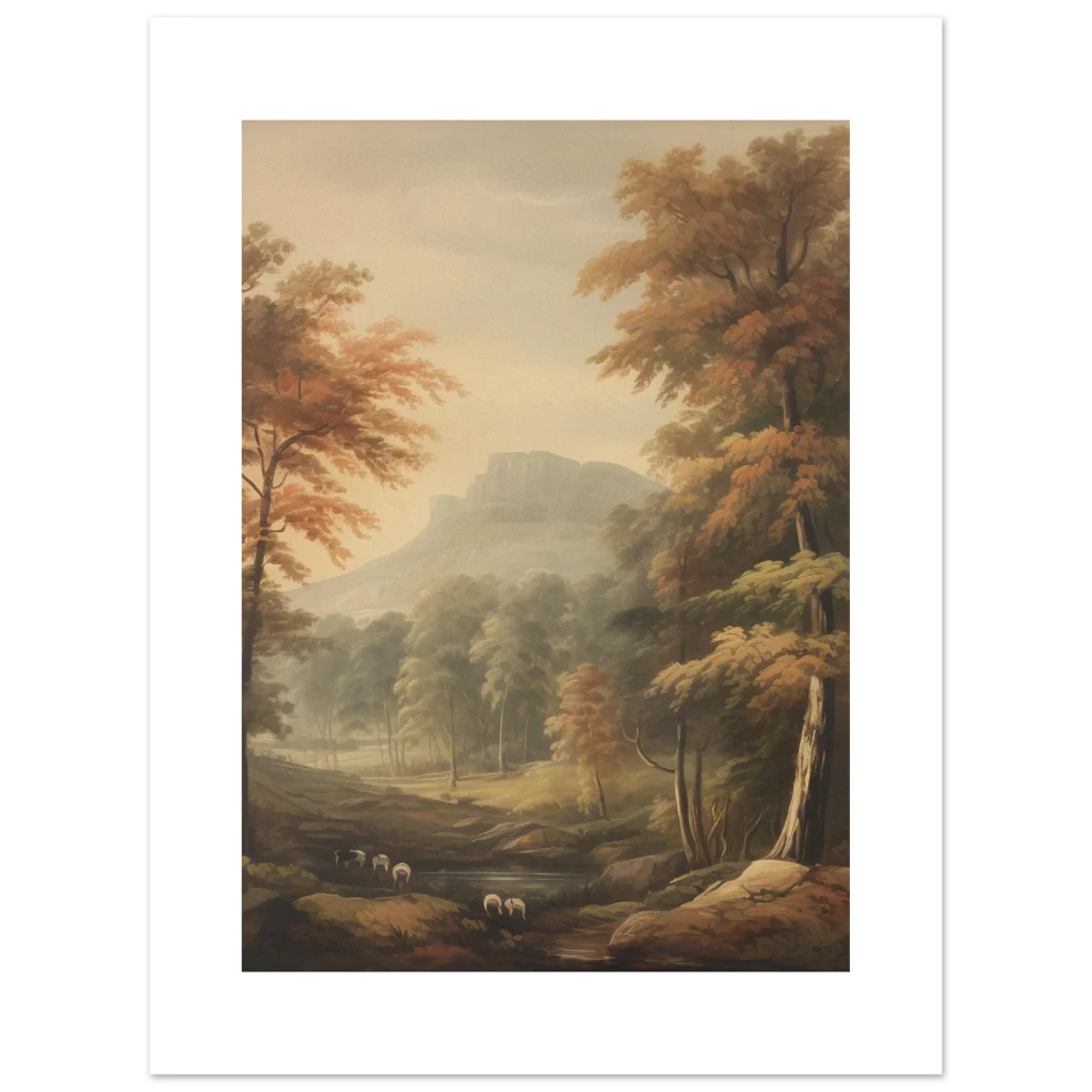 Immerse yourself in the tranquil beauty of an idyllic autumn landscape with this captivating print. Featuring a serene valley nestled among ancient trees and a majestic mountain range shrouded in mist, this artwork evokes a sense of peace and classic charm. The warm, earthy tones and soft, painterly style make it a perfect addition to any space seeking a touch of nostalgic elegance or a calming natural vista.