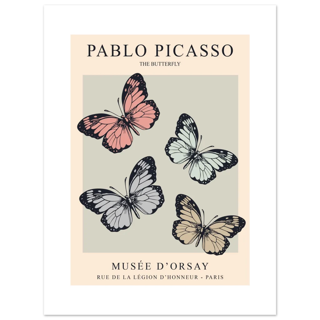 Immerse yourself in the delicate beauty of Picasso’s ‘The Butterfly’ collection, reimagined as a stunning art print. This exquisite piece, featuring a harmonious quartet of butterflies in soft, natural hues, evokes a sense of serene elegance and artistic heritage. Perfect for adding a touch of classic sophistication and natural wonder to any room, it brings the timeless allure of the Musée d’Orsay right into your home.