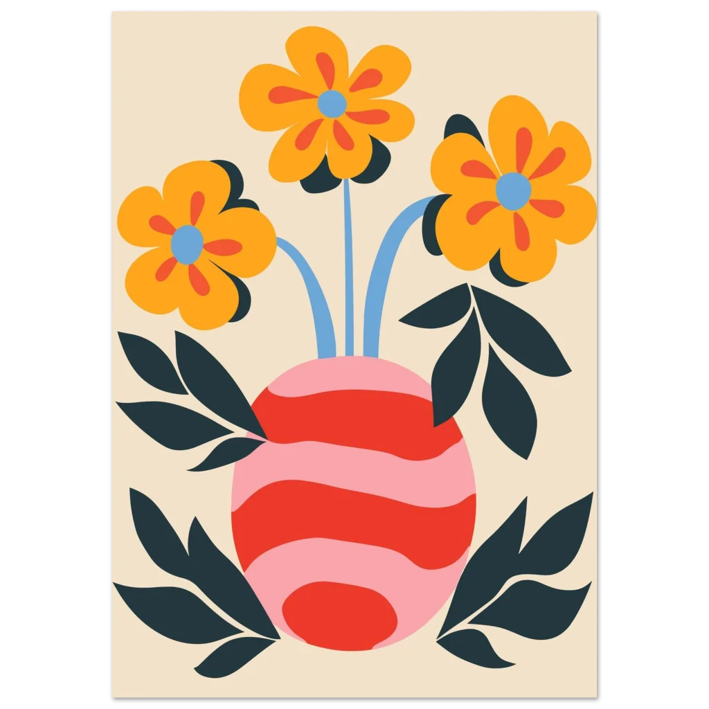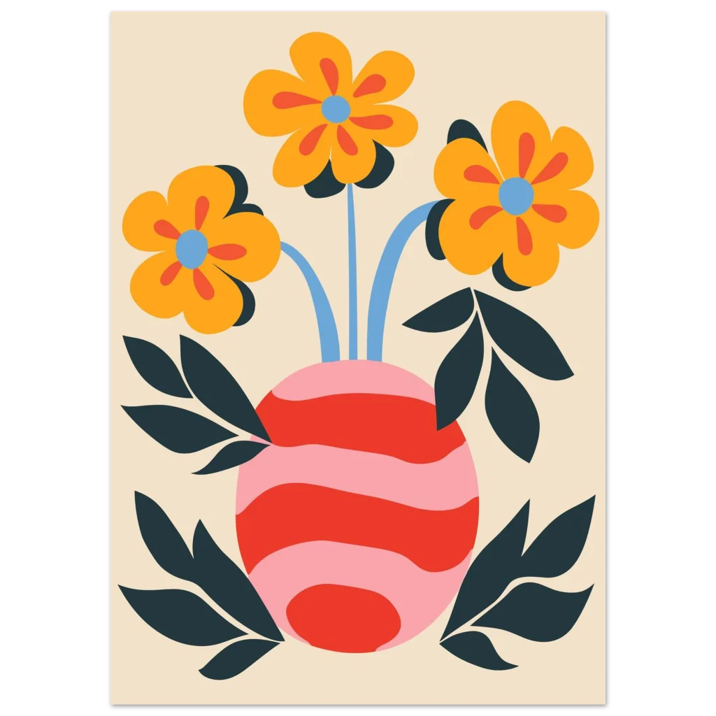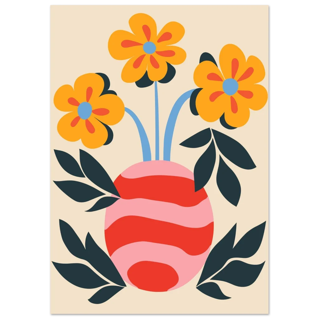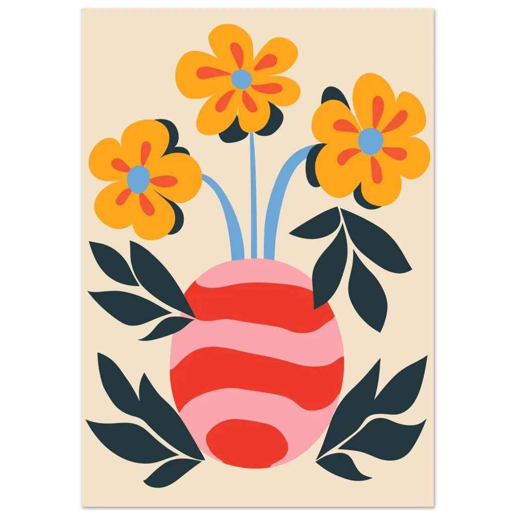 Bring a burst of playful retro charm to your walls with our ‘Retro Floral Vase’ art print. This vibrant piece captures the joyful essence of mid-century modern design with its bold yellow flowers, striking blue stems, and a cheerfully striped red and pink vase. The deep teal leaves provide a sophisticated contrast, making this poster a perfect focal point for any room that craves a touch of optimistic color and timeless style.