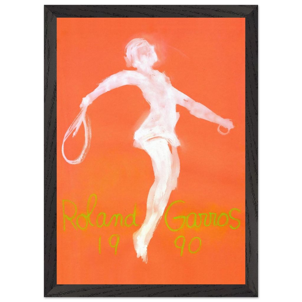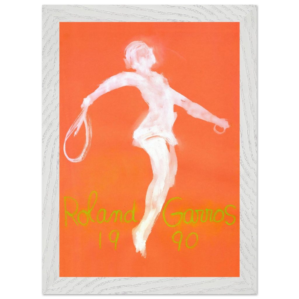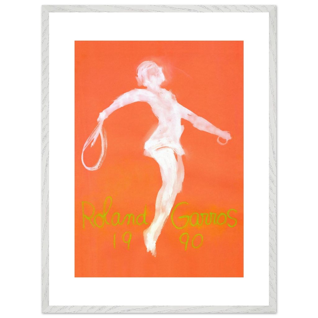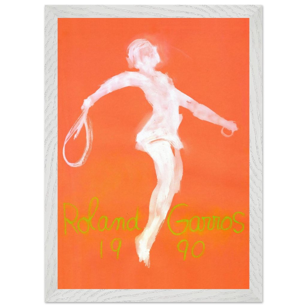 Official Roland Garros 1990 Poster by abstract expressionist John Christoforou. This striking vintage tennis art features a dynamic white player figure against a vibrant orange background, perfectly capturing the raw energy of the French Open. A must-have for tennis enthusiasts and vintage sports collectors. Add artistic flair and tennis history to your décor!
