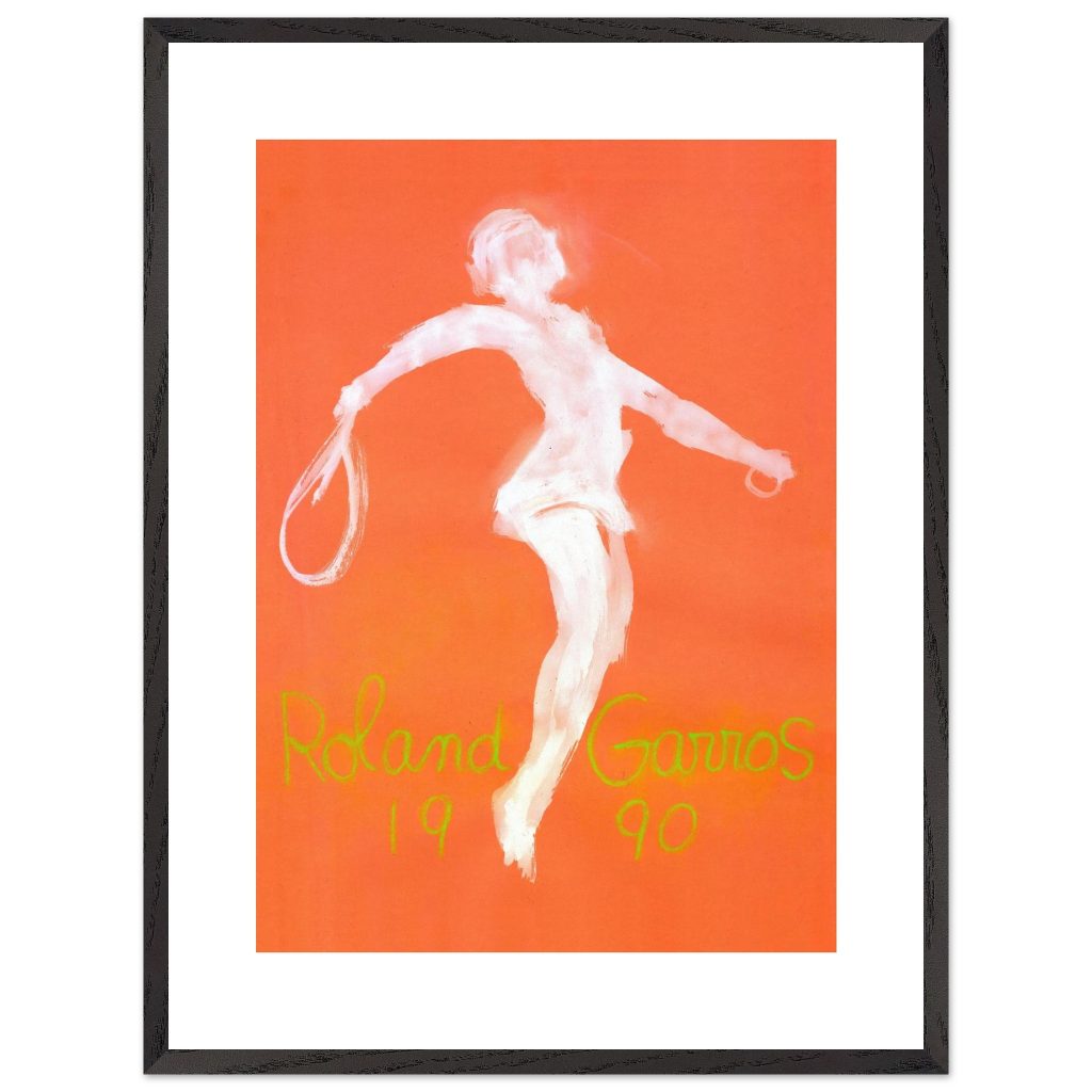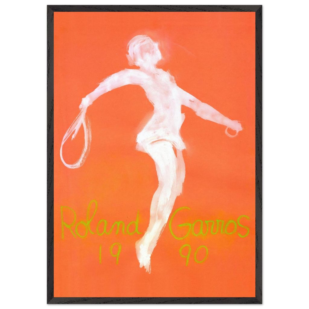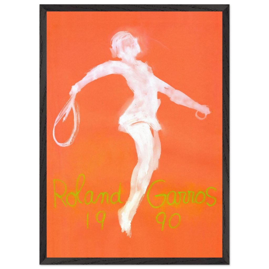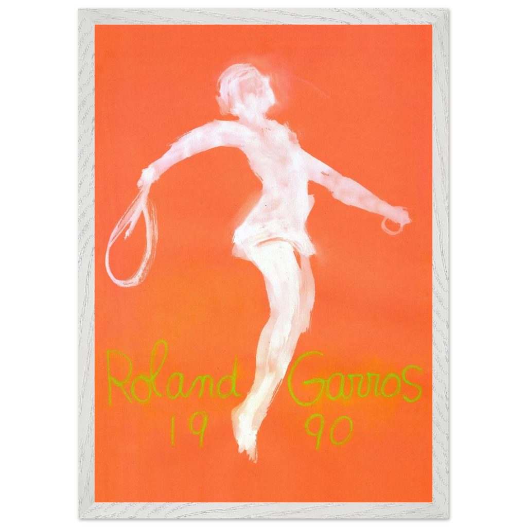 Official Roland Garros 1990 Poster by abstract expressionist John Christoforou. This striking vintage tennis art features a dynamic white player figure against a vibrant orange background, perfectly capturing the raw energy of the French Open. A must-have for tennis enthusiasts and vintage sports collectors. Add artistic flair and tennis history to your décor!