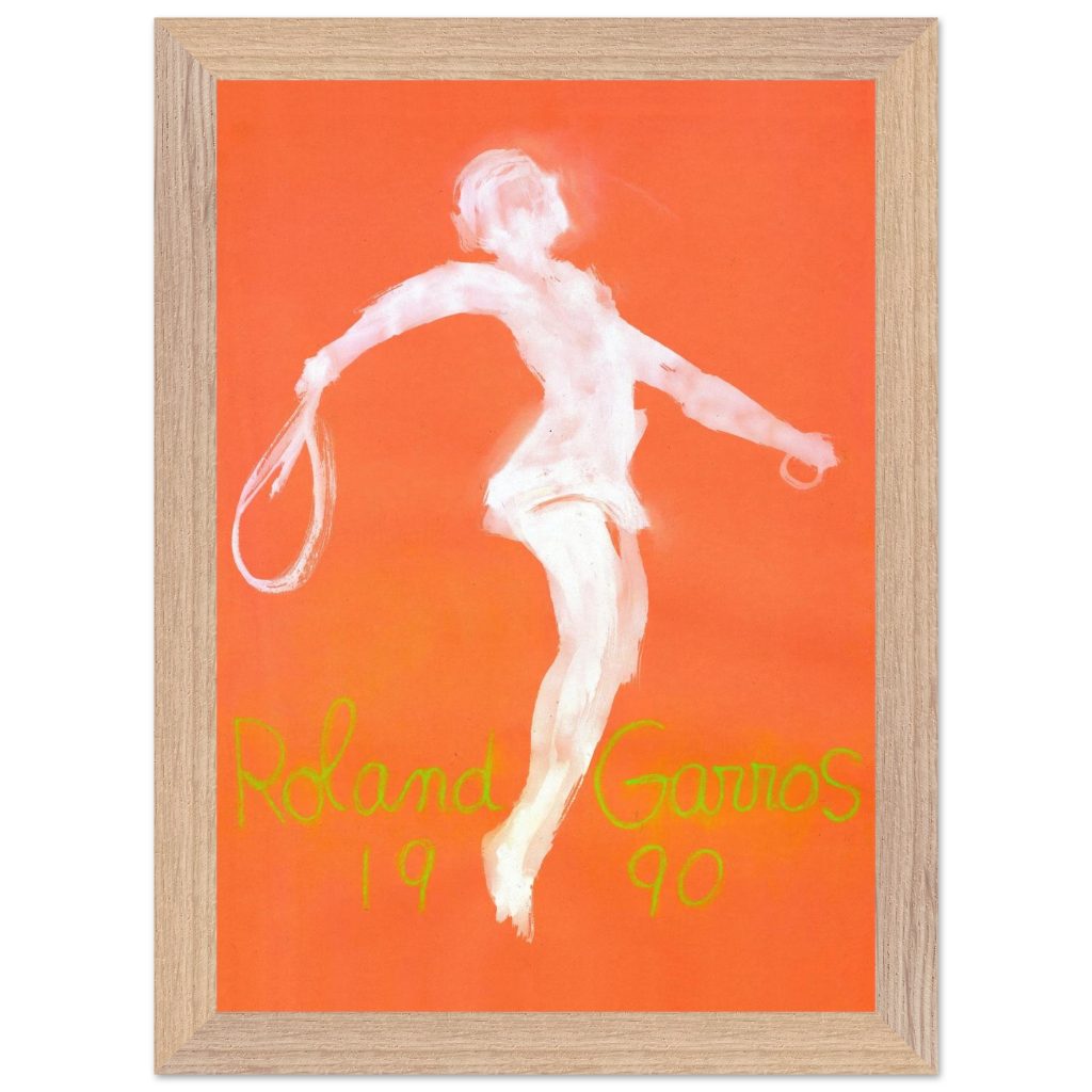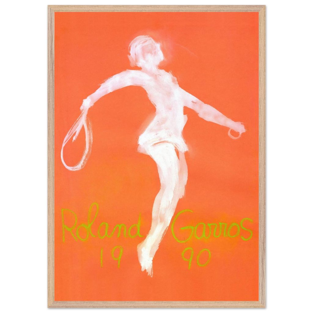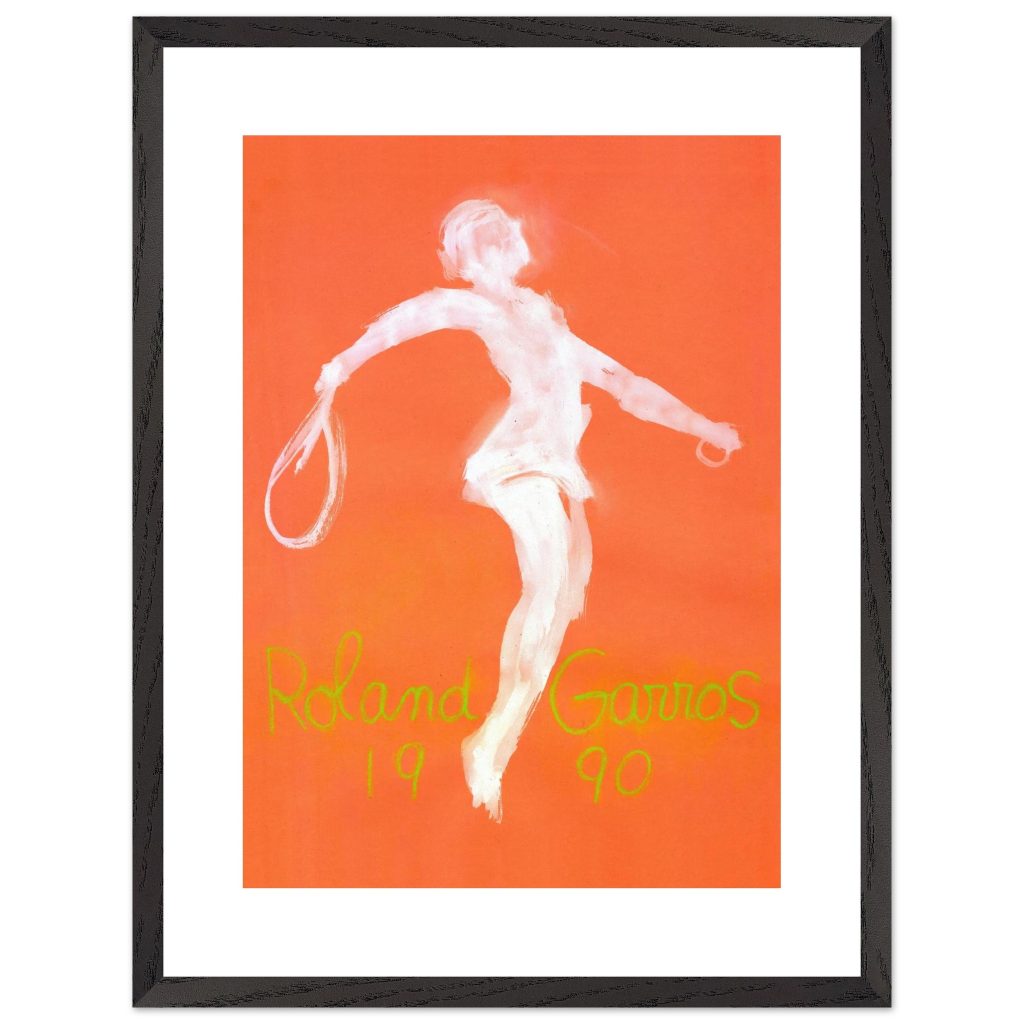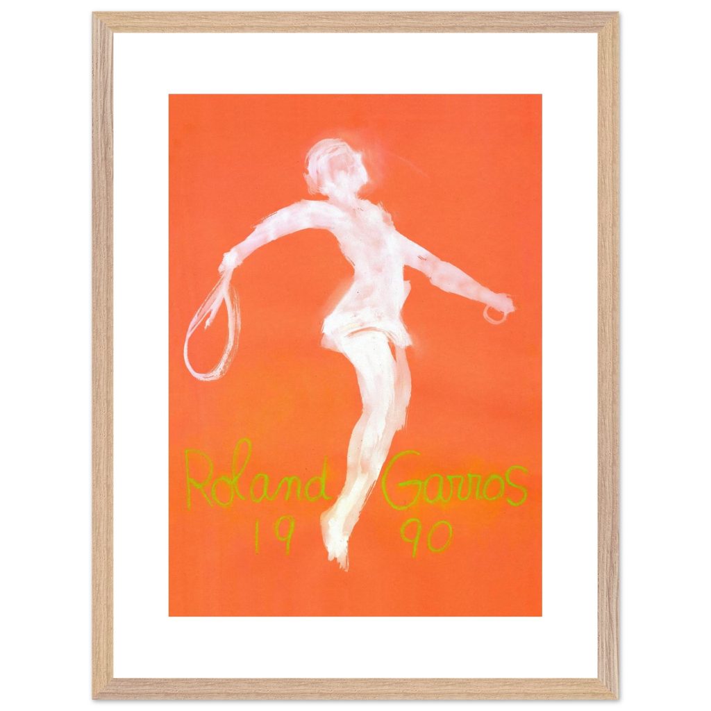 Official Roland Garros 1990 Poster by abstract expressionist John Christoforou. This striking vintage tennis art features a dynamic white player figure against a vibrant orange background, perfectly capturing the raw energy of the French Open. A must-have for tennis enthusiasts and vintage sports collectors. Add artistic flair and tennis history to your décor!