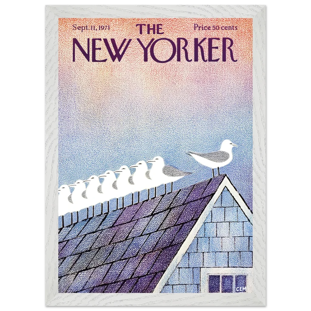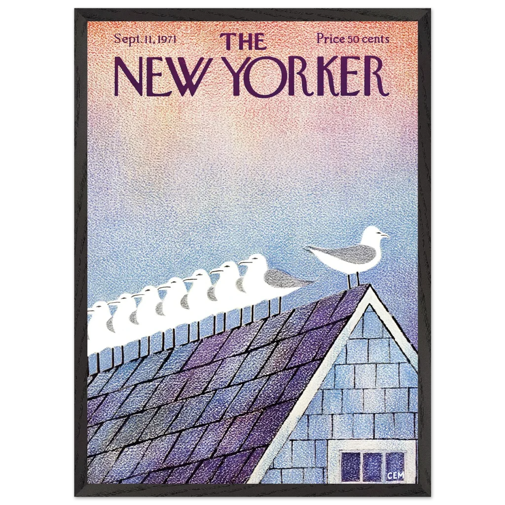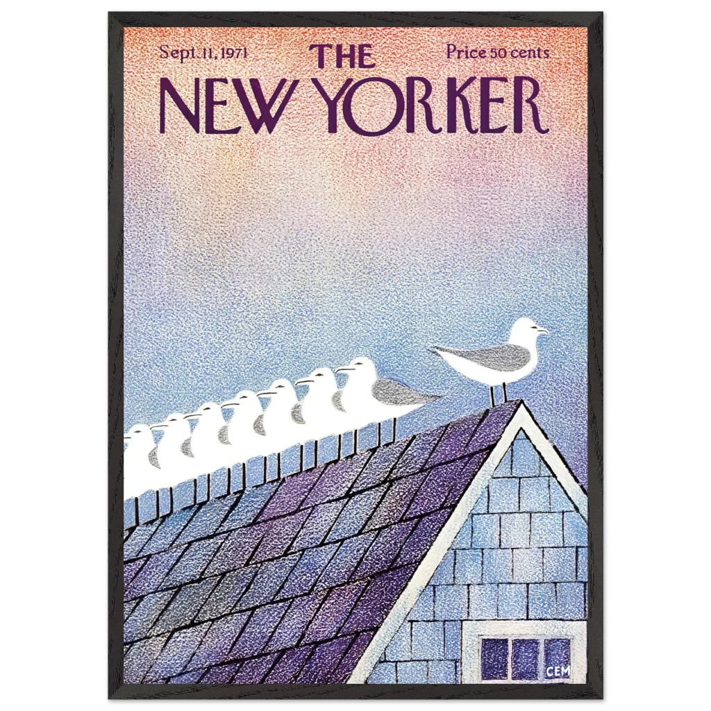 Capture the timeless charm of a serene seaside moment with our premium framed poster featuring the iconic September 11, 1971, ‘The New Yorker’ cover. This vintage masterpiece, with its gentle color palette and whimsical line of seagulls perched on a shingled roof, brings a touch of nostalgic elegance and coastal tranquility to any room. Perfect for art collectors, lovers of classic illustration, or anyone looking to infuse their space with a calm, sophisticated vibe.