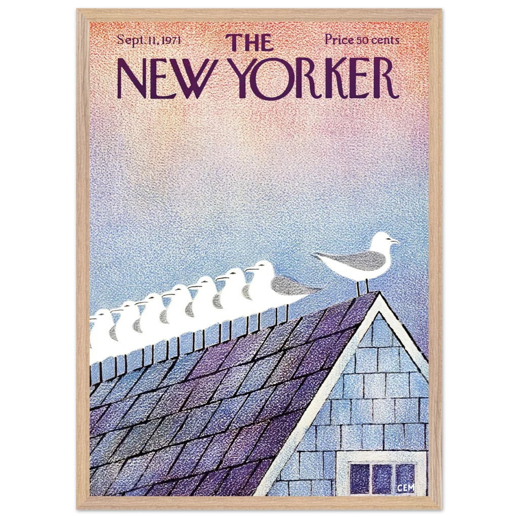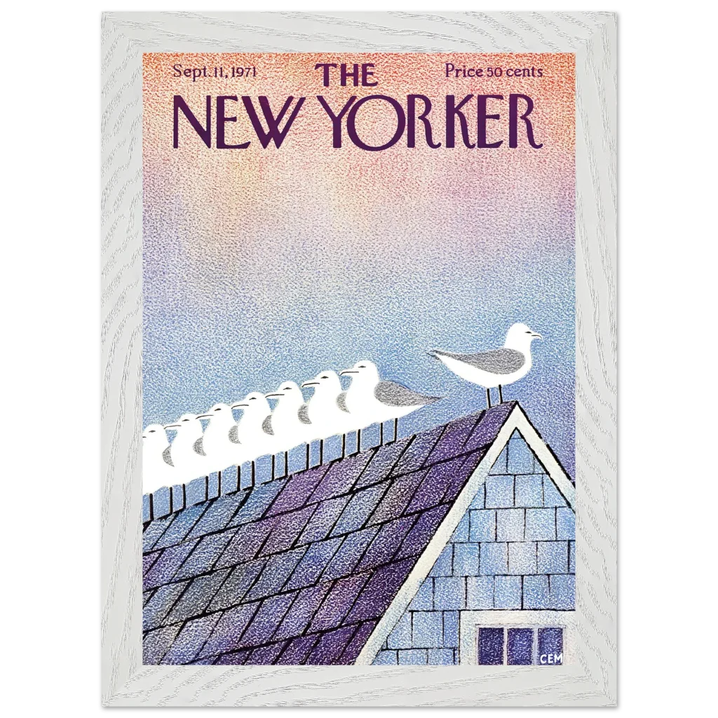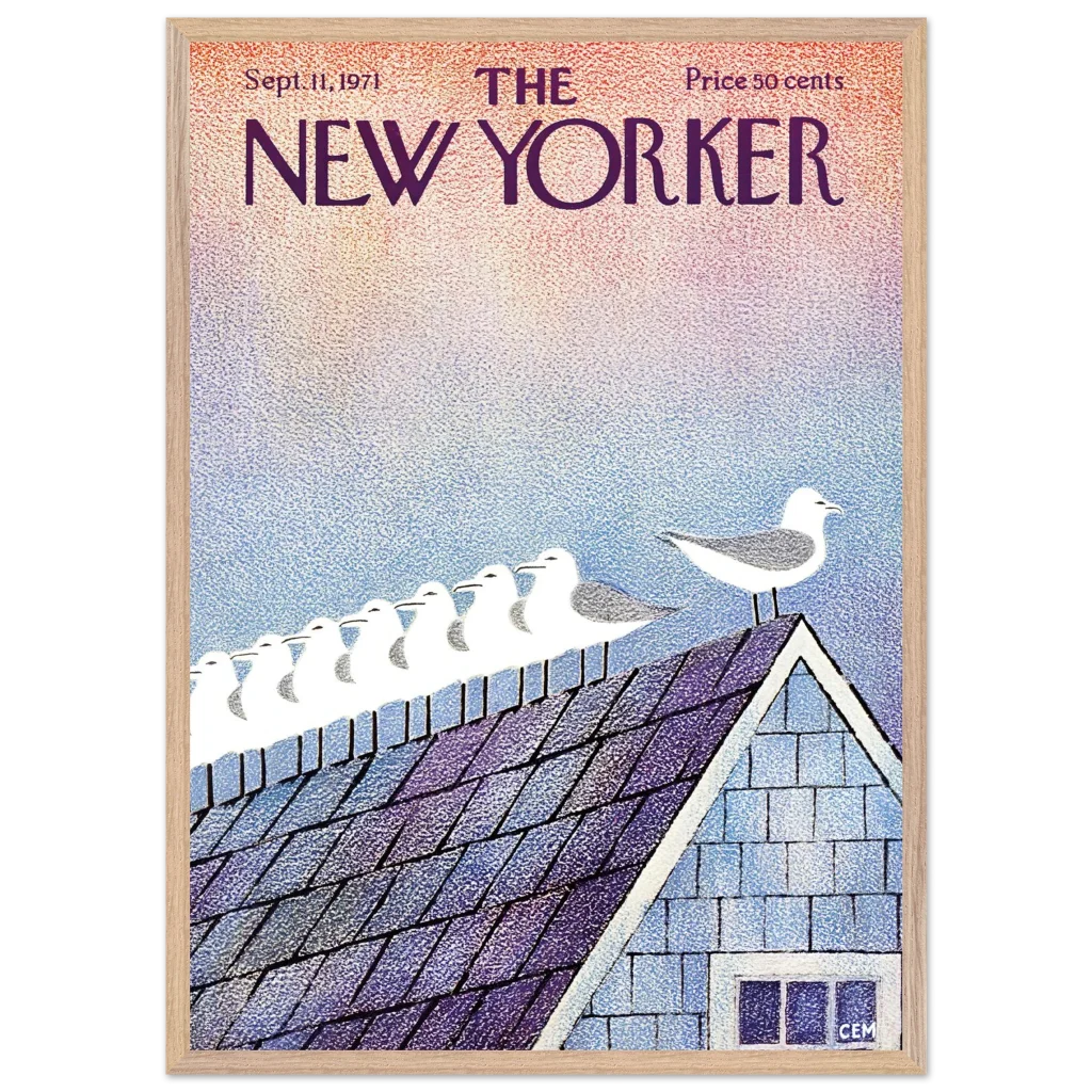 Capture the timeless charm of a serene seaside moment with our premium framed poster featuring the iconic September 11, 1971, ‘The New Yorker’ cover. This vintage masterpiece, with its gentle color palette and whimsical line of seagulls perched on a shingled roof, brings a touch of nostalgic elegance and coastal tranquility to any room. Perfect for art collectors, lovers of classic illustration, or anyone looking to infuse their space with a calm, sophisticated vibe.