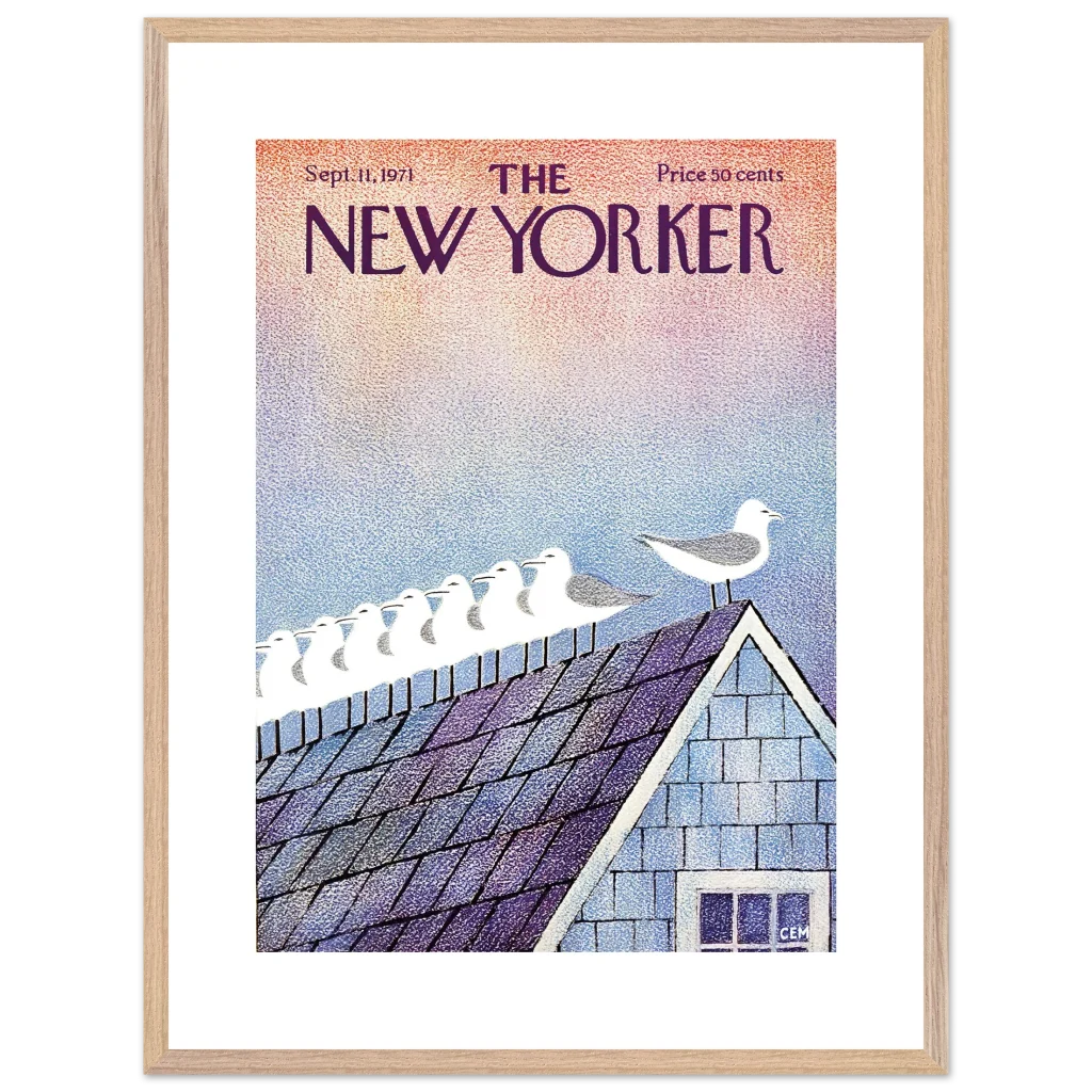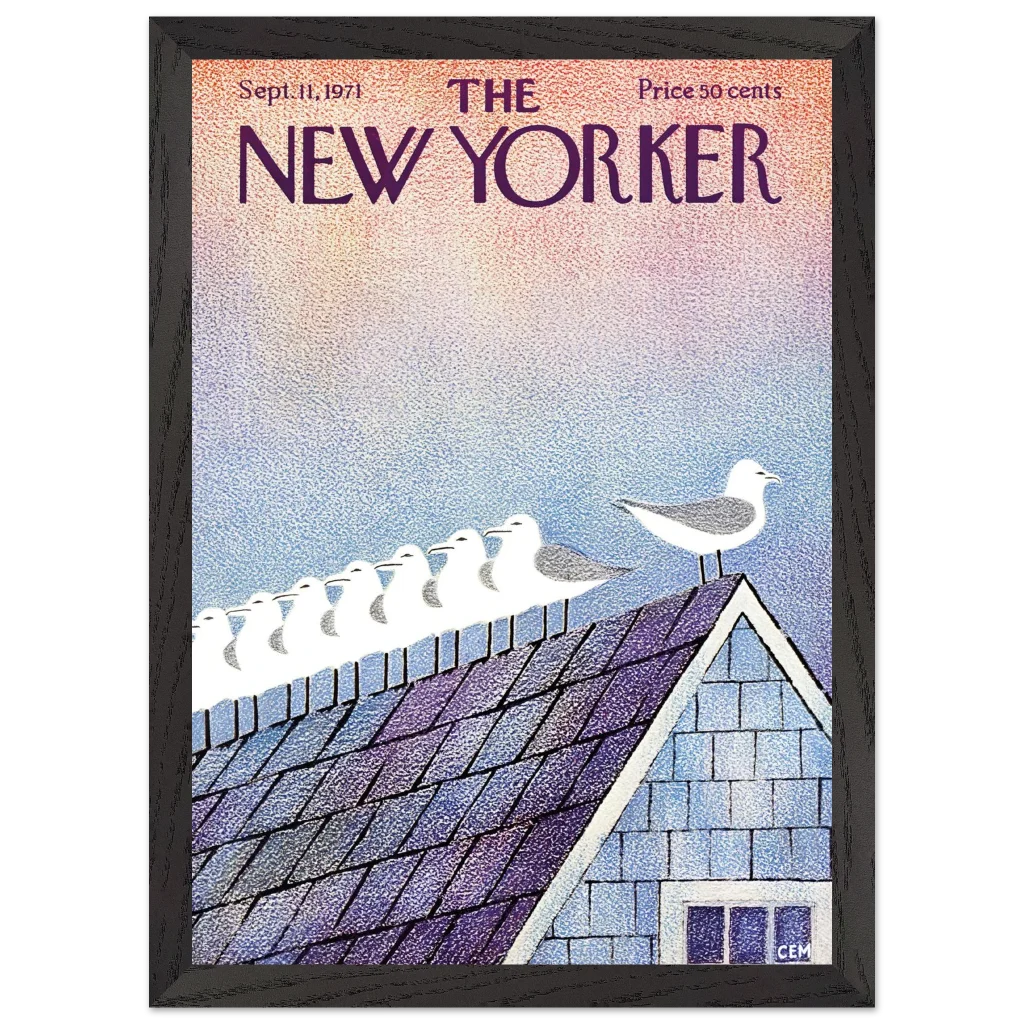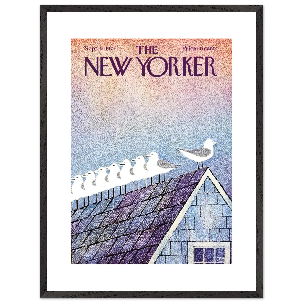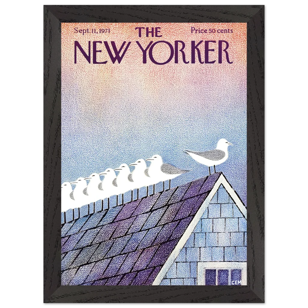 Capture the timeless charm of a New England autumn with our exquisite framed poster featuring the iconic September 11, 1971, ‘The New Yorker’ cover. This captivating illustration, with its serene gradient sky and a row of elegant gulls perched on a quaint shingled roof, evokes a sense of calm and classic American artistry. Perfect for adding a touch of vintage sophistication and coastal elegance to any space, this piece is a conversation starter and a nod to a bygone era of design.