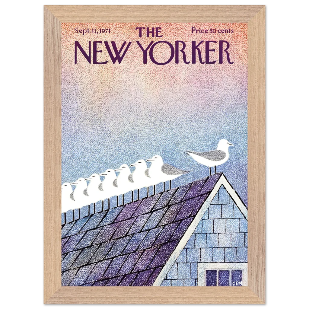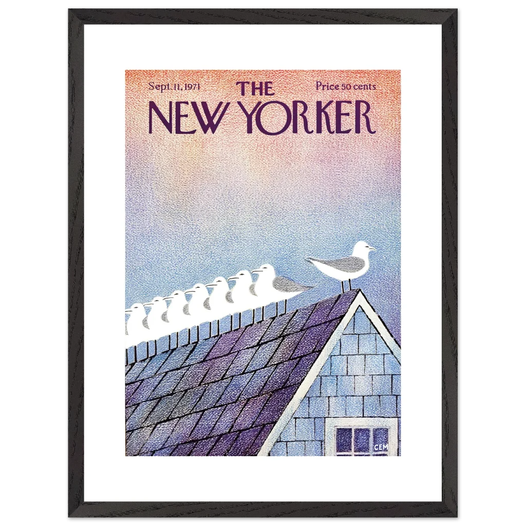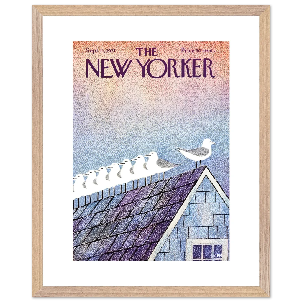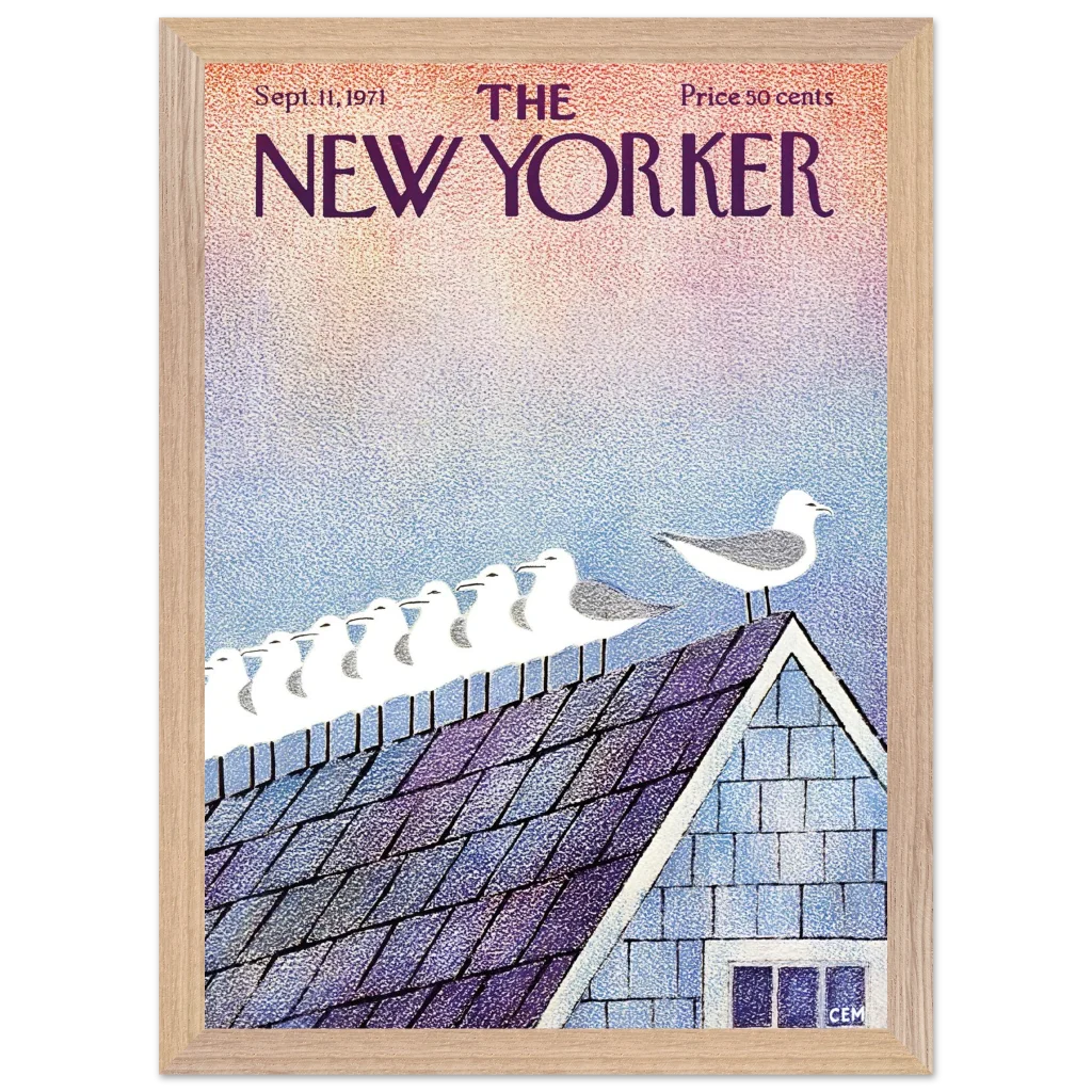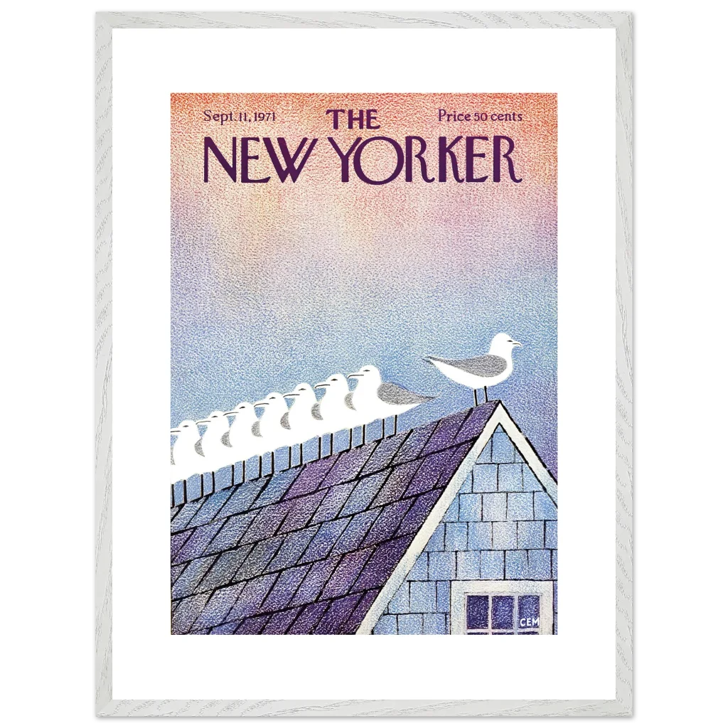 Capture the timeless charm of a New England autumn with our exquisite framed poster featuring the iconic September 11, 1971, ‘The New Yorker’ cover. This captivating illustration, with its serene gradient sky and a row of elegant gulls perched on a quaint shingled roof, evokes a sense of calm and classic American artistry. Perfect for adding a touch of vintage sophistication and coastal elegance to any space, this piece is a conversation starter and a nod to a bygone era of design.