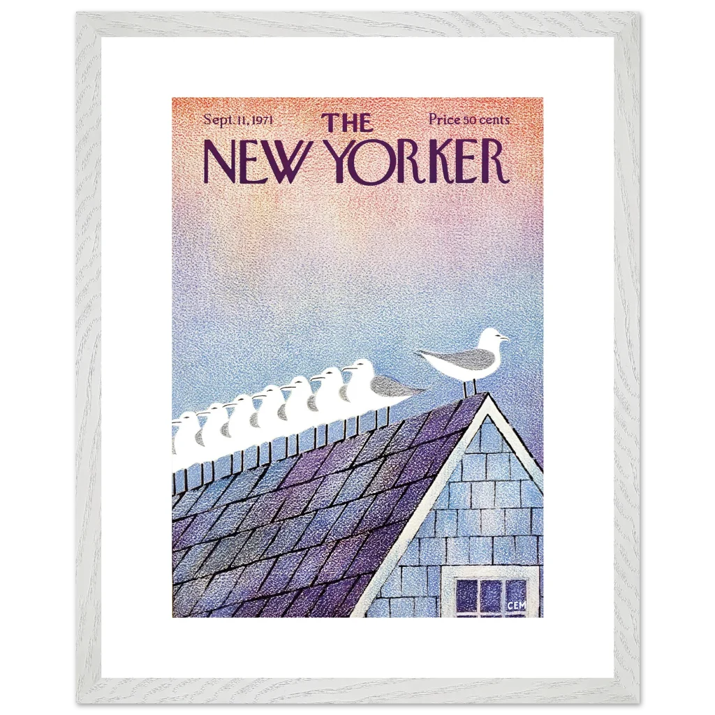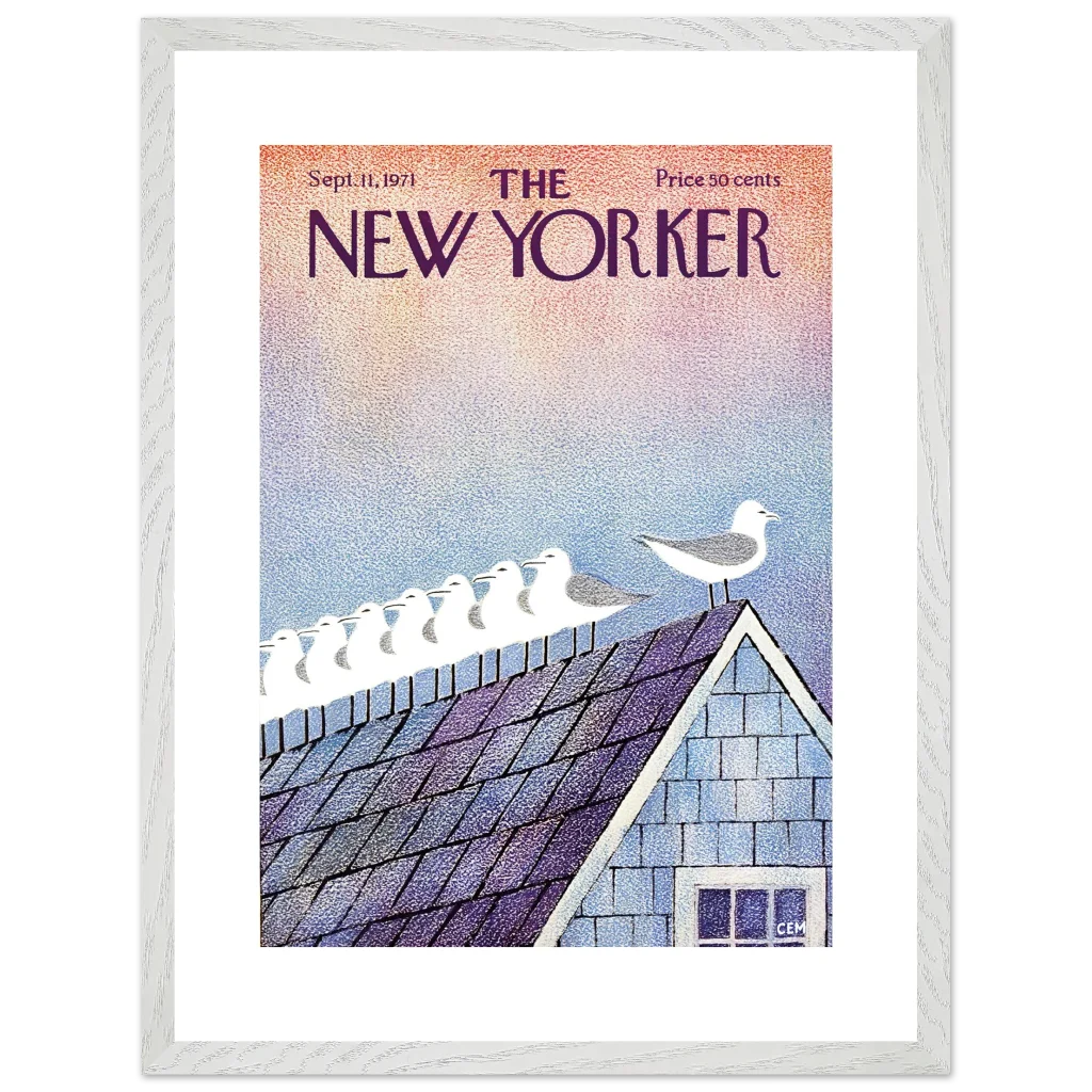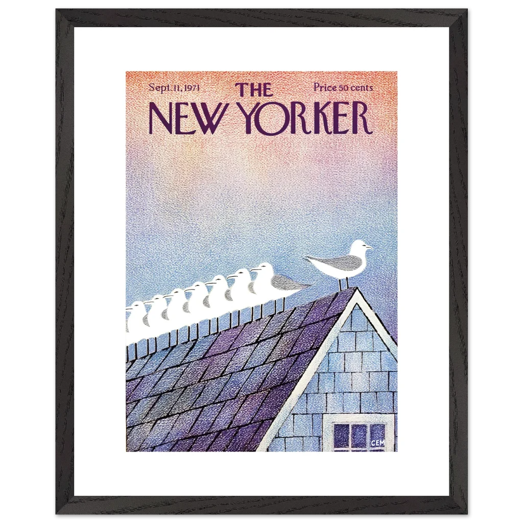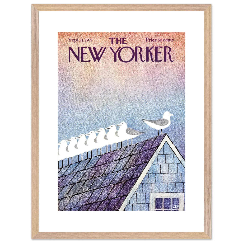 Capture the timeless charm of a New England autumn with our exquisite framed poster featuring the iconic September 11, 1971, ‘The New Yorker’ cover. This captivating illustration, with its serene gradient sky and a row of elegant gulls perched on a quaint shingled roof, evokes a sense of calm and classic American artistry. Perfect for adding a touch of vintage sophistication and coastal elegance to any space, this piece is a conversation starter and a nod to a bygone era of design.