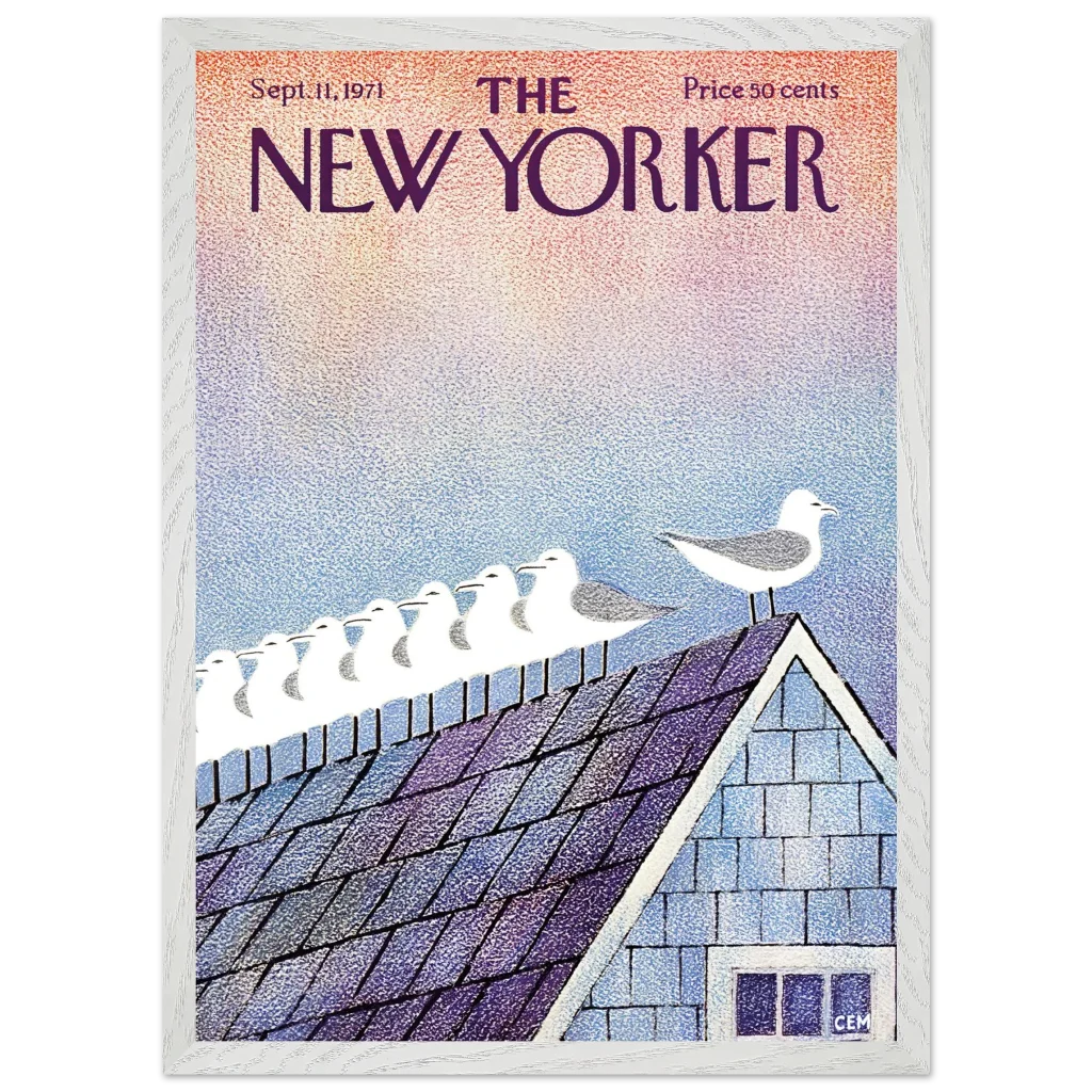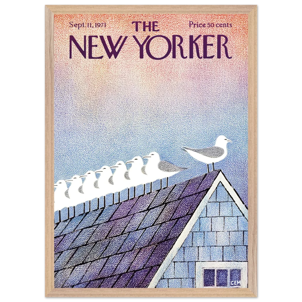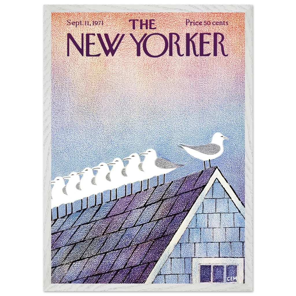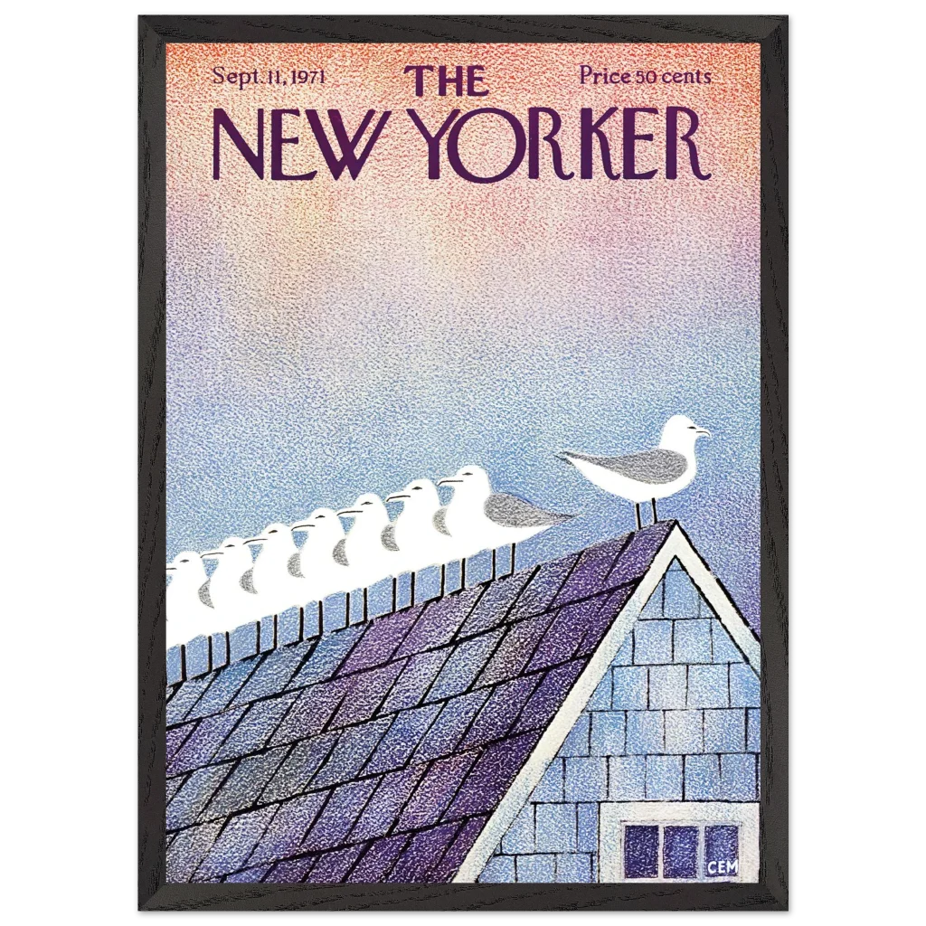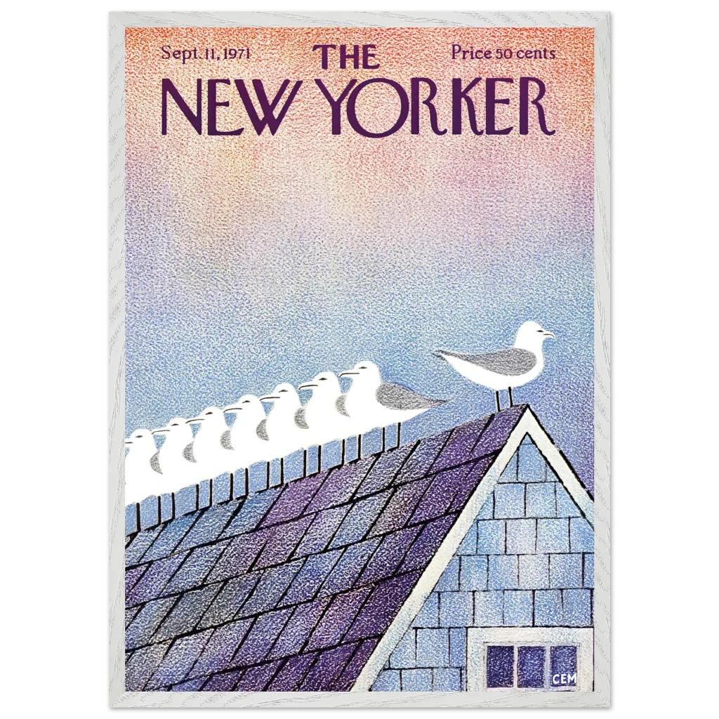 Capture the timeless charm of a New England autumn with our exquisite framed poster featuring the iconic September 11, 1971, ‘The New Yorker’ cover. This captivating illustration, with its serene gradient sky and a row of elegant gulls perched on a quaint shingled roof, evokes a sense of calm and classic American artistry. Perfect for adding a touch of vintage sophistication and coastal elegance to any space, this piece is a conversation starter and a nod to a bygone era of design.