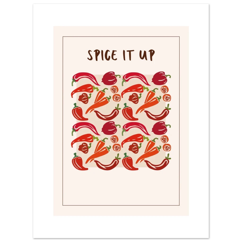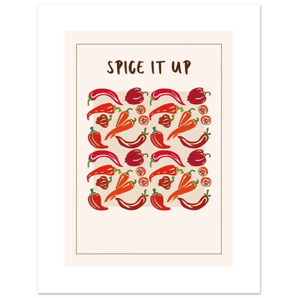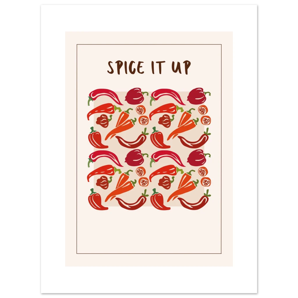 Infuse your space with a vibrant kick! Our “Spice It Up” poster brings a playful yet stylish energy, showcasing an array of peppers in rich reds and warm oranges that pop against a clean, contemporary background. Perfect for kitchen decor, dining areas, or adding a touch of bold personality to any room, this artwork celebrates zest and flavor in every detail.