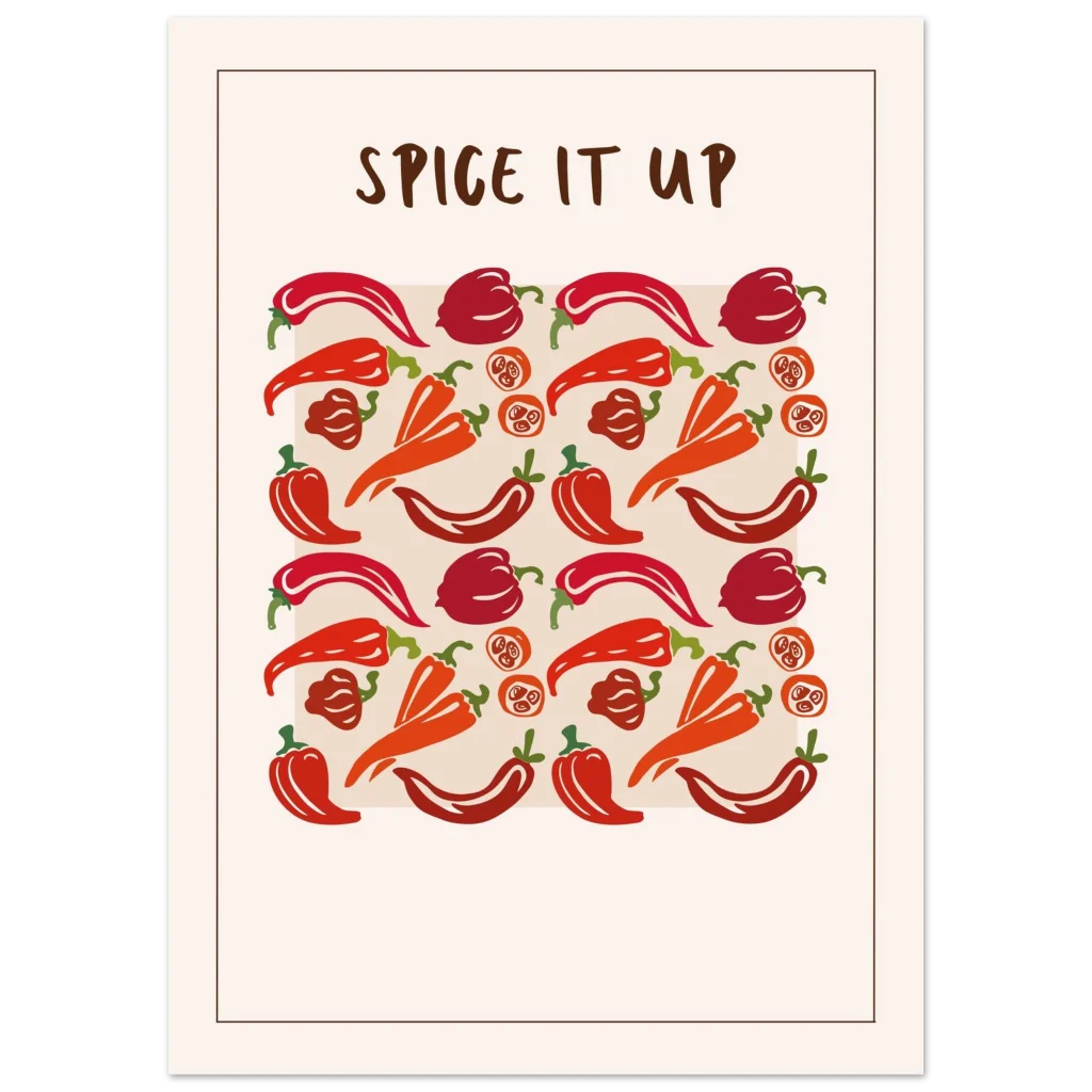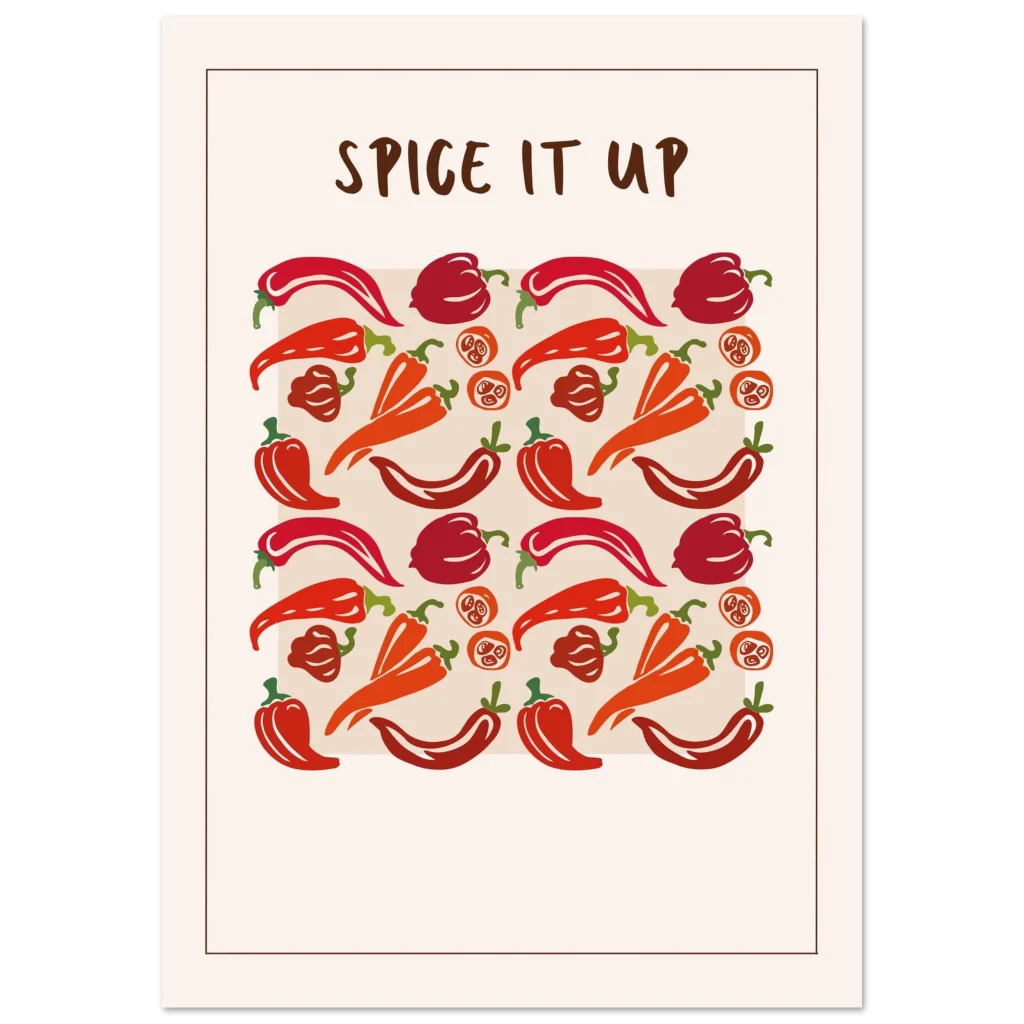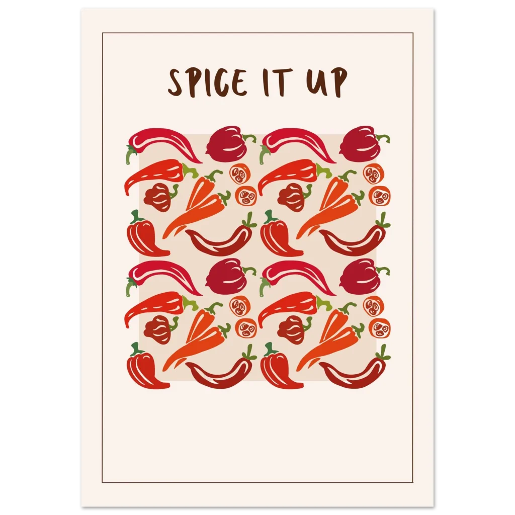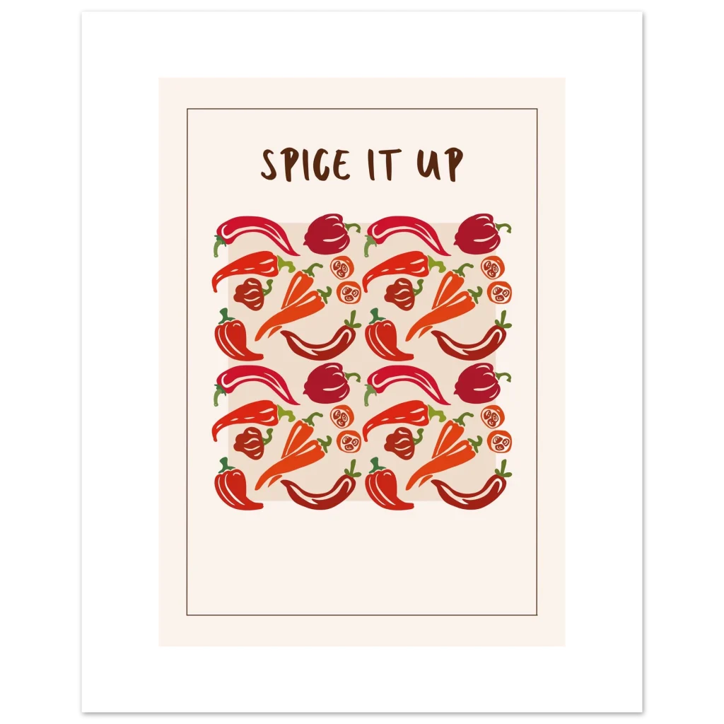 Infuse your space with a vibrant kick! Our “Spice It Up” poster brings a playful yet stylish energy, showcasing an array of peppers in rich reds and warm oranges that pop against a clean, contemporary background. Perfect for kitchen decor, dining areas, or adding a touch of bold personality to any room, this artwork celebrates zest and flavor in every detail.
