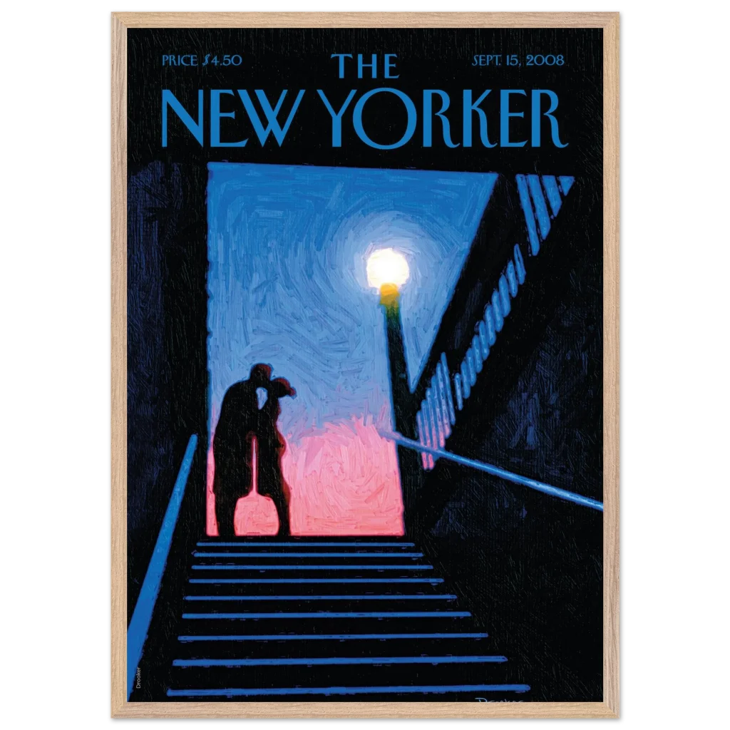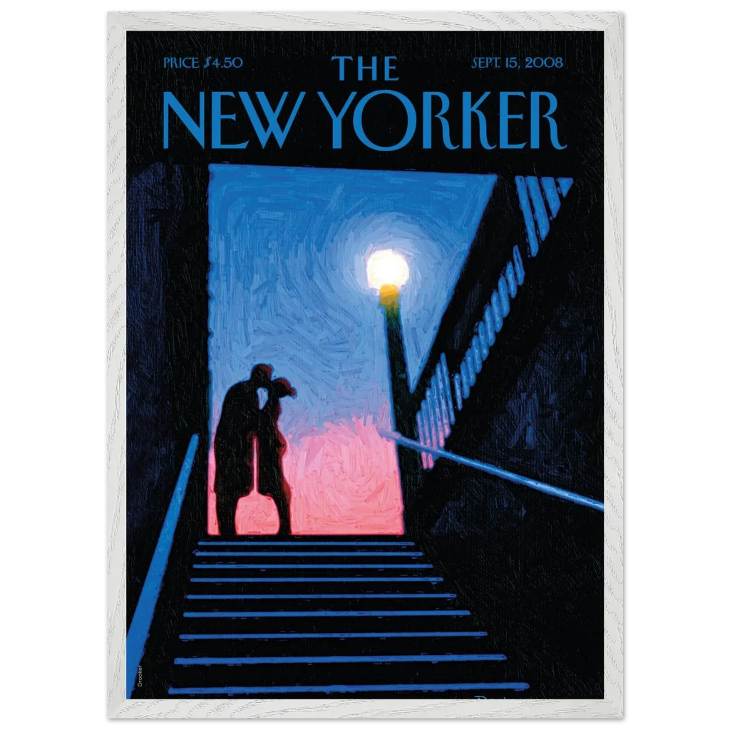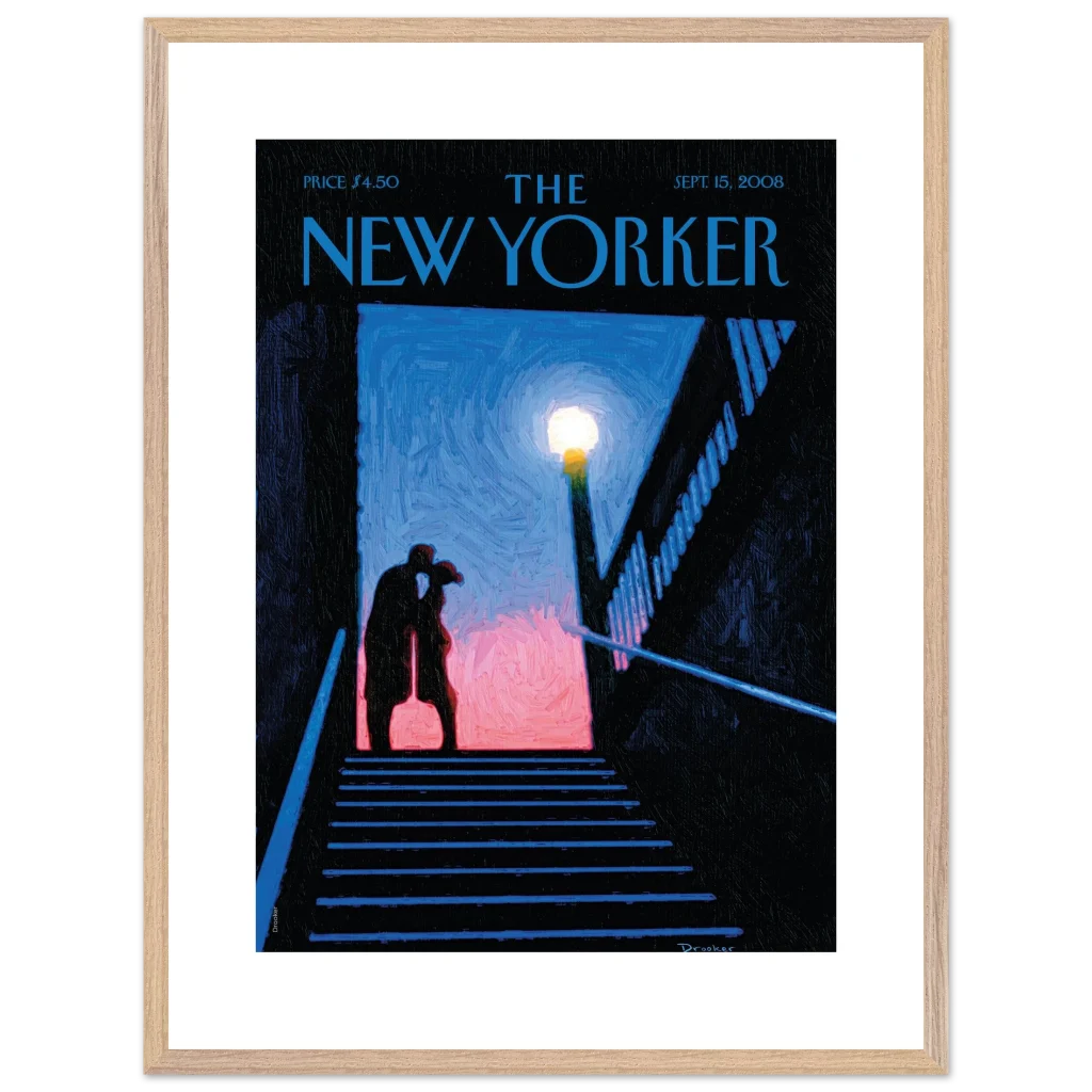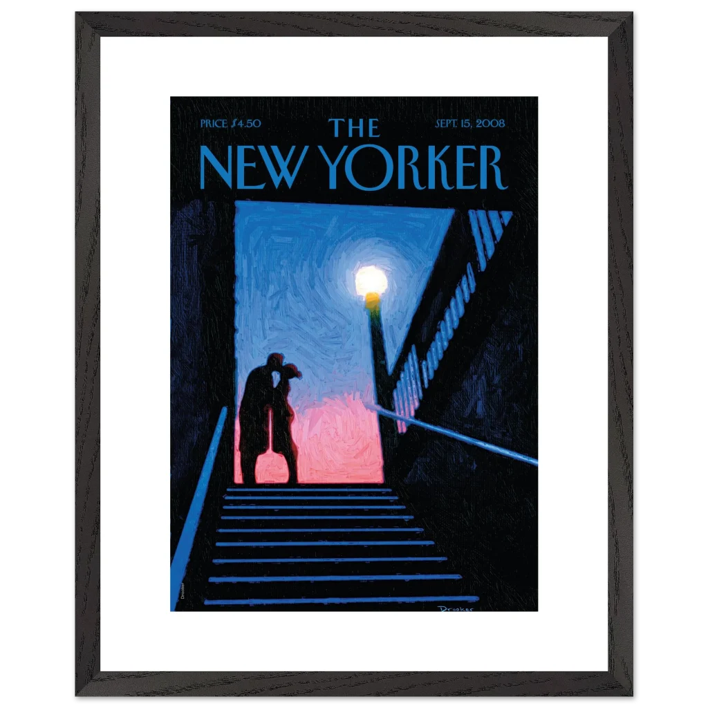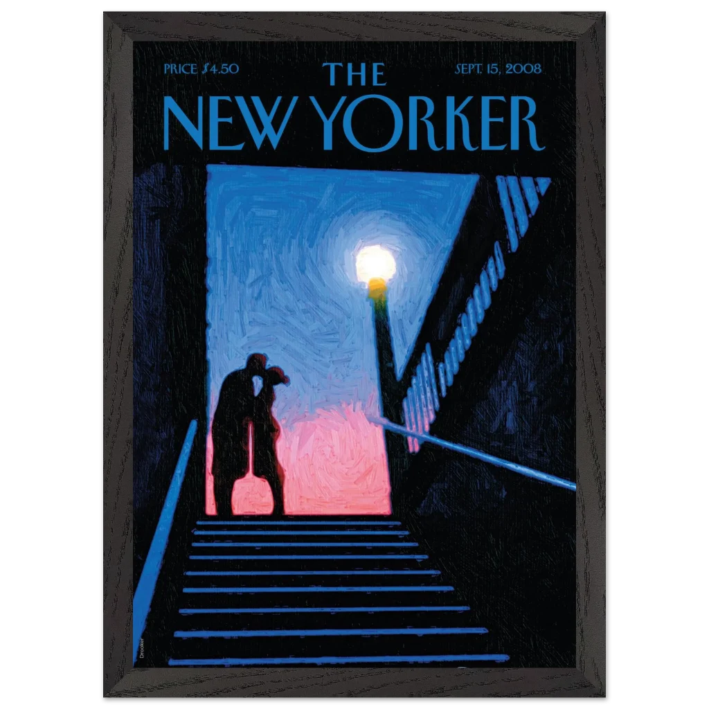 Capture a moment of intimate urban romance with our “Stairwell Kiss” framed poster, featuring the evocative artistry from a classic New Yorker cover. This piece radiates a sophisticated, almost painterly charm, with its deep blues, soft pinks, and the warm glow of a street lamp illuminating a tender embrace. It’s an ideal choice for adding a touch of classic New York allure and sentimental beauty to any living space, evoking a sense of nostalgic connection and timeless affection.