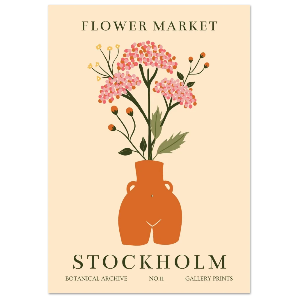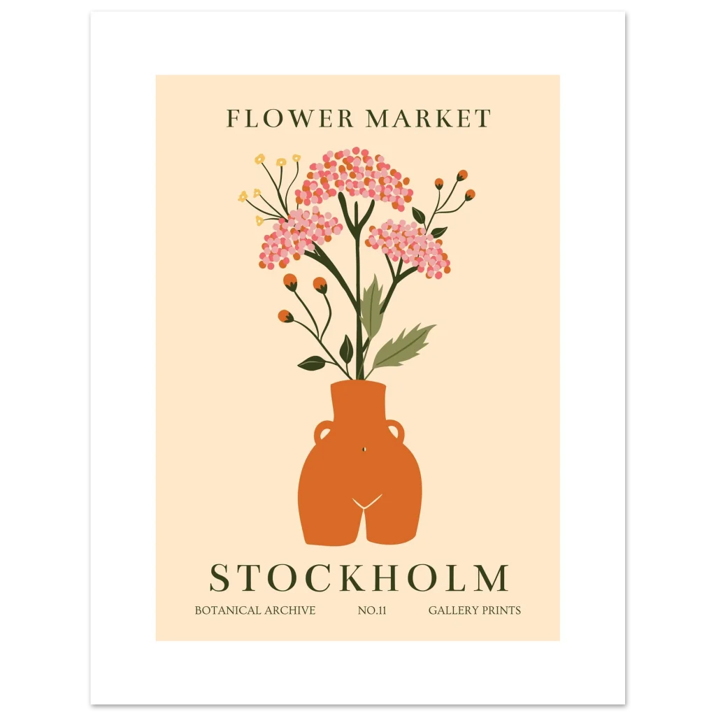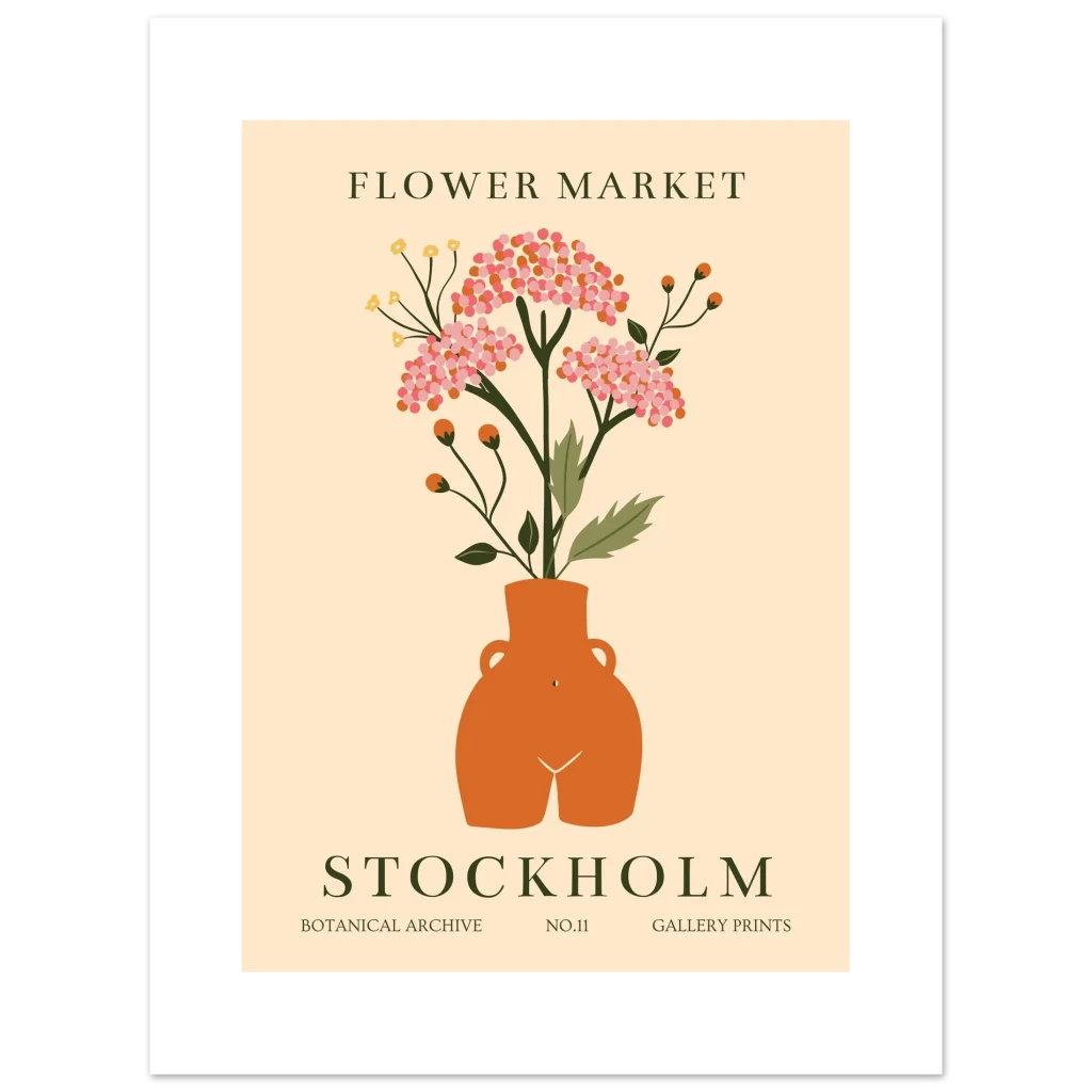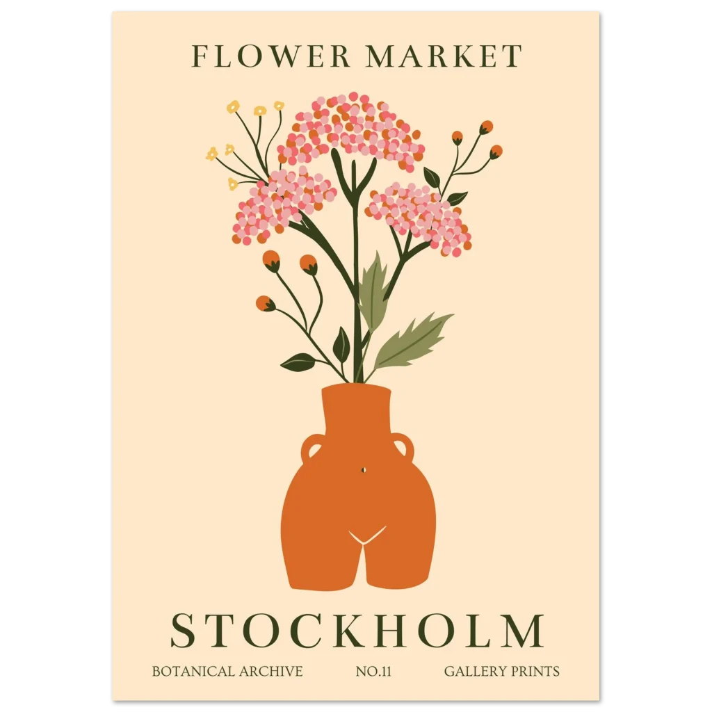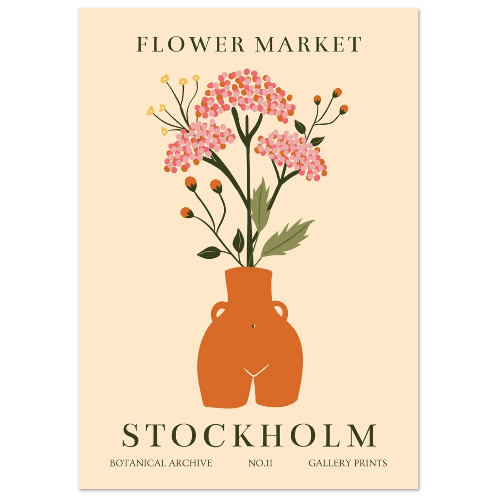 Bring the charming allure of a Stockholm ‘Flower Market’ into your home with this beautiful botanical archival print. Featuring a playful, abstract illustration of vibrant blossoms in a rustic terracotta-toned vase against a soft, creamy background, this piece radiates a warm, inviting, and slightly whimsical mood perfect for adding a touch of Scandinavian-inspired nature to any room.