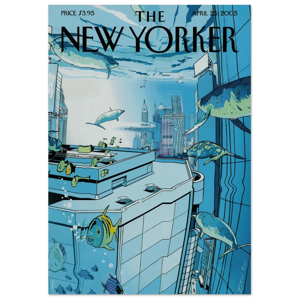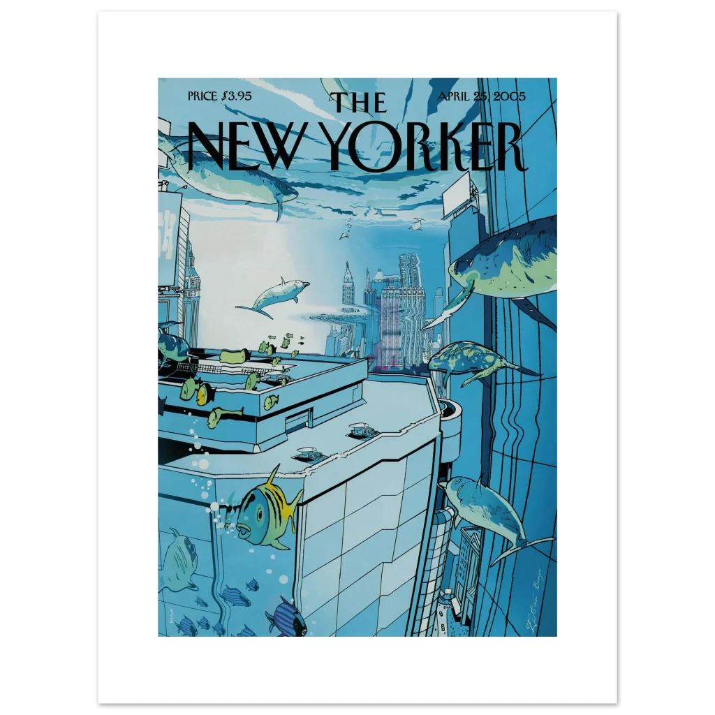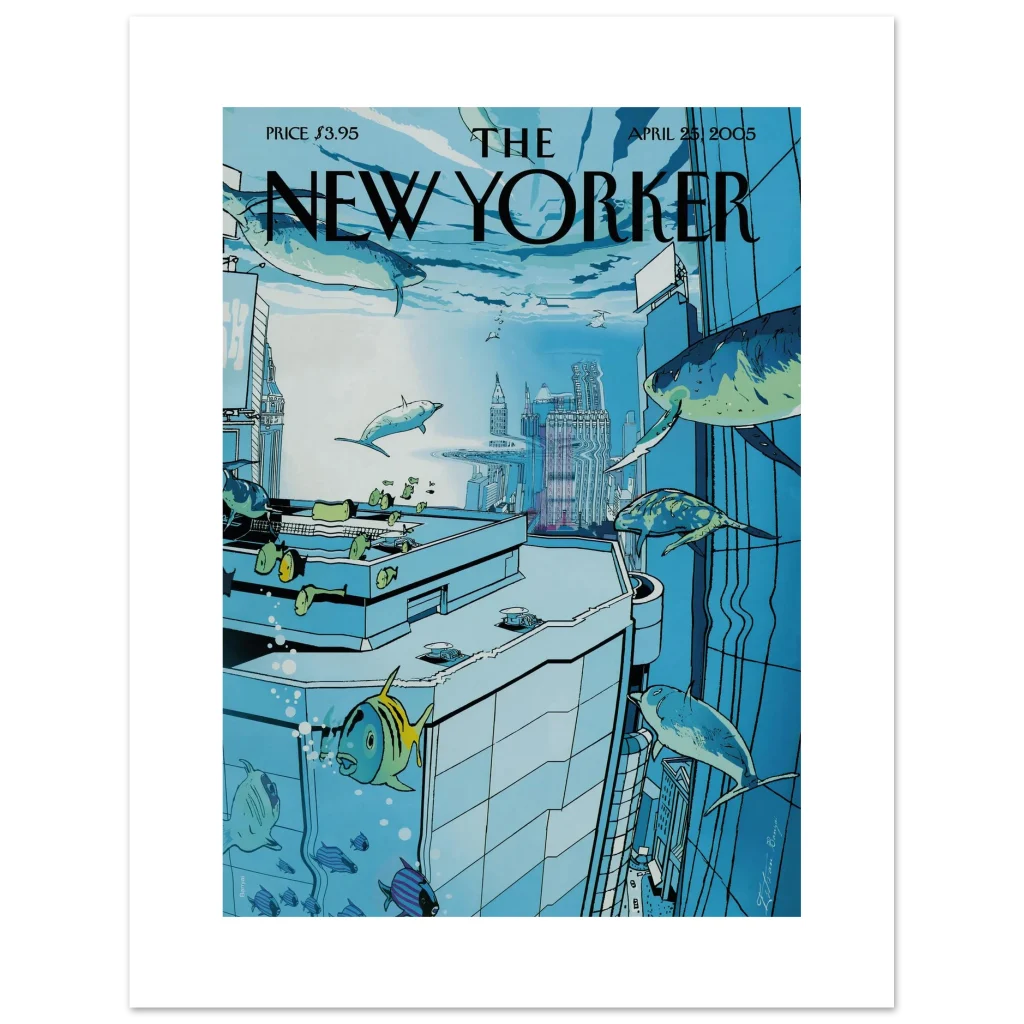 Dive into a world where city meets sea with our exclusive Submerged Cityscape art print. This captivating artwork, reminiscent of a classic magazine cover, features a vibrant underwater metropolis, complete with whimsical fish, dolphins, and sharks navigating skyscraper canyons. The dominant cool blue and turquoise palette evokes a sense of serene mystery and playful fantasy, making it a perfect statement piece for any modern or eclectic decor.