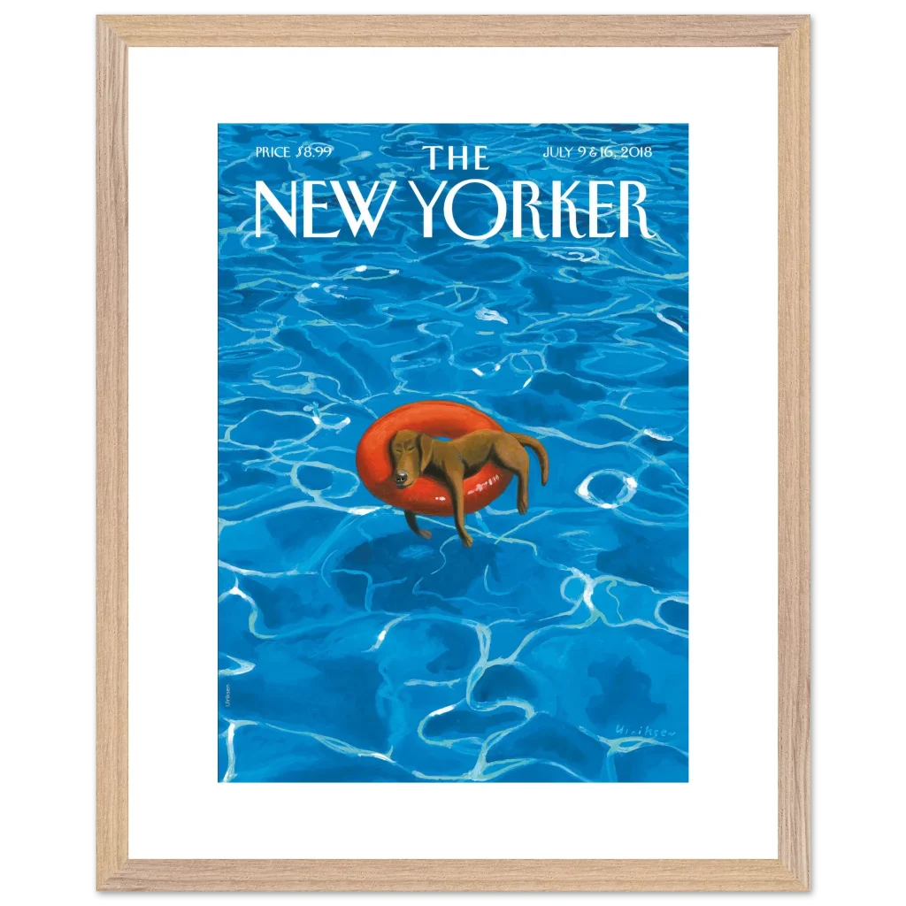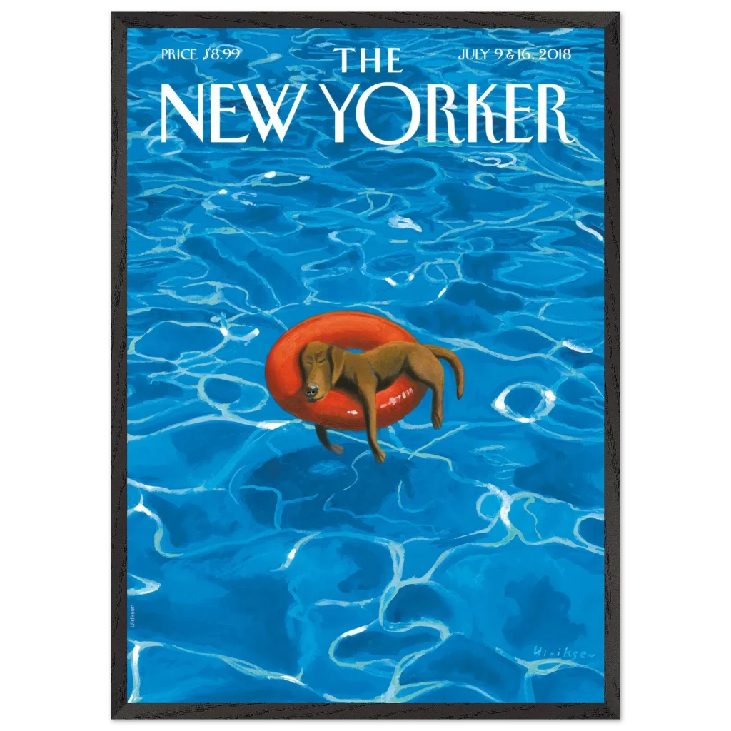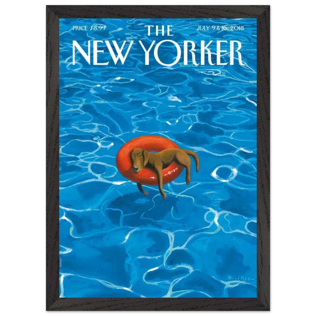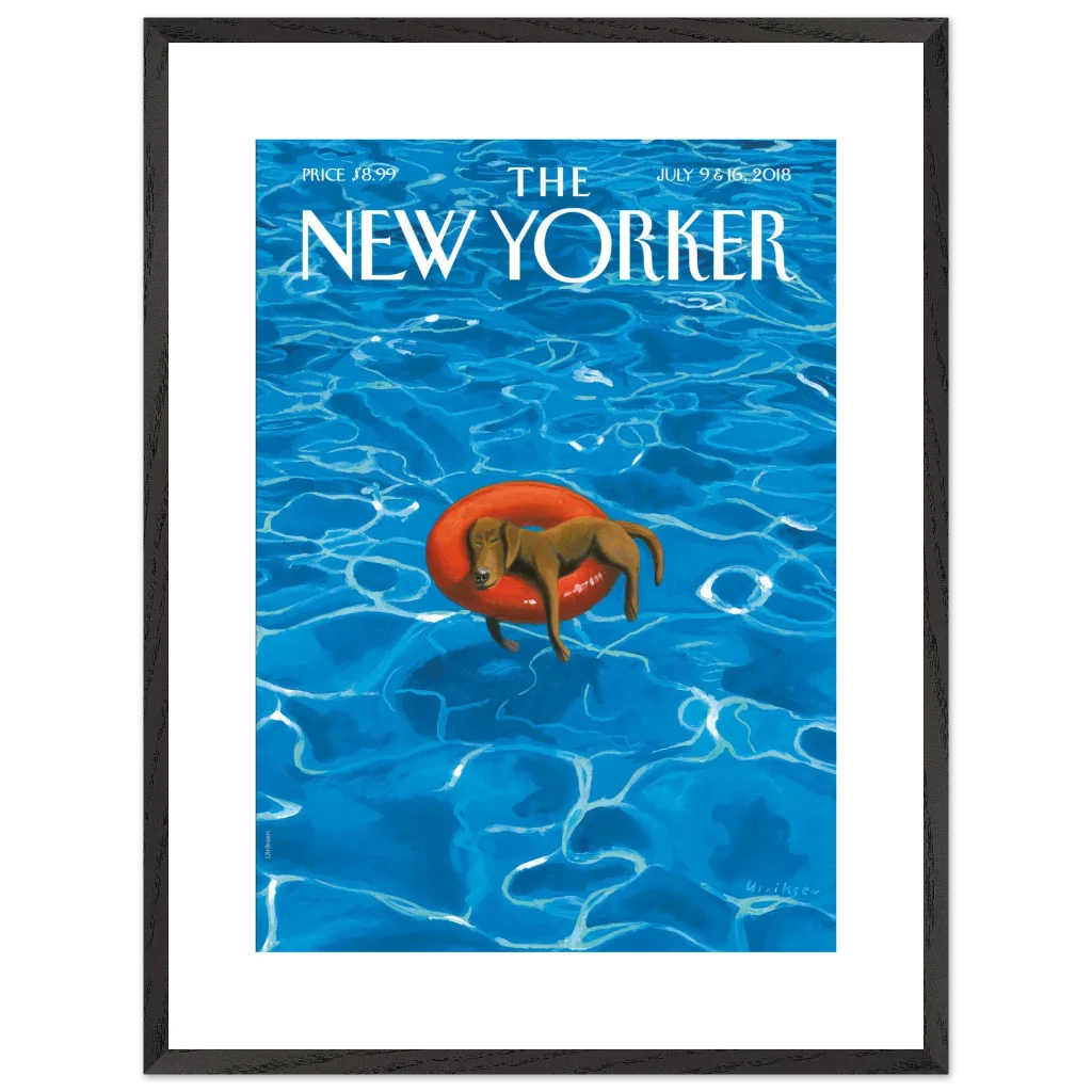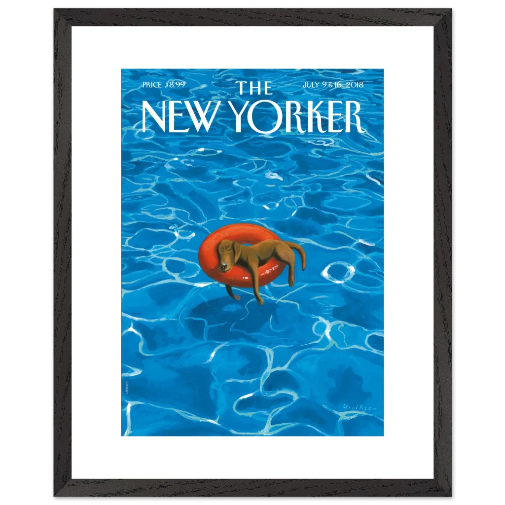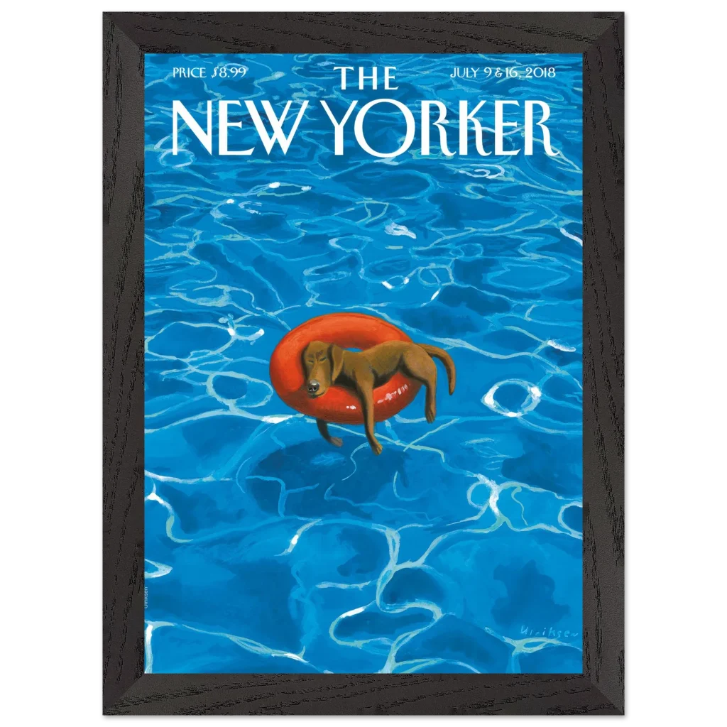 Capture the essence of a serene summer day with this delightful framed art print, featuring the iconic New Yorker cover. A peaceful brown dog floats lazily on a bright orange inner tube in a sparkling blue pool, perfectly embodying ultimate relaxation. This charming piece brings a touch of calm and a hint of playful nostalgia to any space, making it ideal for dog lovers and those who appreciate a laid-back, sun-drenched aesthetic.