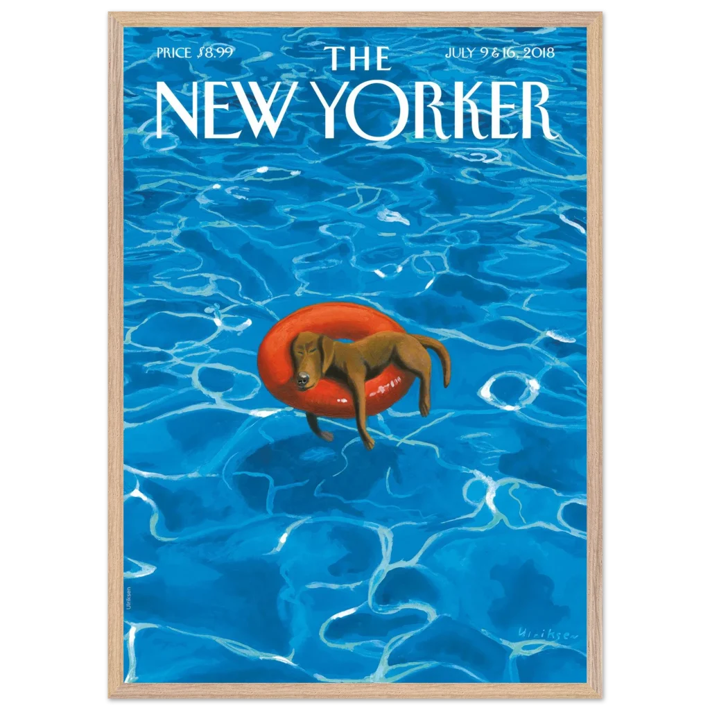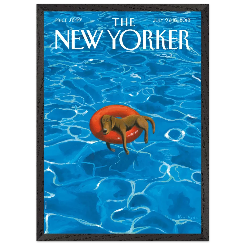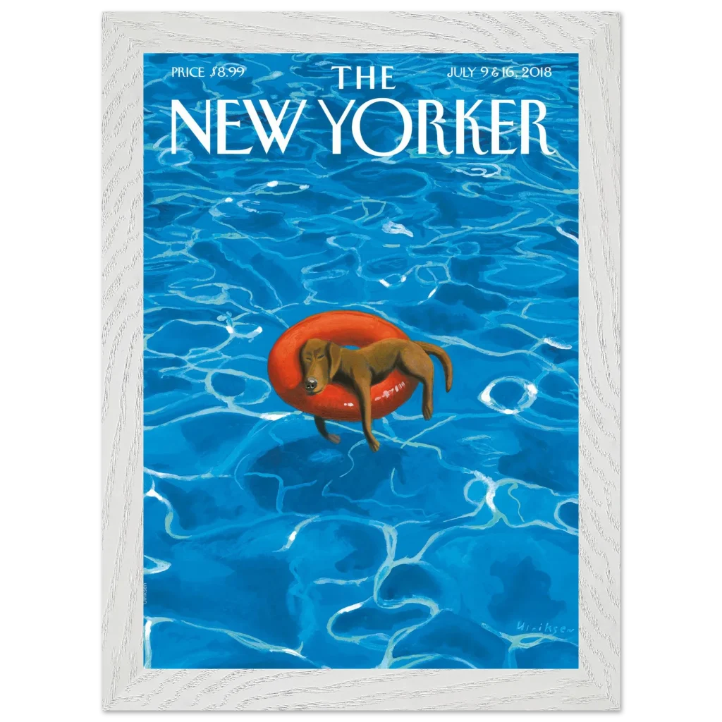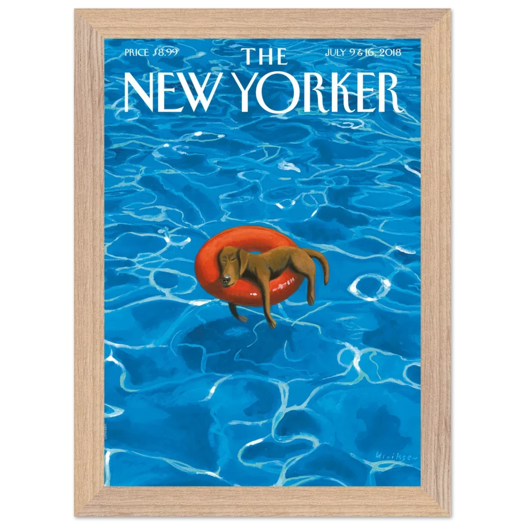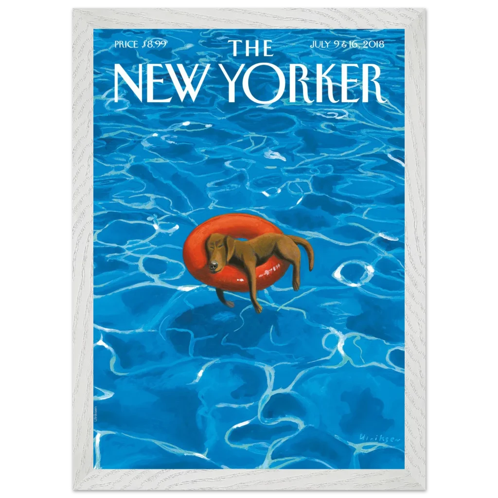 Capture the essence of a serene summer day with this delightful framed art print, featuring the iconic New Yorker cover. A peaceful brown dog floats lazily on a bright orange inner tube in a sparkling blue pool, perfectly embodying ultimate relaxation. This charming piece brings a touch of calm and a hint of playful nostalgia to any space, making it ideal for dog lovers and those who appreciate a laid-back, sun-drenched aesthetic.