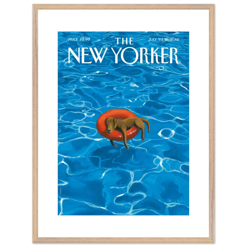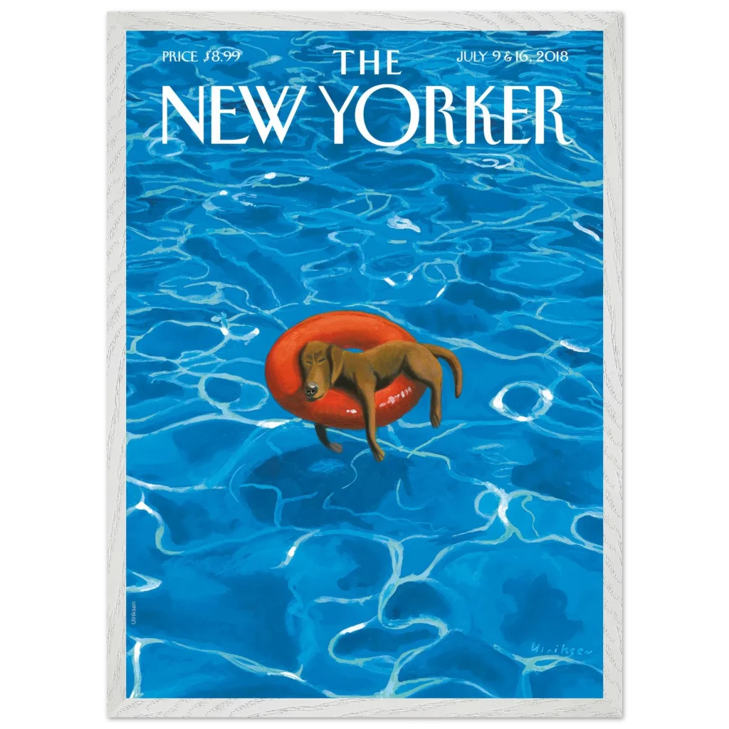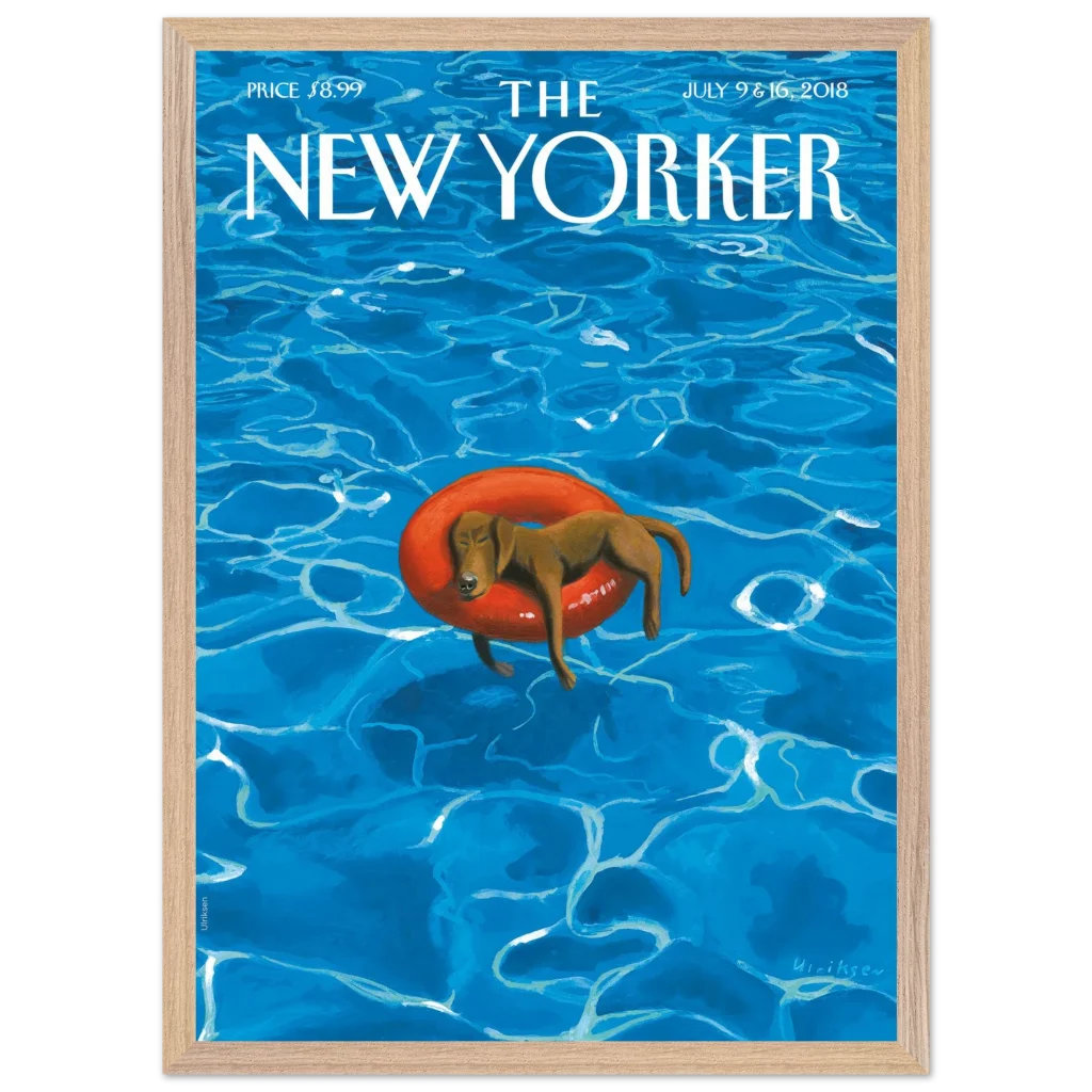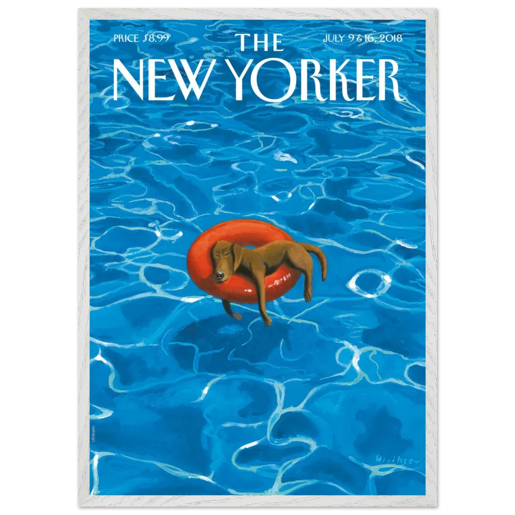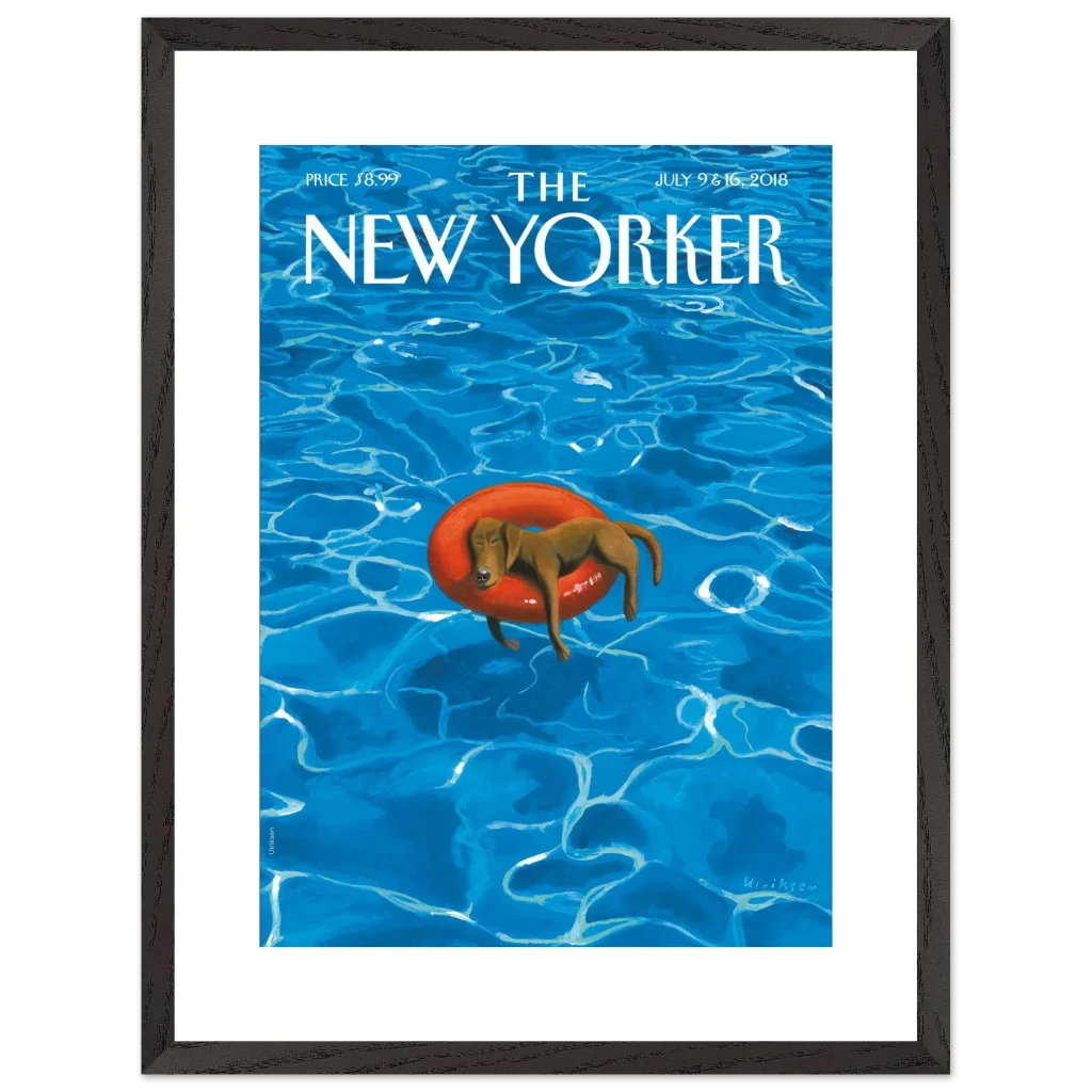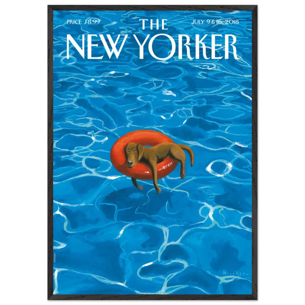 Capture the essence of a serene summer day with this delightful framed art print, featuring the iconic New Yorker cover. A peaceful brown dog floats lazily on a bright orange inner tube in a sparkling blue pool, perfectly embodying ultimate relaxation. This charming piece brings a touch of calm and a hint of playful nostalgia to any space, making it ideal for dog lovers and those who appreciate a laid-back, sun-drenched aesthetic.
