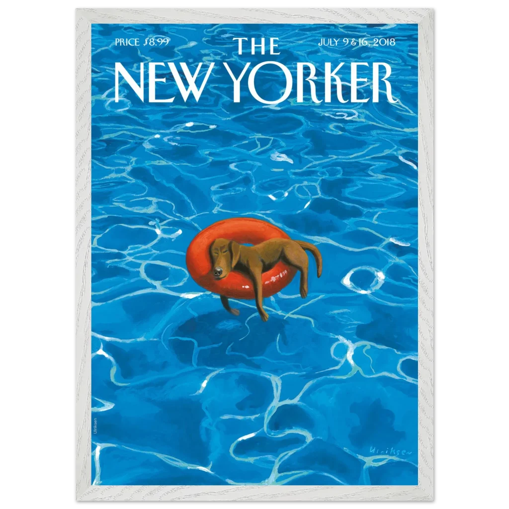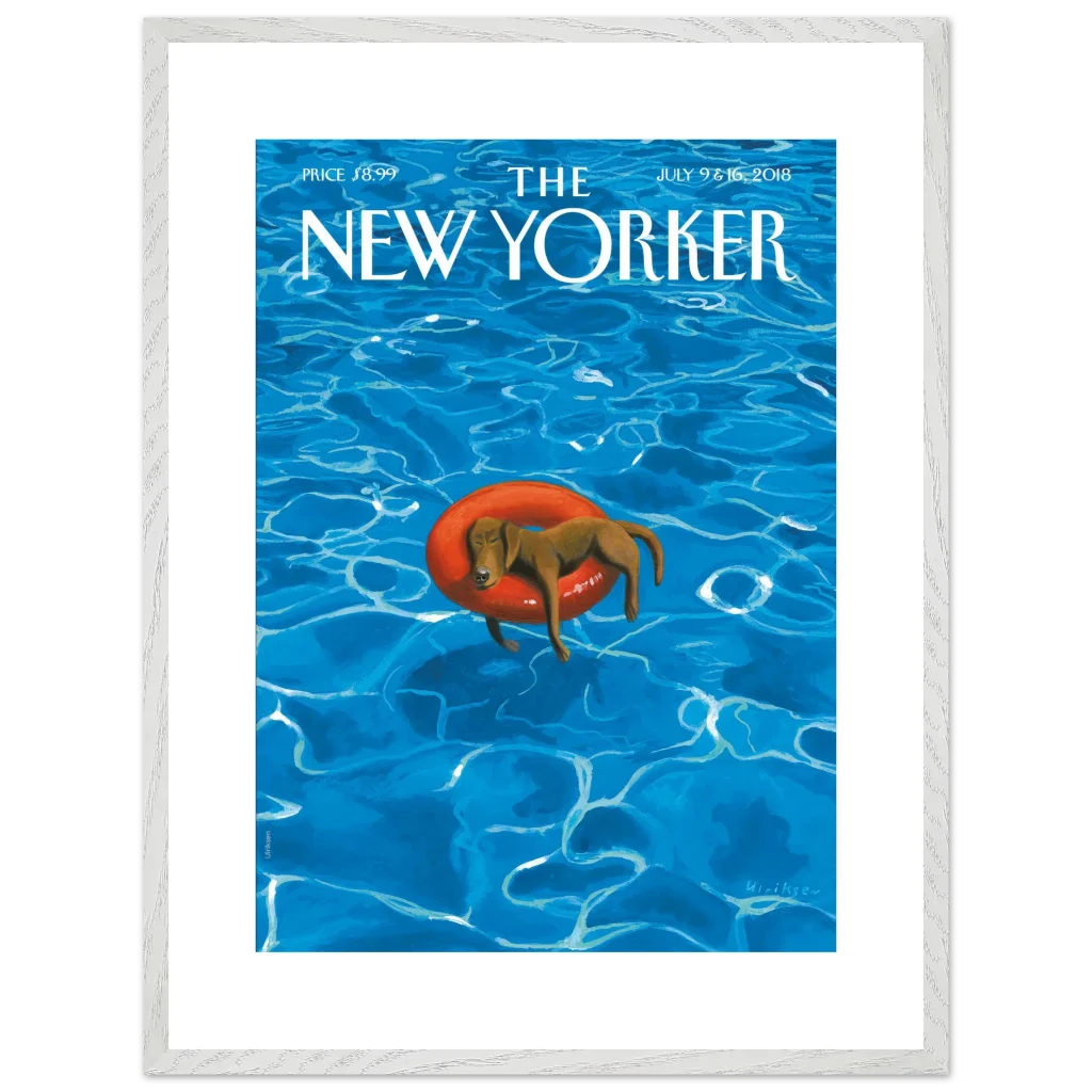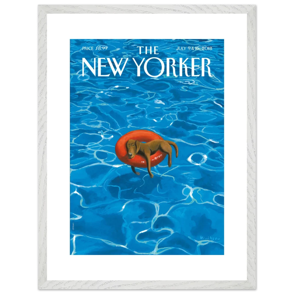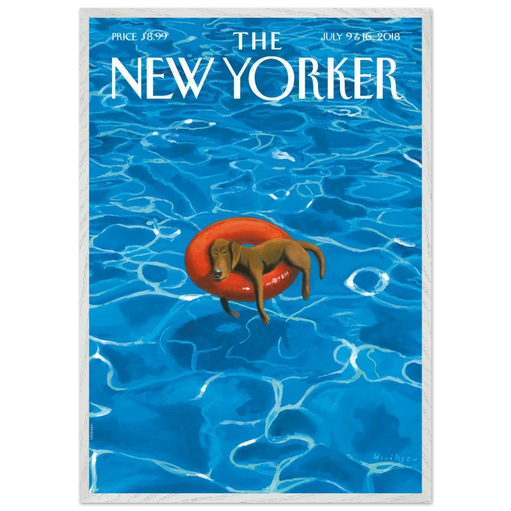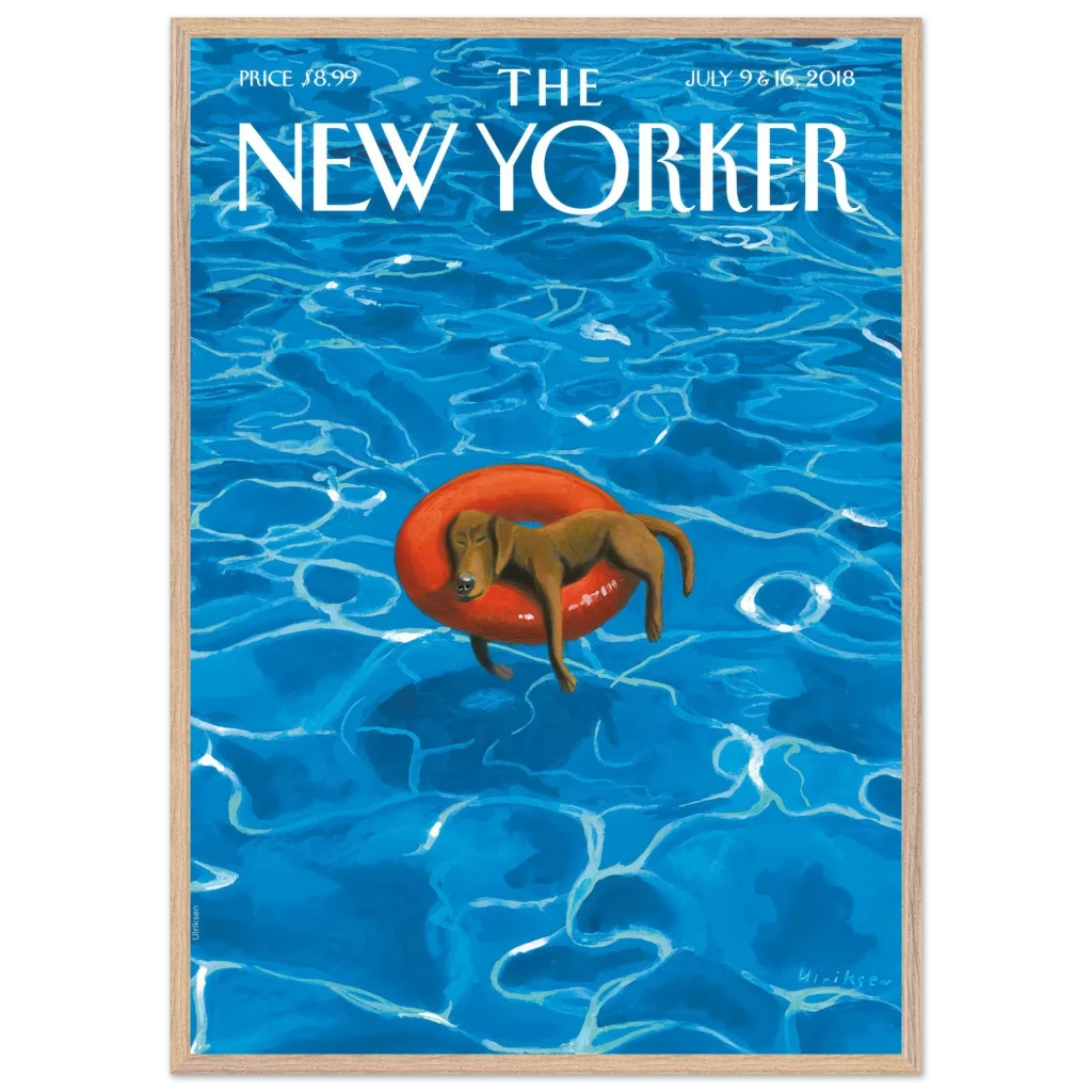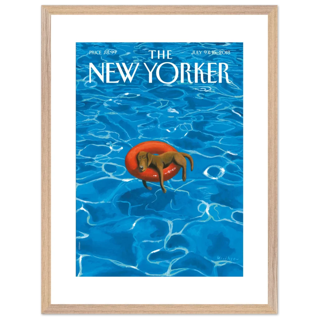 Capture the essence of a serene summer day with this delightful framed art print, featuring the iconic New Yorker cover. A peaceful brown dog floats lazily on a bright orange inner tube in a sparkling blue pool, perfectly embodying ultimate relaxation. This charming piece brings a touch of calm and a hint of playful nostalgia to any space, making it ideal for dog lovers and those who appreciate a laid-back, sun-drenched aesthetic.