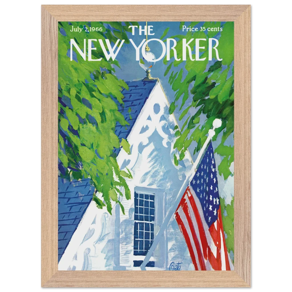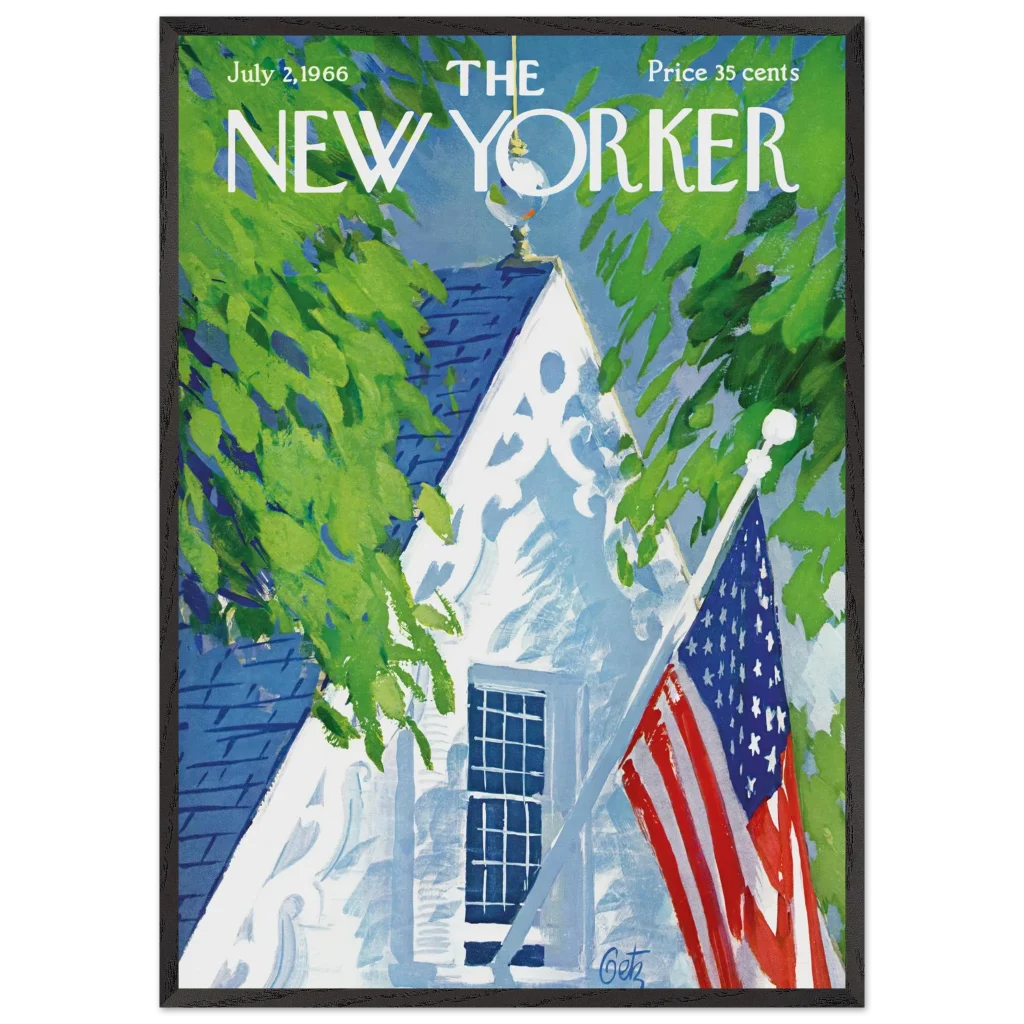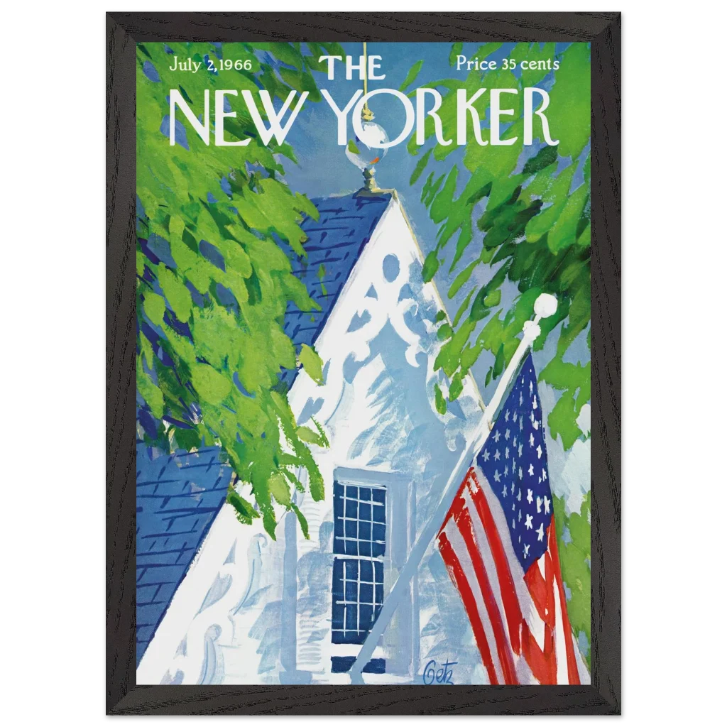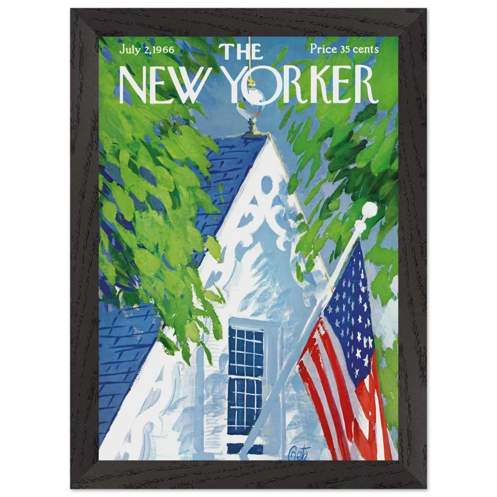 Capture the essence of a tranquil summer day with this stunning framed poster featuring a classic New Yorker cover. This vibrant piece, showcasing a charming house with an American flag under lush green foliage, brings a touch of nostalgic Americana and artistic flair to any room. It’s the perfect accent for art lovers seeking a blend of vintage charm and modern quality.