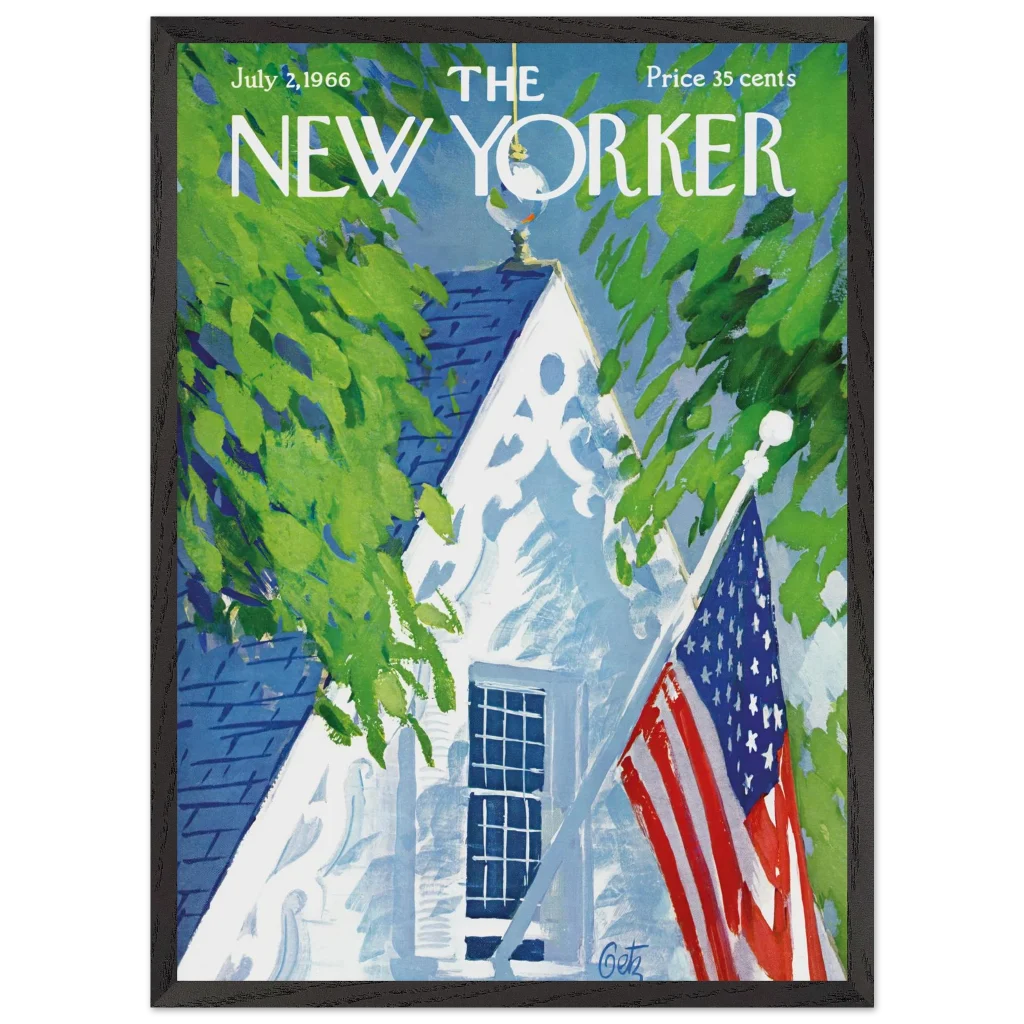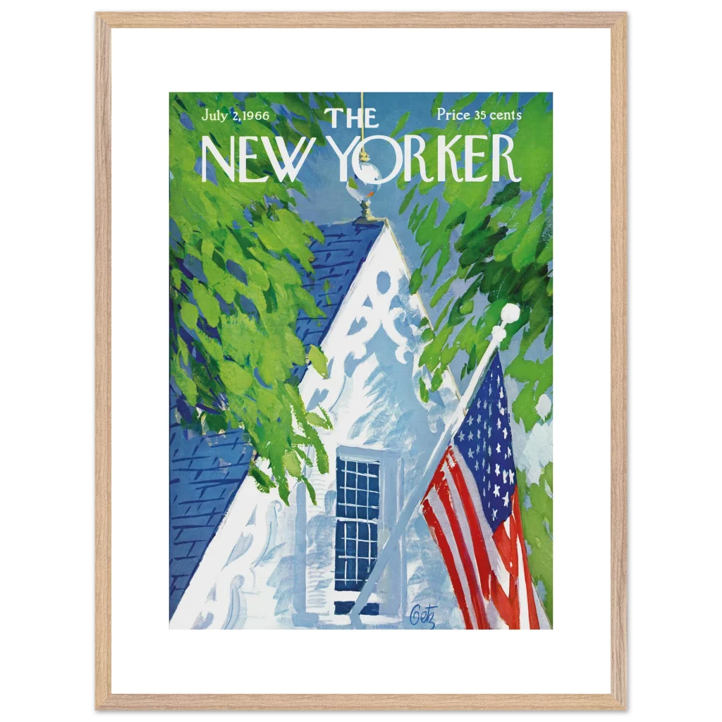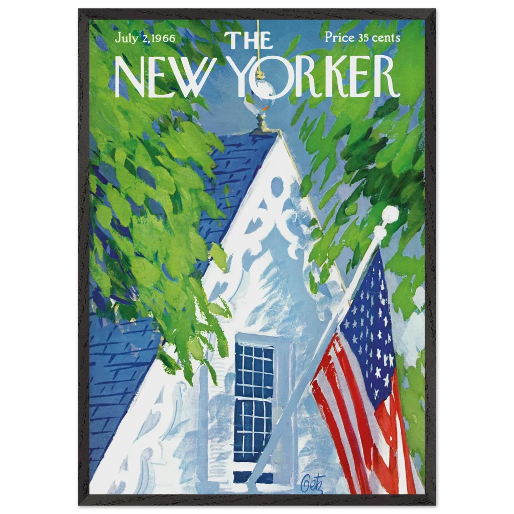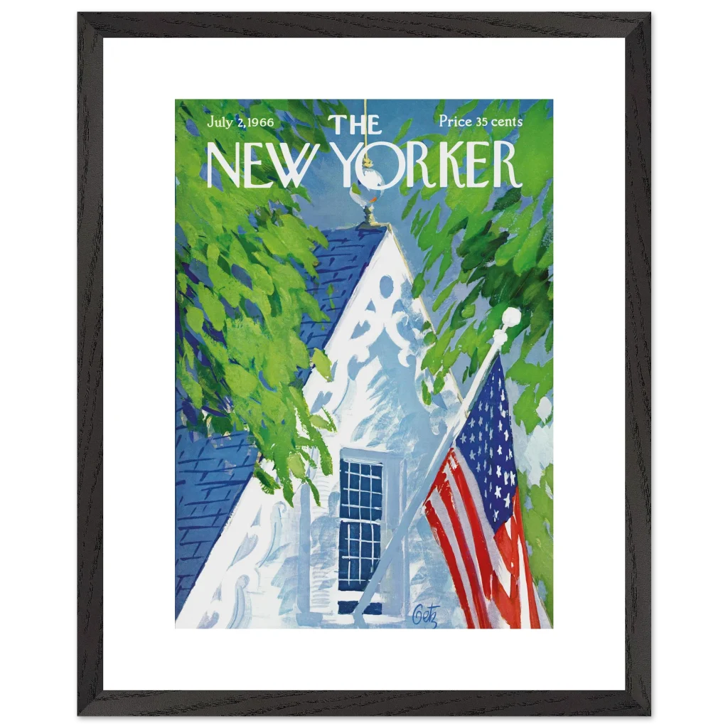 Capture the essence of a tranquil summer day with this stunning framed poster featuring a classic New Yorker cover. This vibrant piece, showcasing a charming house with an American flag under lush green foliage, brings a touch of nostalgic Americana and artistic flair to any room. It’s the perfect accent for art lovers seeking a blend of vintage charm and modern quality.