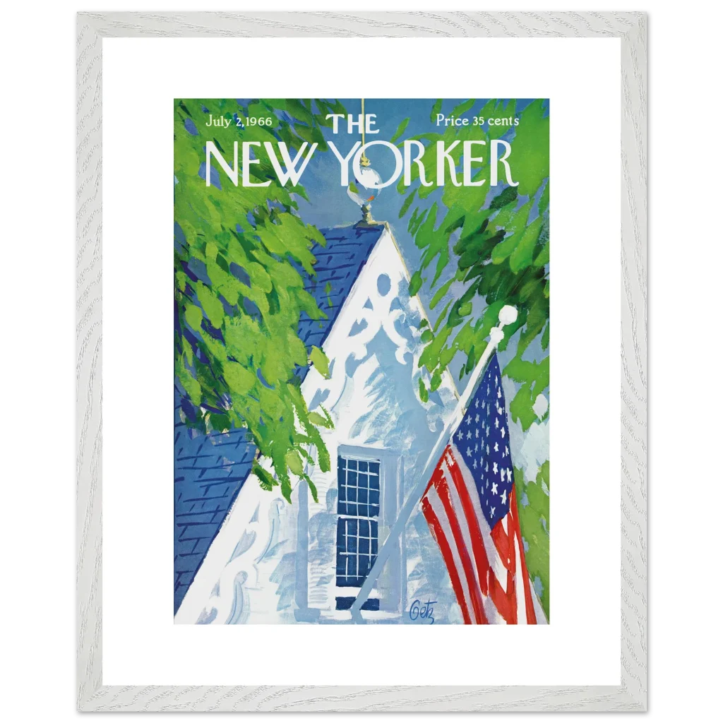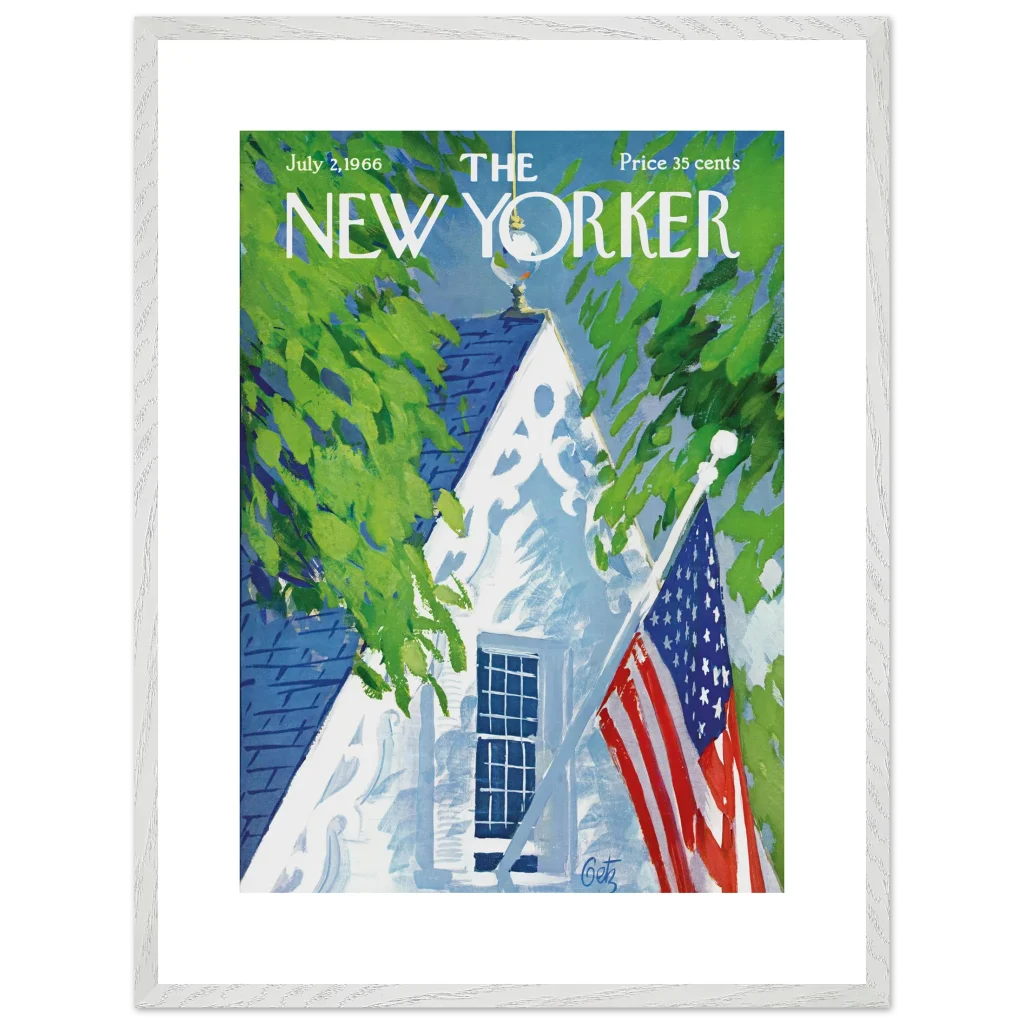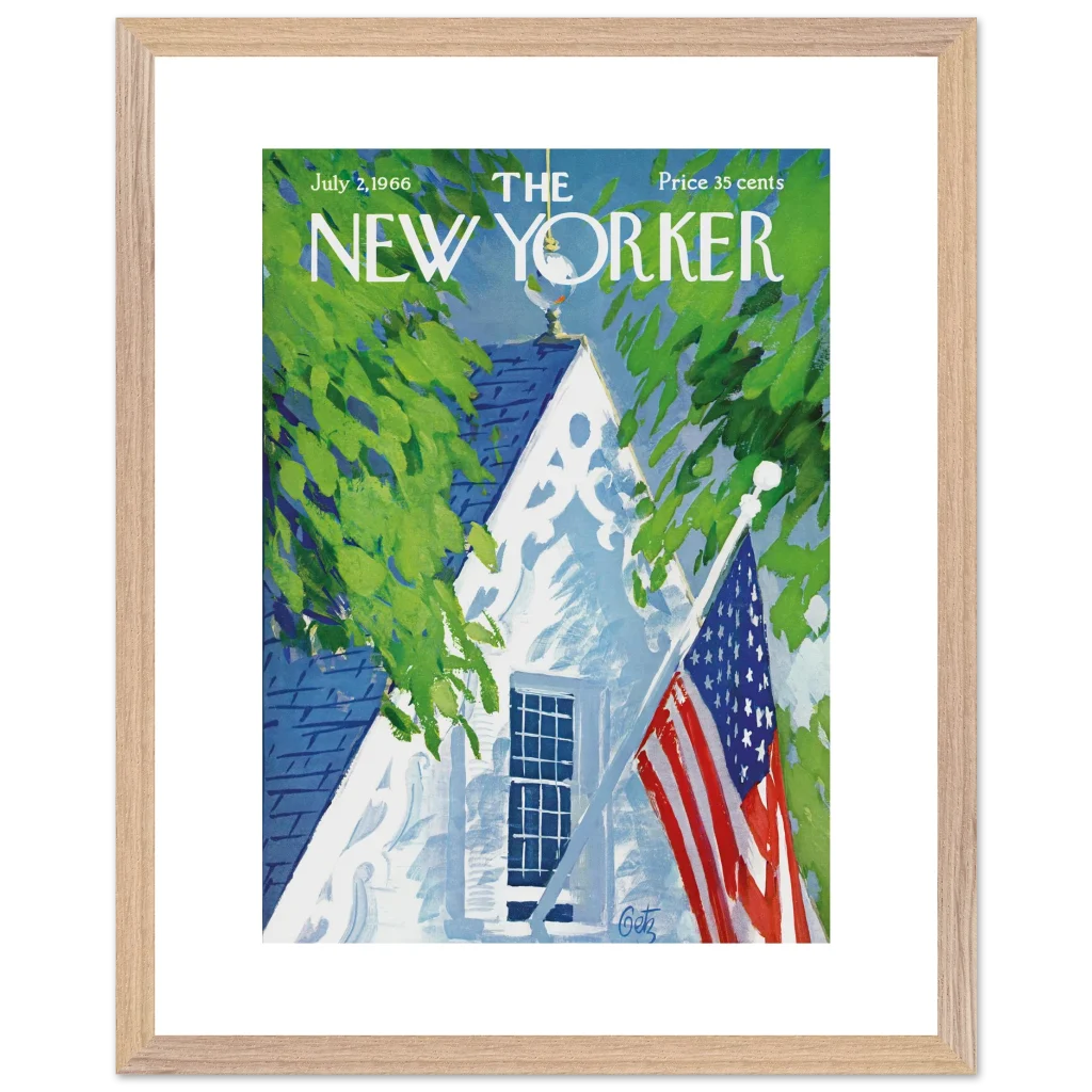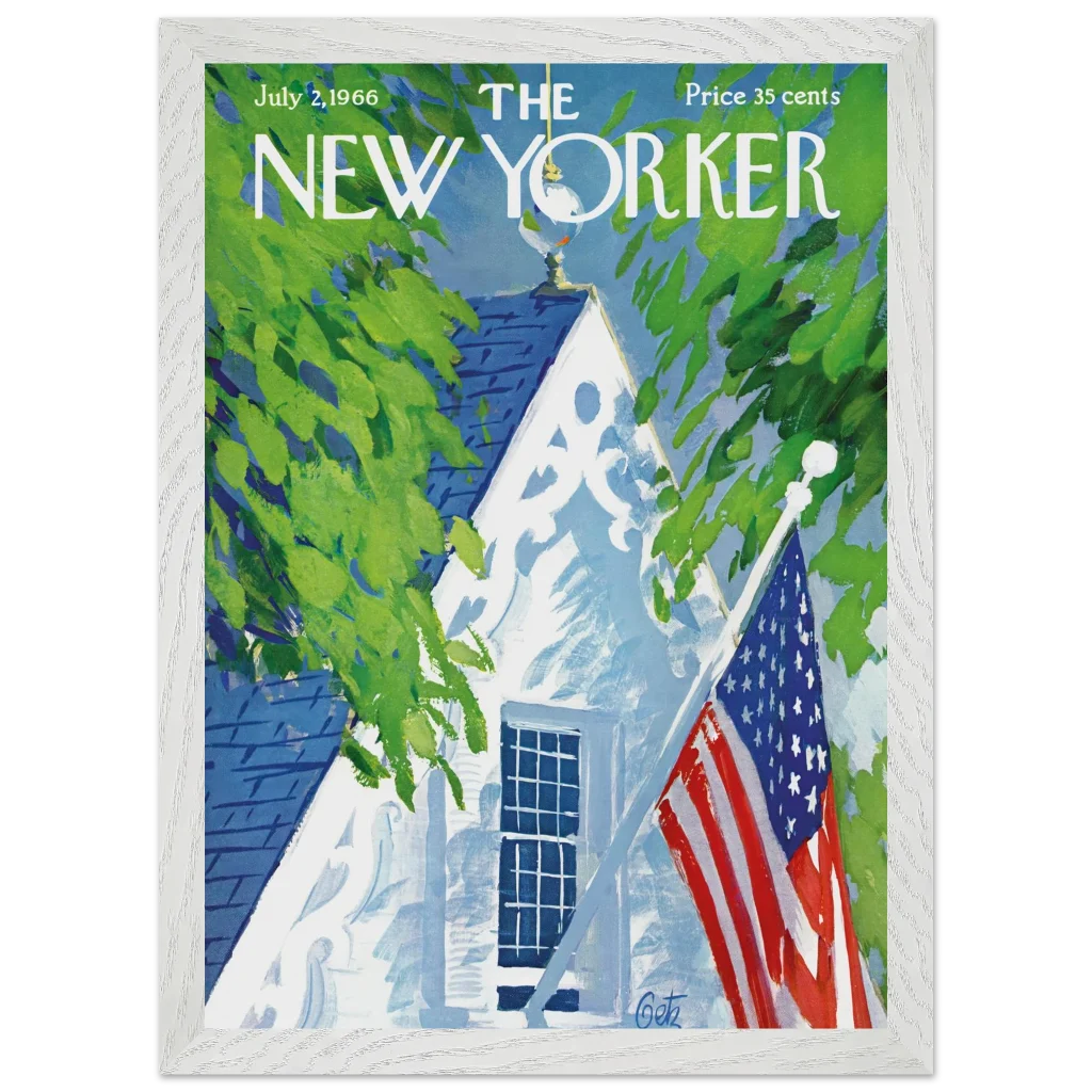 Capture the essence of a tranquil summer day with this stunning framed poster featuring a classic New Yorker cover. This vibrant piece, showcasing a charming house with an American flag under lush green foliage, brings a touch of nostalgic Americana and artistic flair to any room. It’s the perfect accent for art lovers seeking a blend of vintage charm and modern quality.