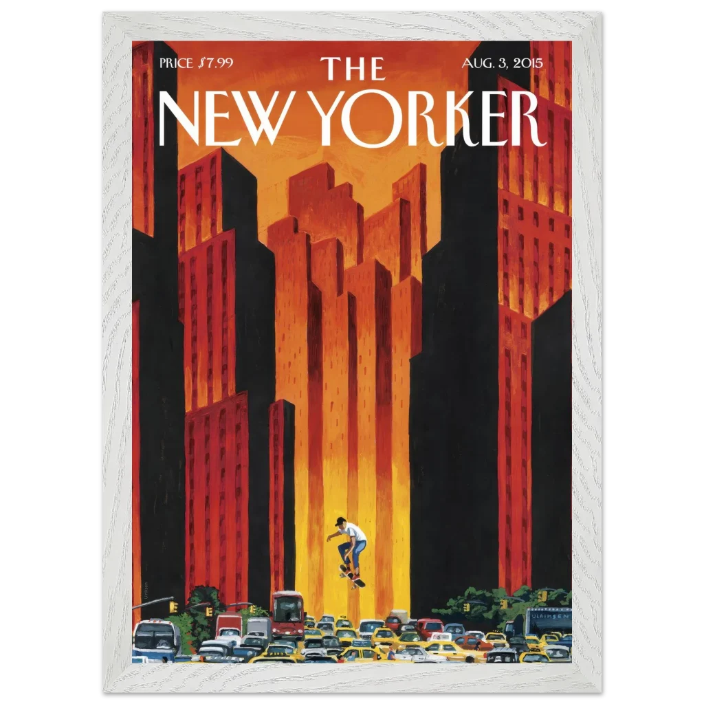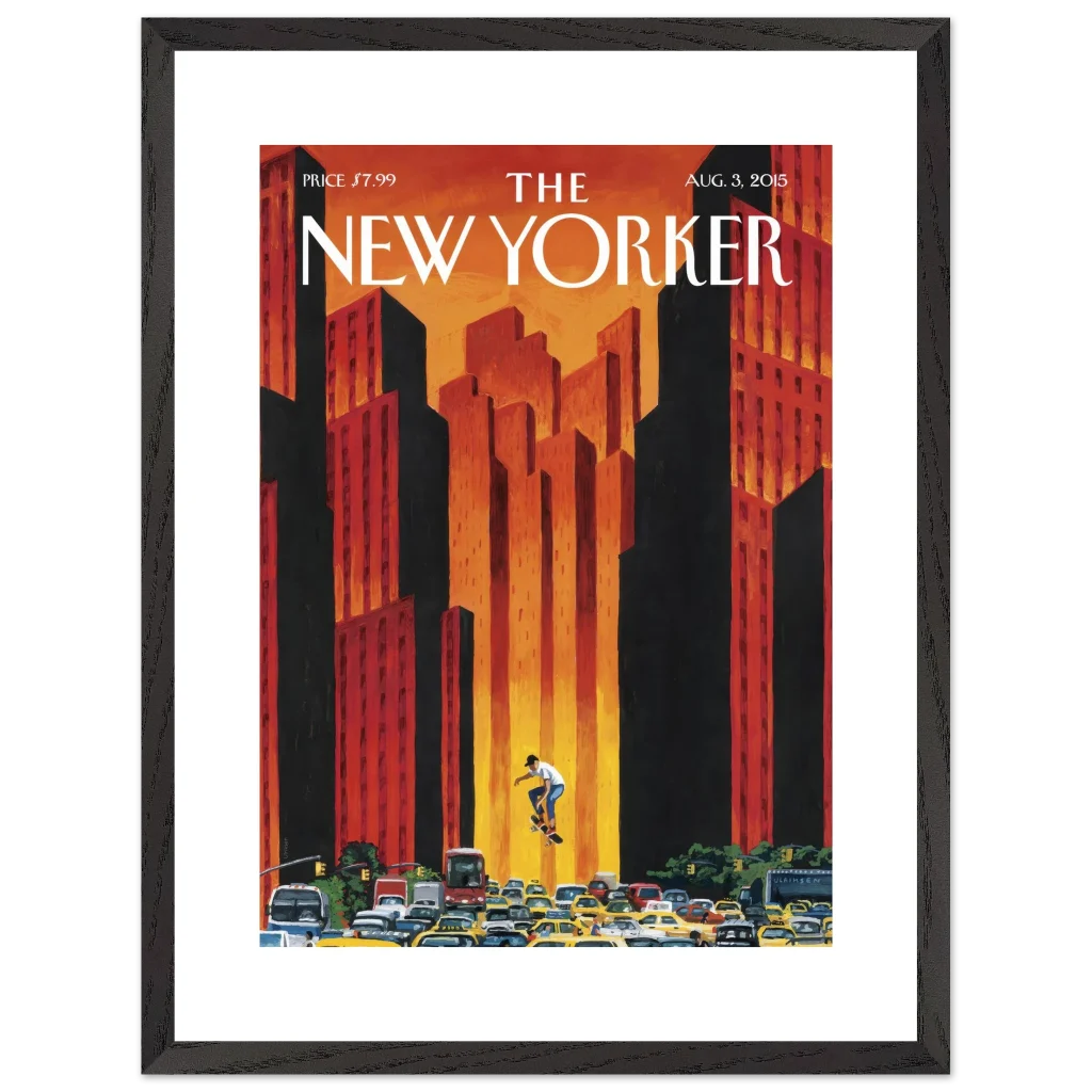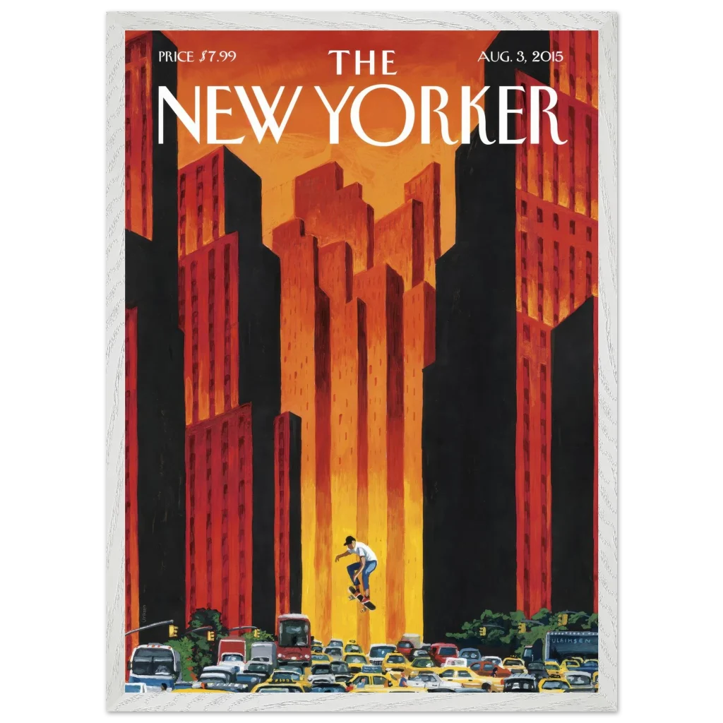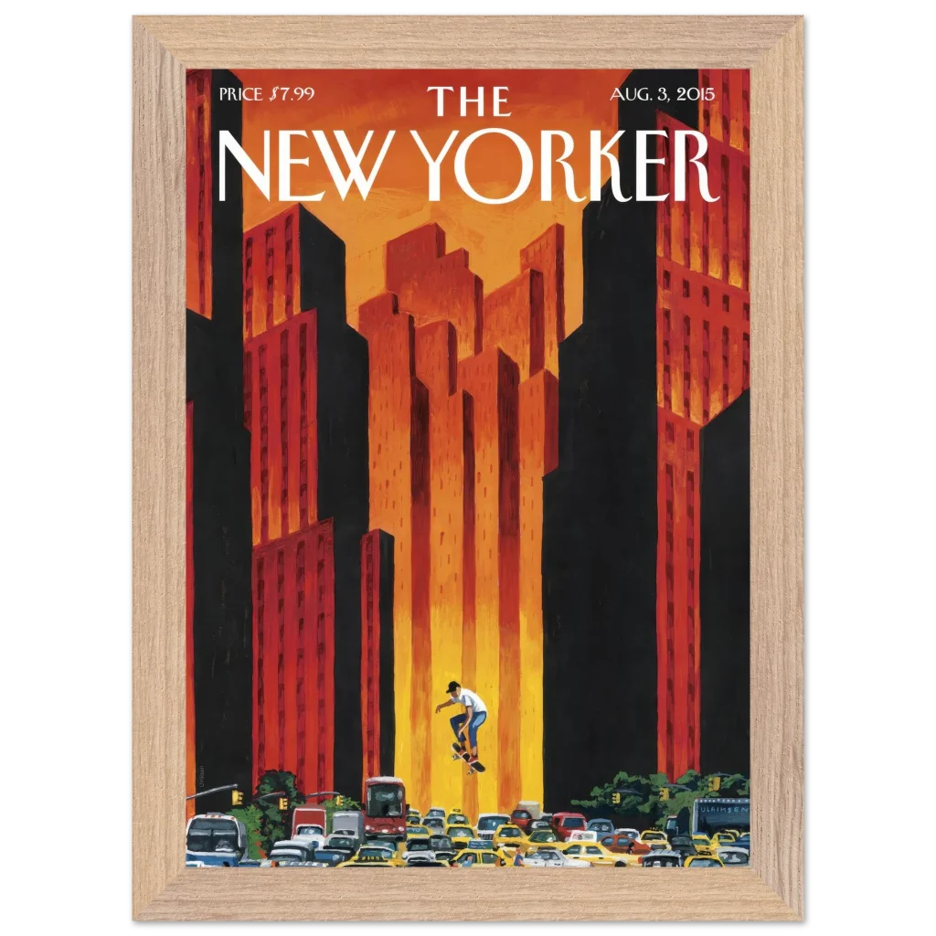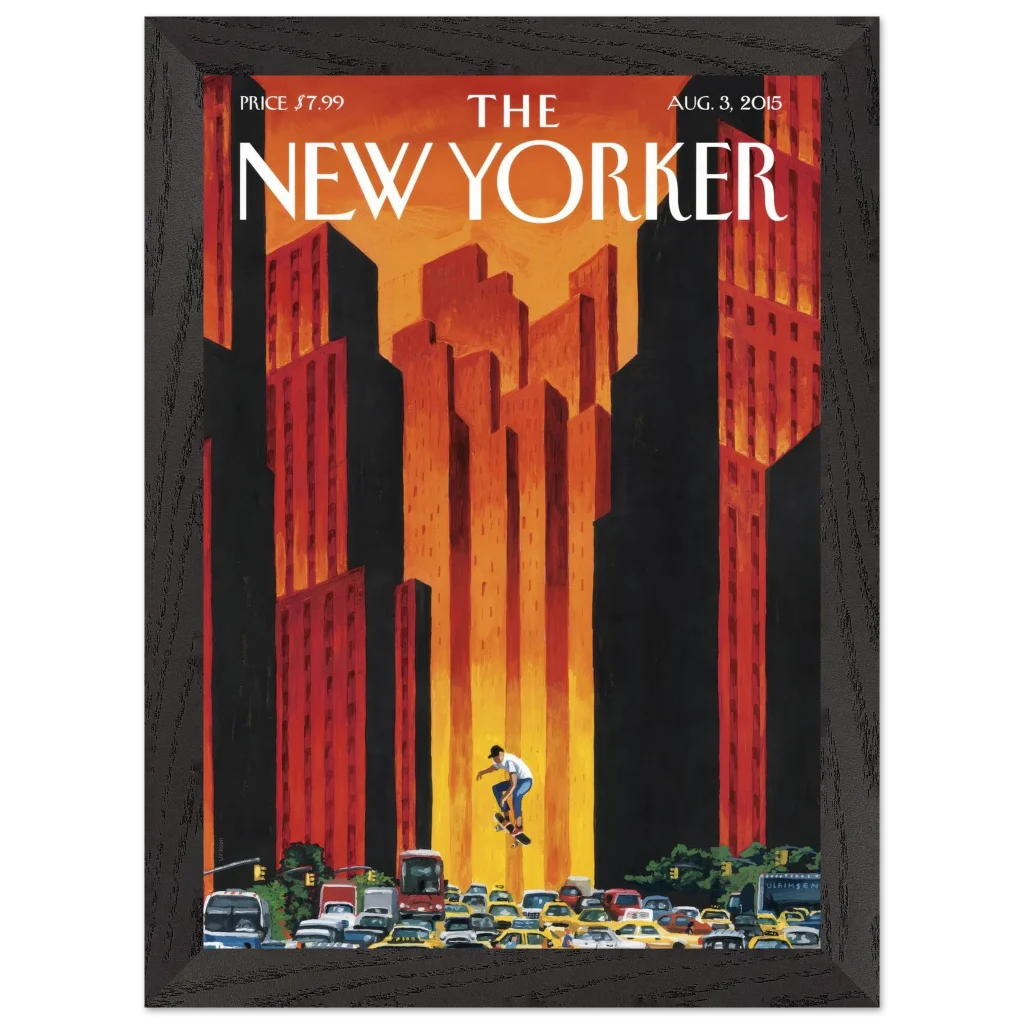 Capture the vibrant energy of the city at dusk with our ‘Sunset Skateboarder’ framed poster. This iconic urban pop art print, inspired by classic magazine covers, brings a unique blend of dynamic movement and striking color to any space. Imagine the golden hour light reflecting off the skyscrapers as a lone skateboarder soars above the bustling streets – a perfect statement piece for modern art enthusiasts and urban explorers alike.