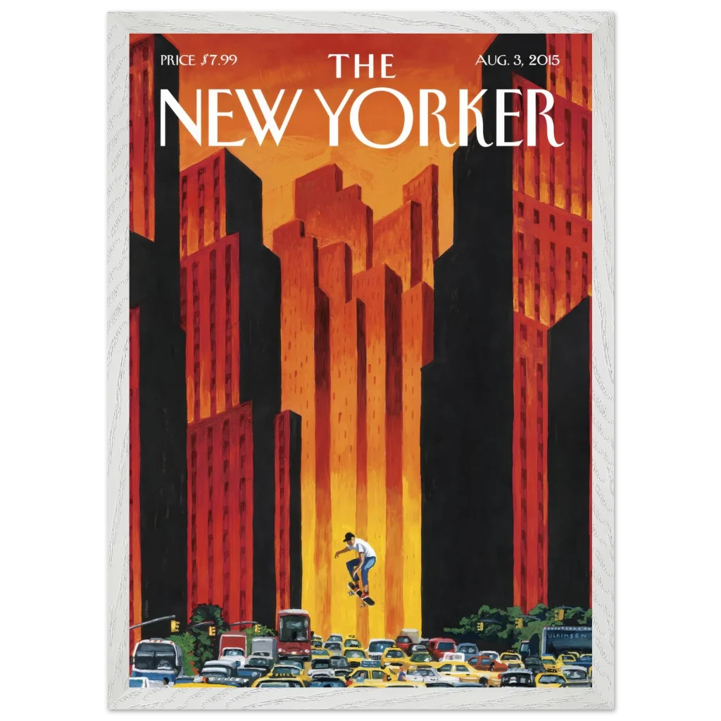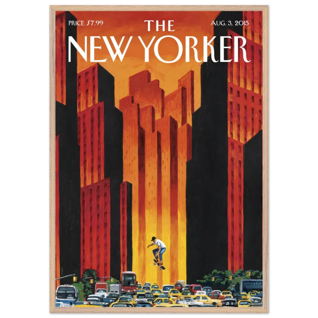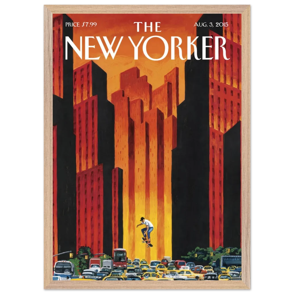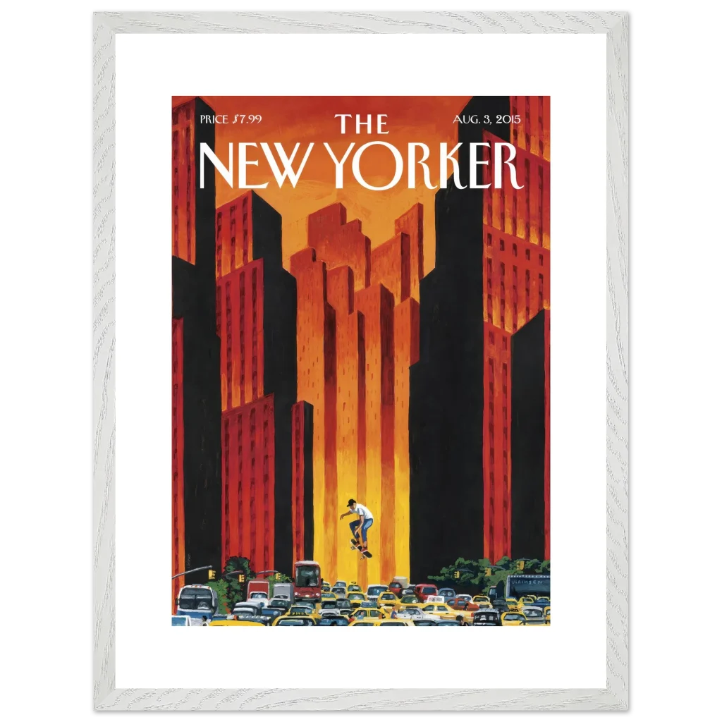 Capture the vibrant energy of the city at dusk with our ‘Sunset Skateboarder’ framed poster. This iconic urban pop art print, inspired by classic magazine covers, brings a unique blend of dynamic movement and striking color to any space. Imagine the golden hour light reflecting off the skyscrapers as a lone skateboarder soars above the bustling streets – a perfect statement piece for modern art enthusiasts and urban explorers alike.