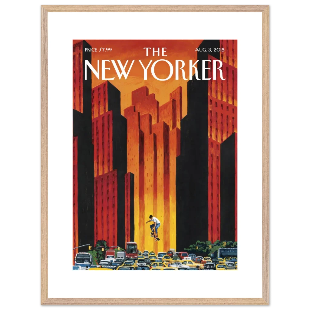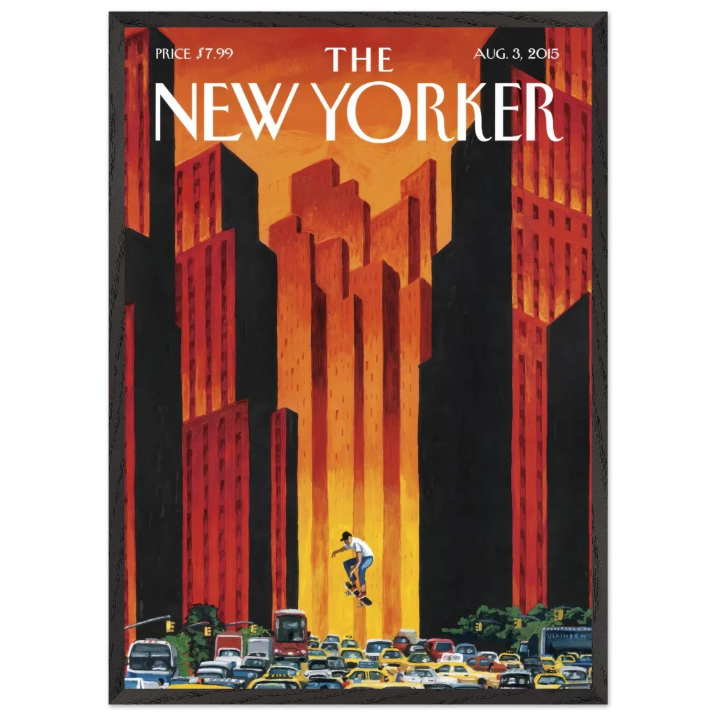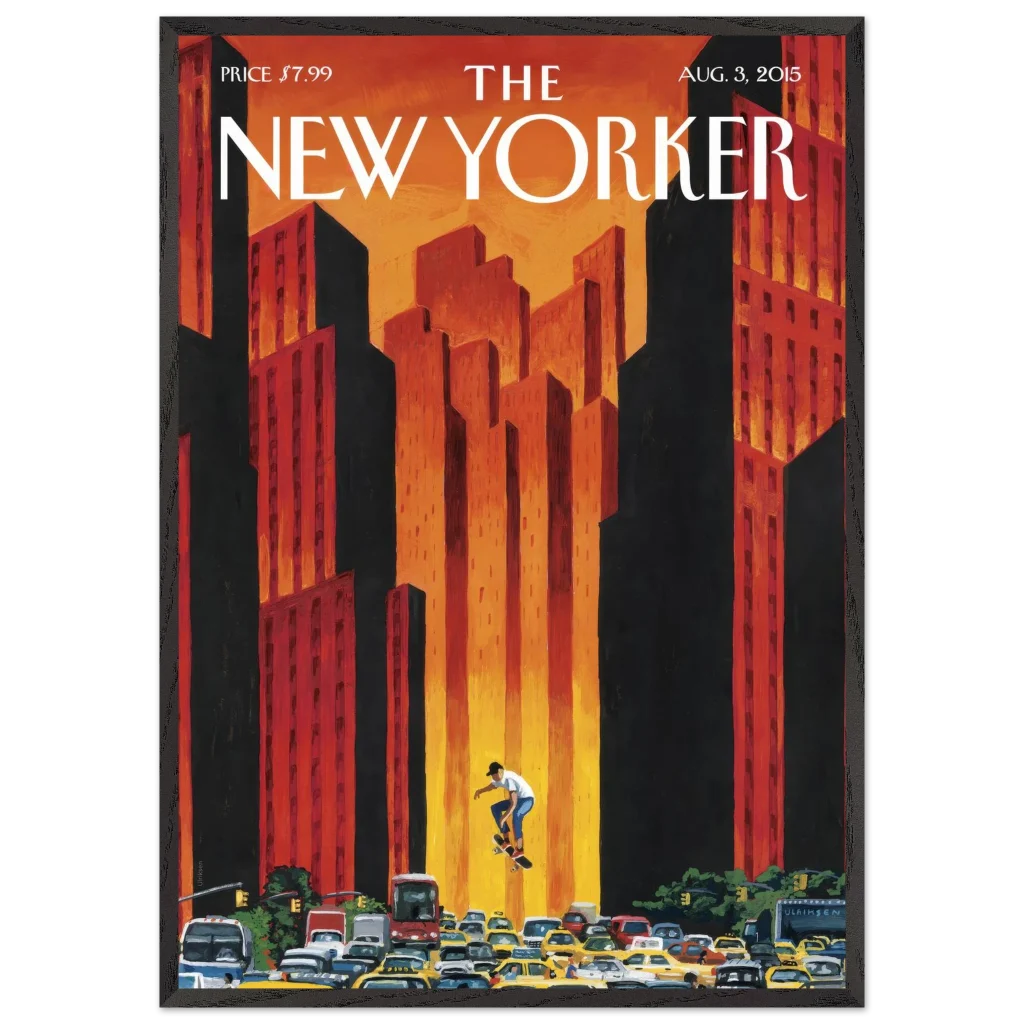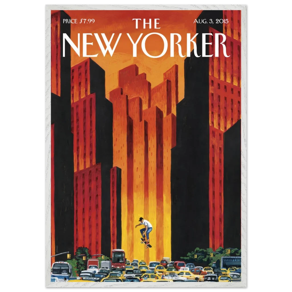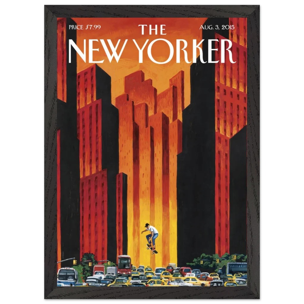 Capture the vibrant energy of the city at dusk with our ‘Sunset Skateboarder’ framed poster. This iconic urban pop art print, inspired by classic magazine covers, brings a unique blend of dynamic movement and striking color to any space. Imagine the golden hour light reflecting off the skyscrapers as a lone skateboarder soars above the bustling streets – a perfect statement piece for modern art enthusiasts and urban explorers alike.