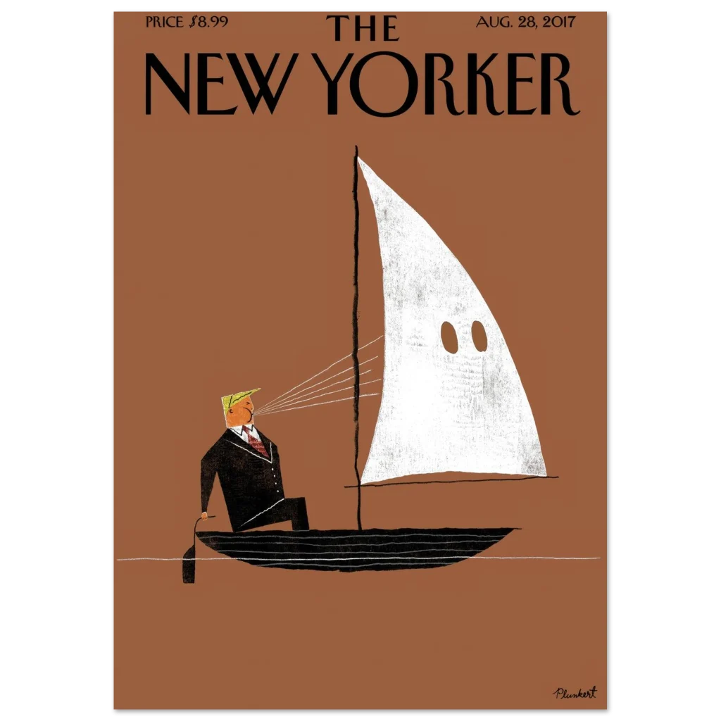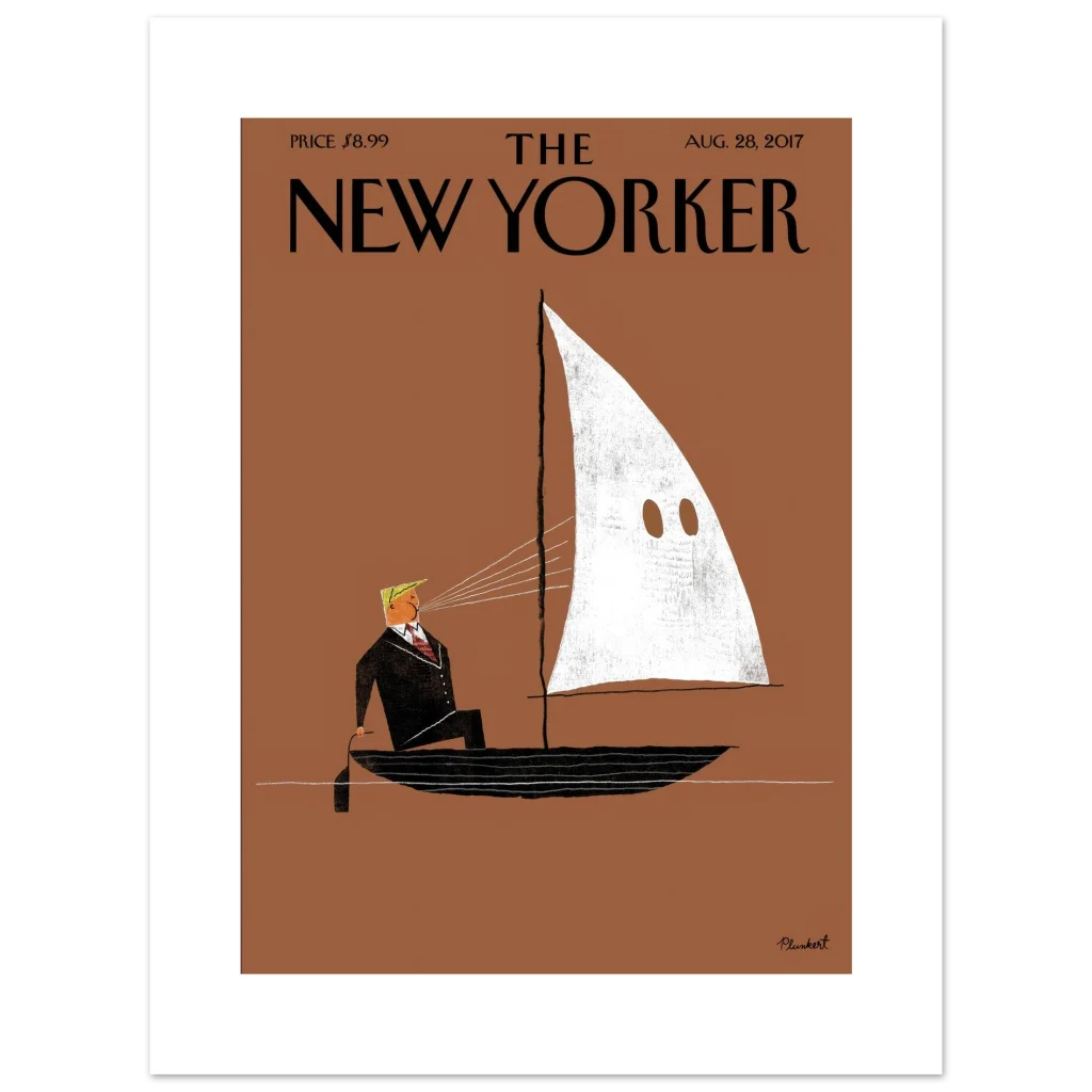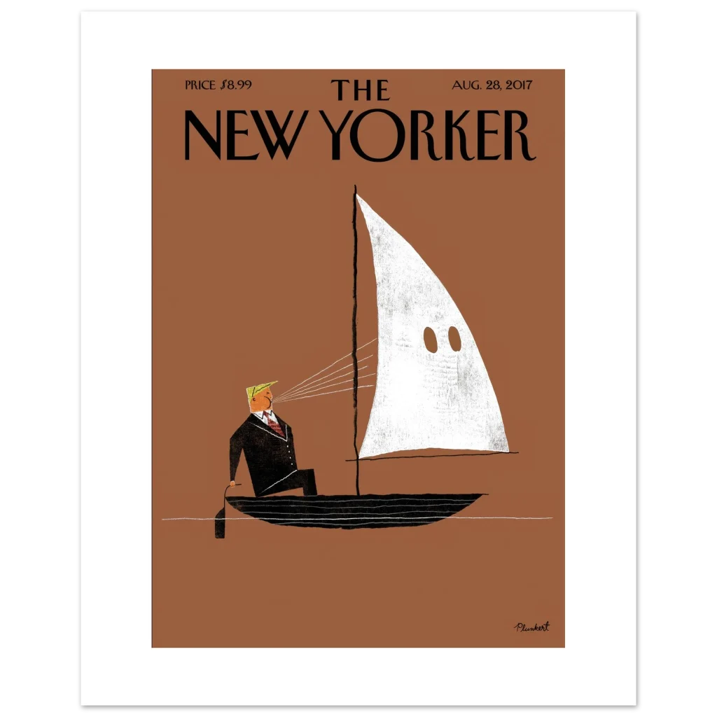 Bring thought-provoking satire into your space with this iconic ‘The Storm’ cover art by David Plunkert, originally for The New Yorker on August 28, 2017. This powerful illustration, rich in political commentary and rendered in a distinctive graphic style, makes a bold statement in any room. Perfect for art collectors, political enthusiasts, or anyone seeking a conversation-starting piece, it captures a pivotal moment in contemporary history with undeniable artistic flair.