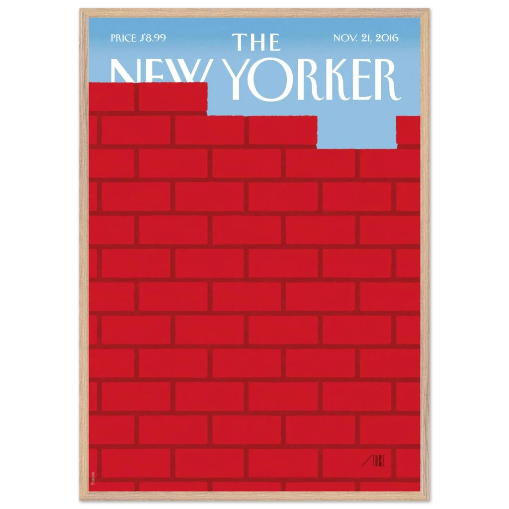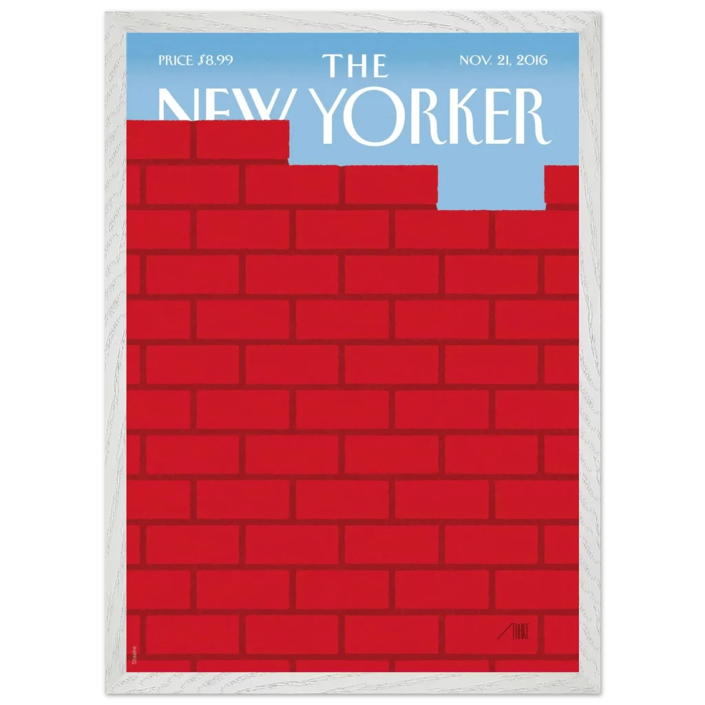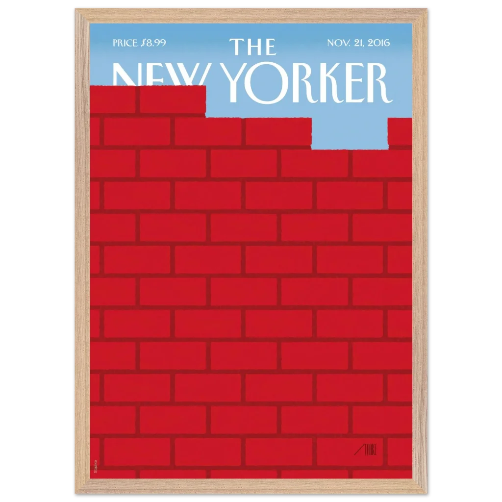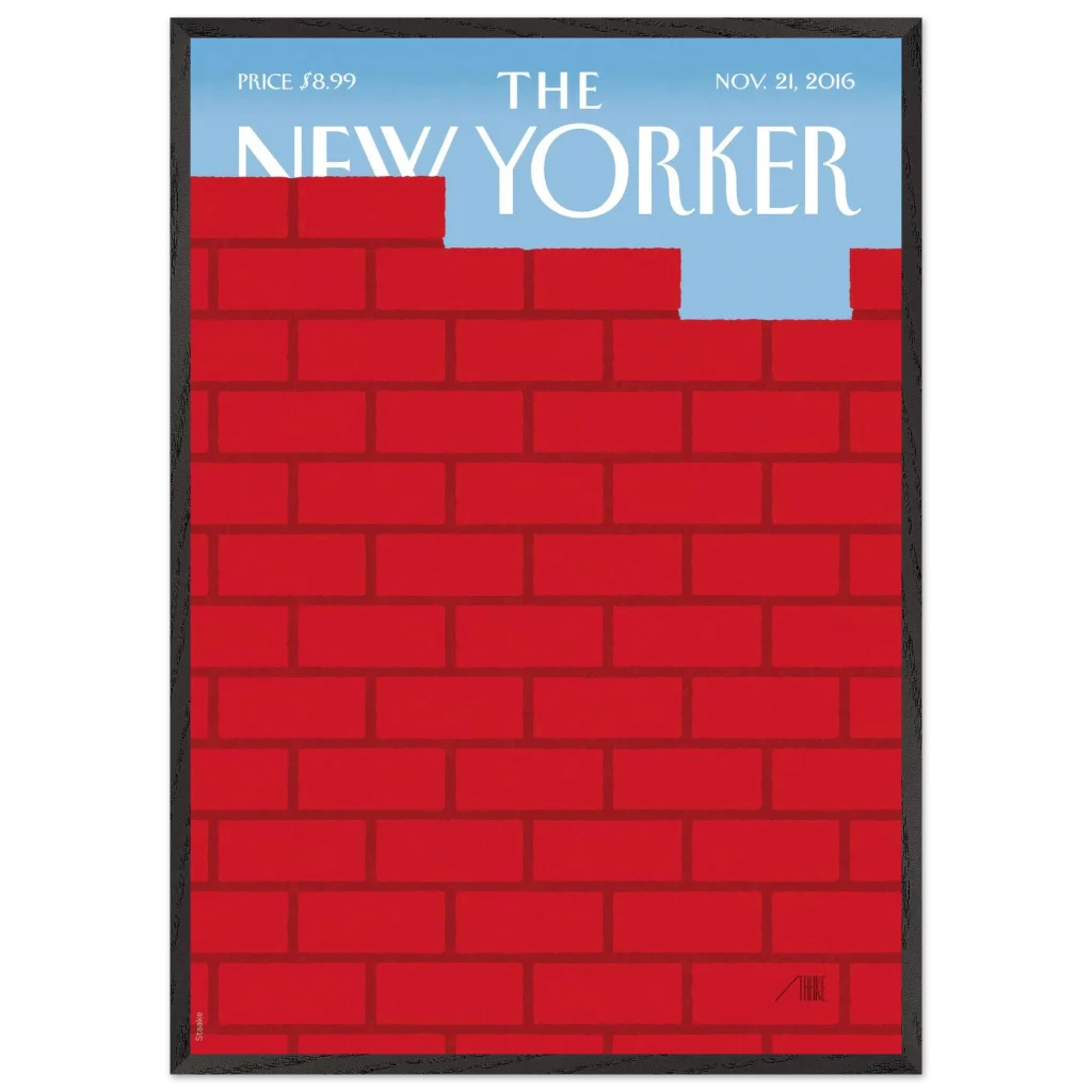 Capture a piece of iconic commentary with “The Wall” framed poster, a vibrant, minimalist tribute to classic New Yorker covers. Featuring a striking red brick wall partially obscuring the magazine’s masthead against a serene blue sky, this artwork provokes thought and adds a bold, contemporary statement to any space. It’s a powerful visual metaphor that resonates with art lovers and collectors alike.