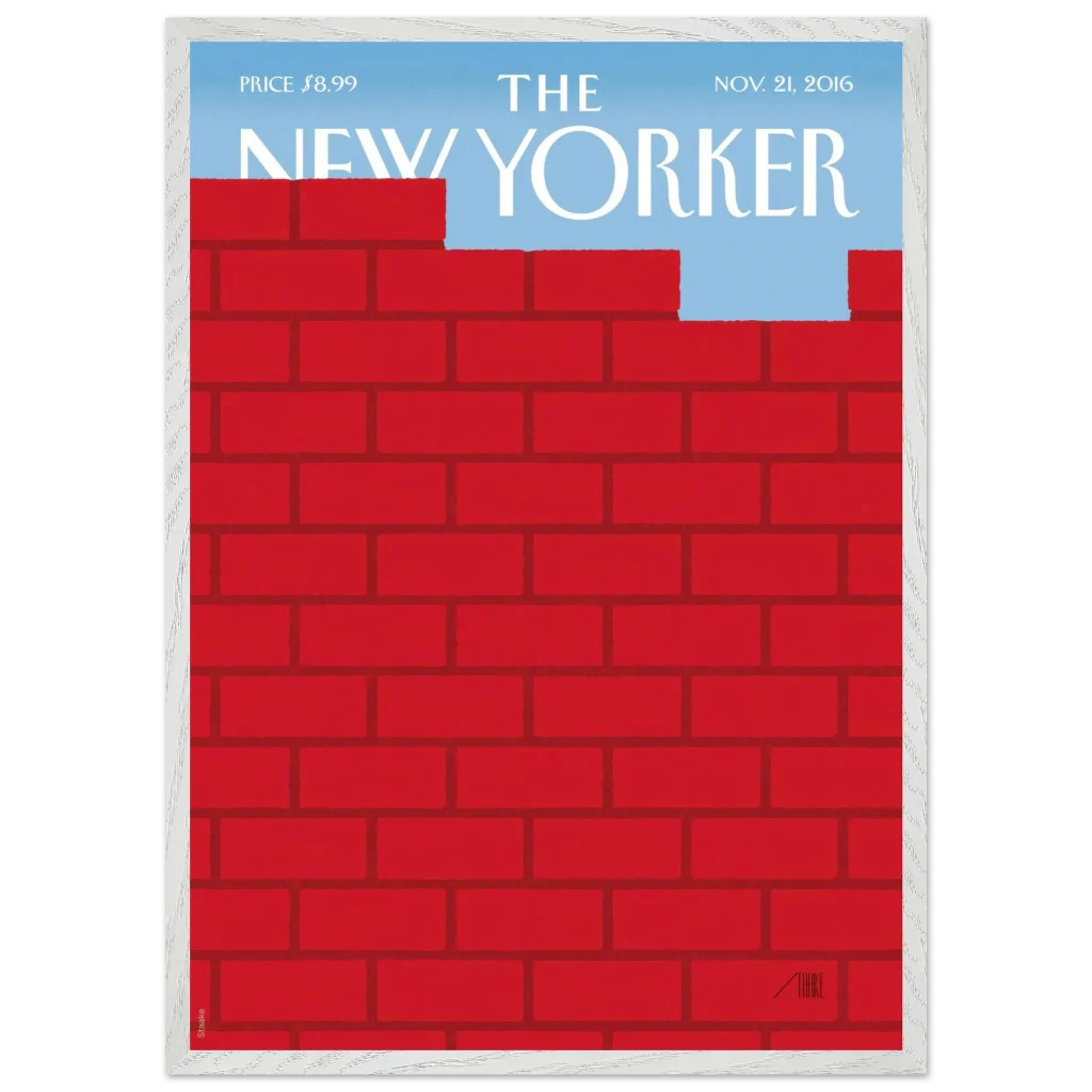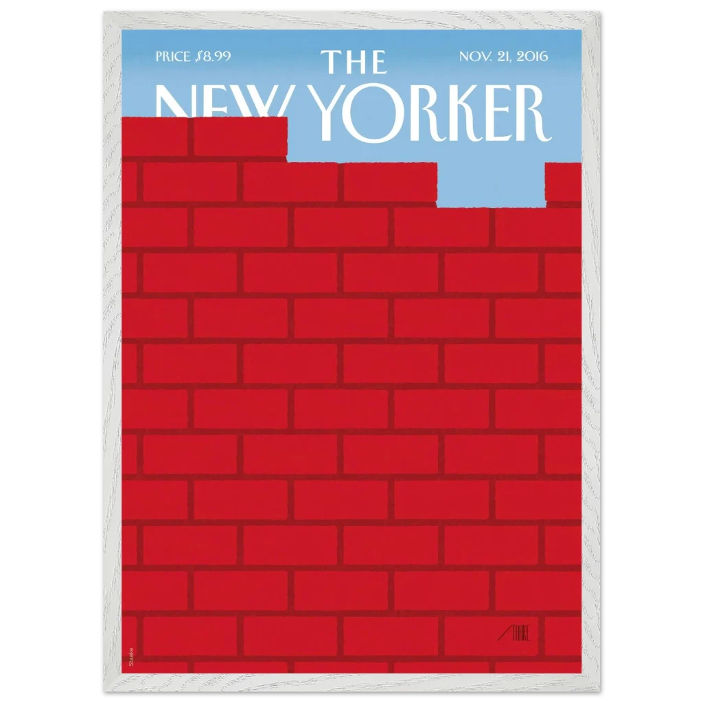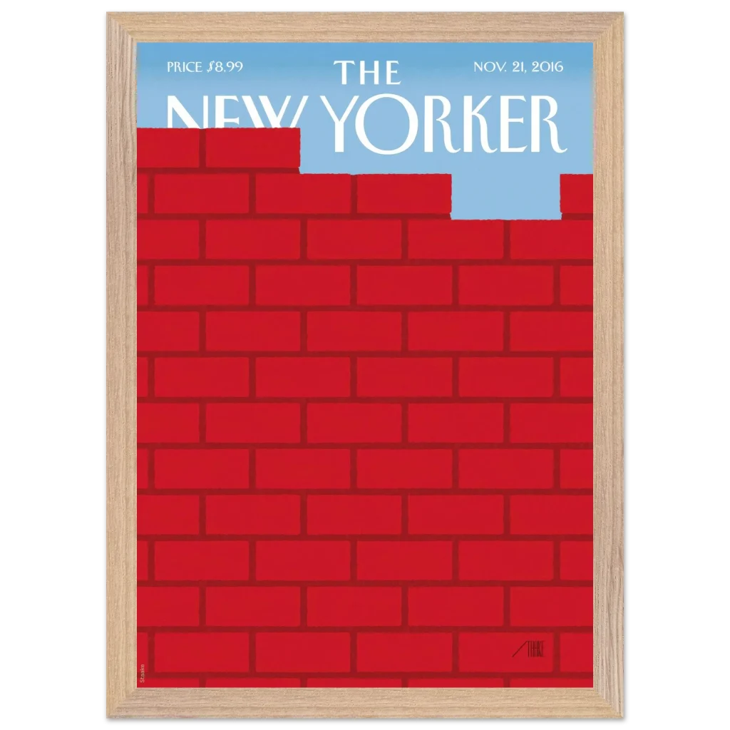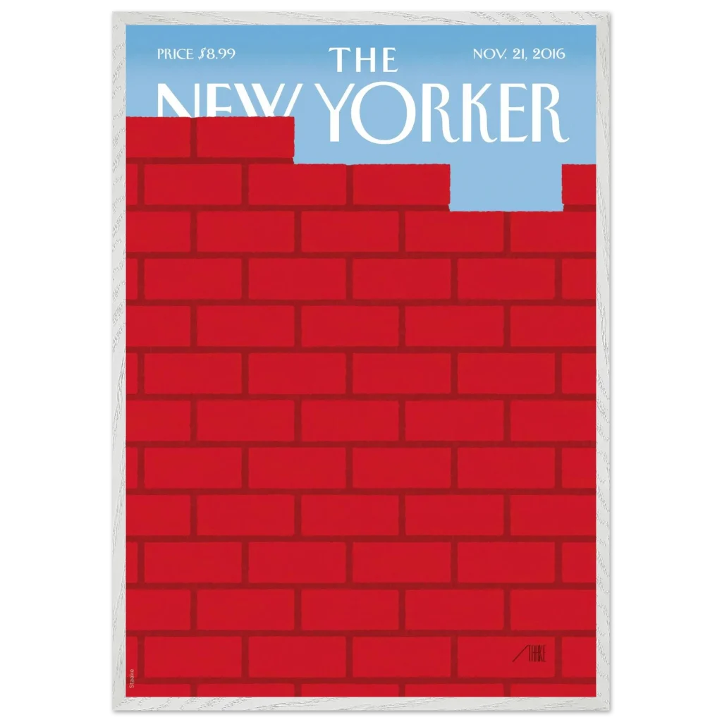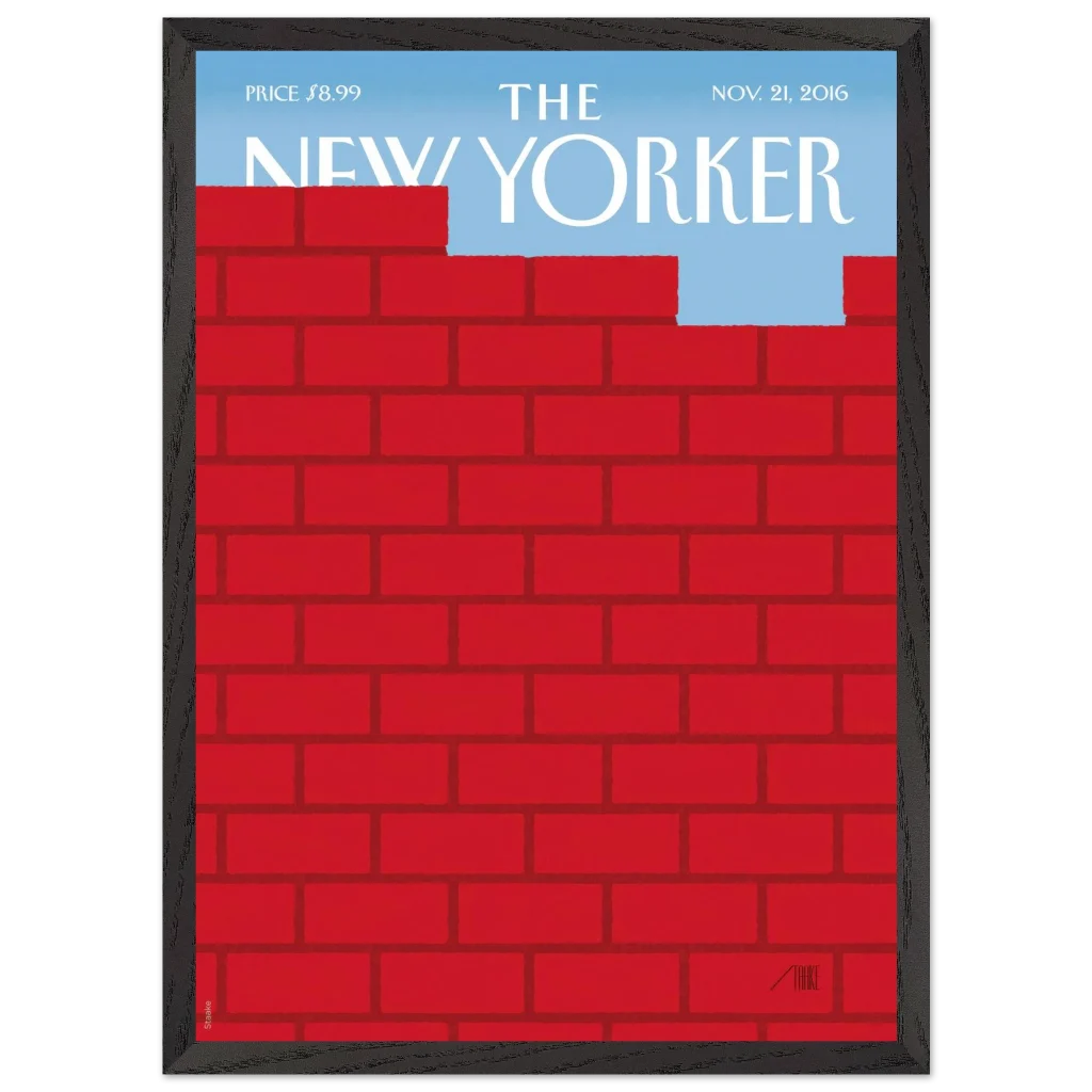 Capture a piece of iconic commentary with “The Wall” framed poster, a vibrant, minimalist tribute to classic New Yorker covers. Featuring a striking red brick wall partially obscuring the magazine’s masthead against a serene blue sky, this artwork provokes thought and adds a bold, contemporary statement to any space. It’s a powerful visual metaphor that resonates with art lovers and collectors alike.