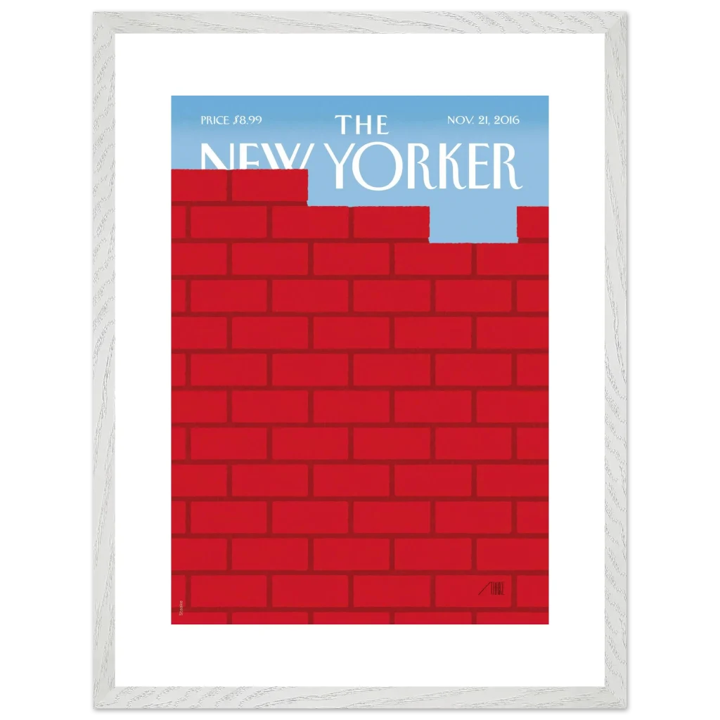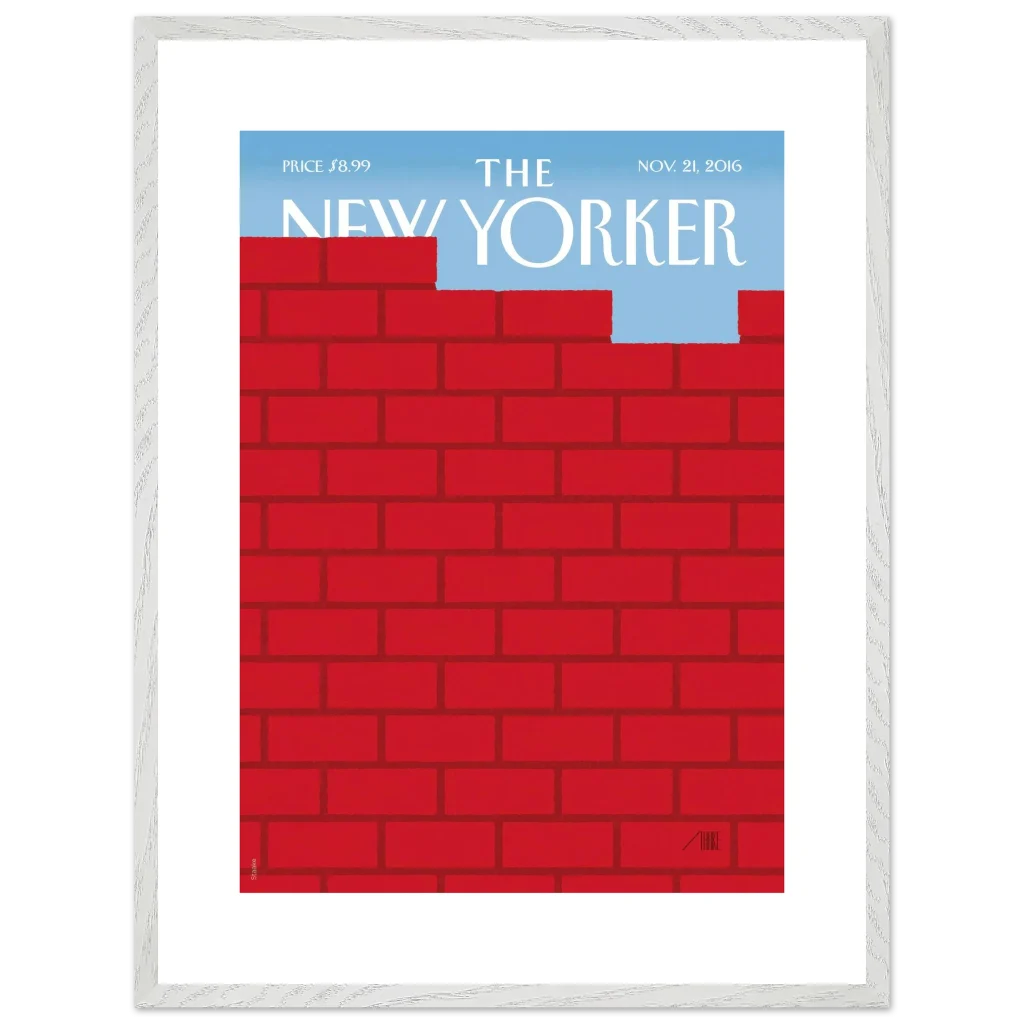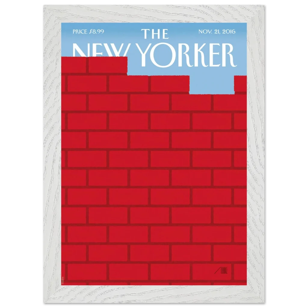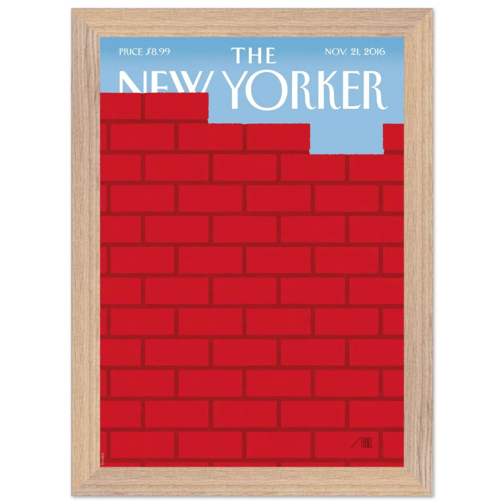 Capture a piece of iconic commentary with “The Wall” framed poster, a vibrant, minimalist tribute to classic New Yorker covers. Featuring a striking red brick wall partially obscuring the magazine’s masthead against a serene blue sky, this artwork provokes thought and adds a bold, contemporary statement to any space. It’s a powerful visual metaphor that resonates with art lovers and collectors alike.