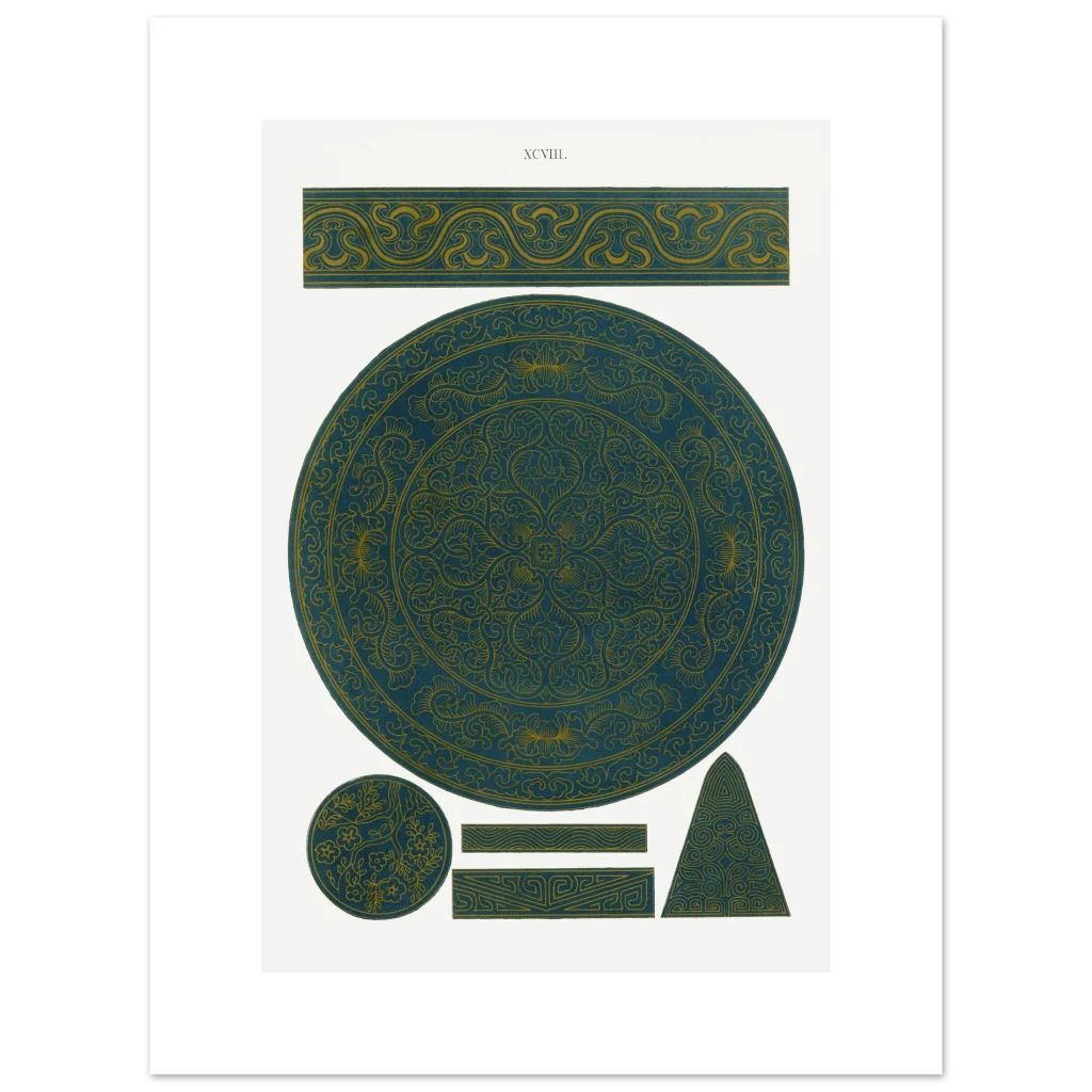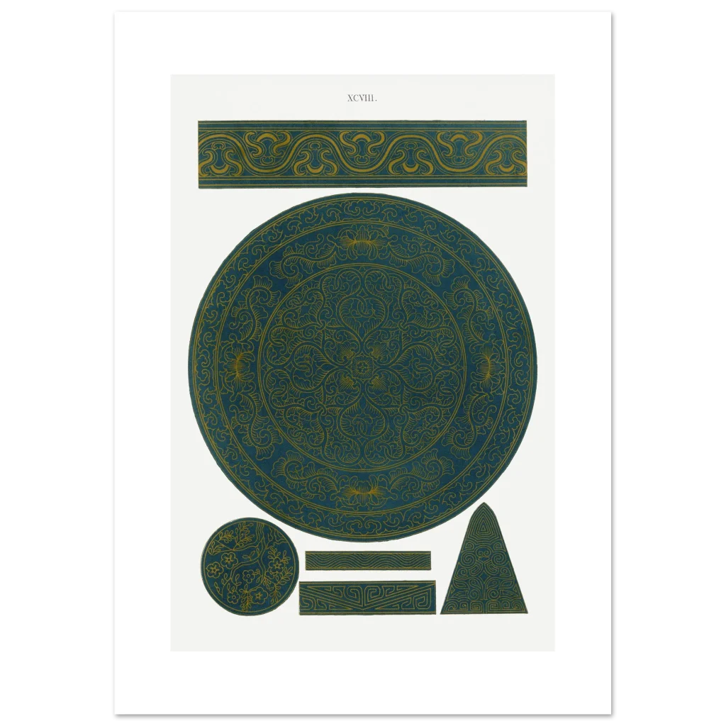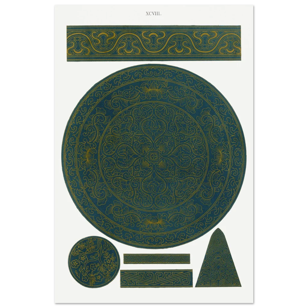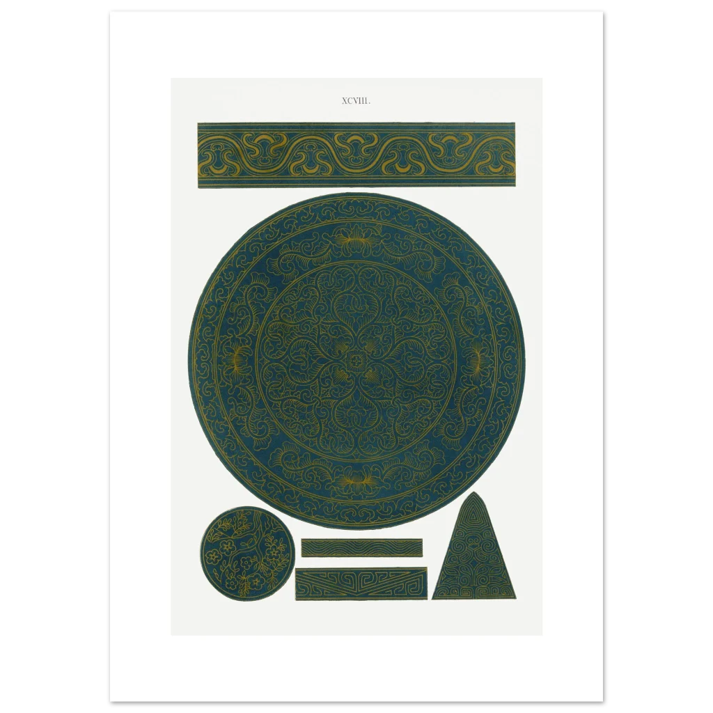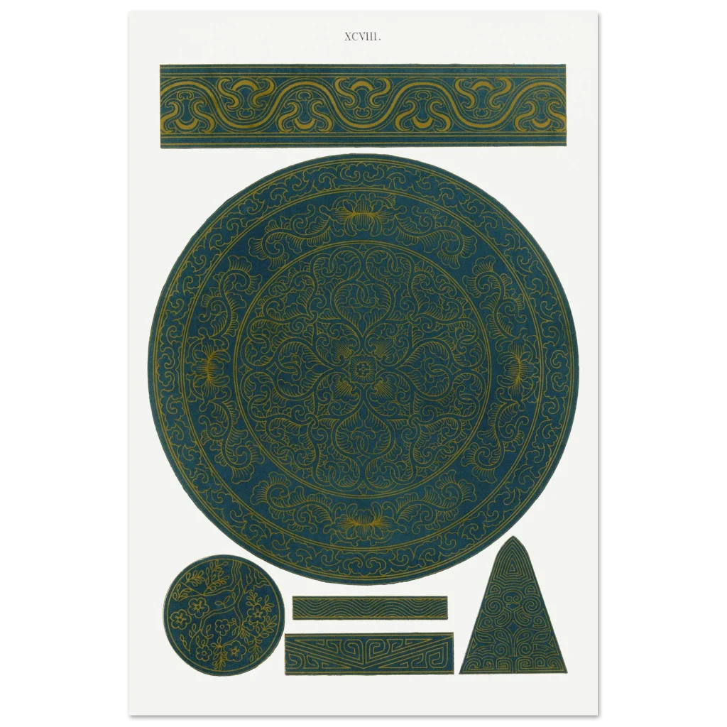 Infuse your living space with the rich elegance of historical artistry. This stunning poster showcases an intricate, symmetrical design reminiscent of ancient tapestries and decorative motifs, rendered in a captivating teal blue with radiant gold detailing. It’s a perfect blend of old-world charm and contemporary appeal, designed to add a touch of sophisticated grandeur to any room.