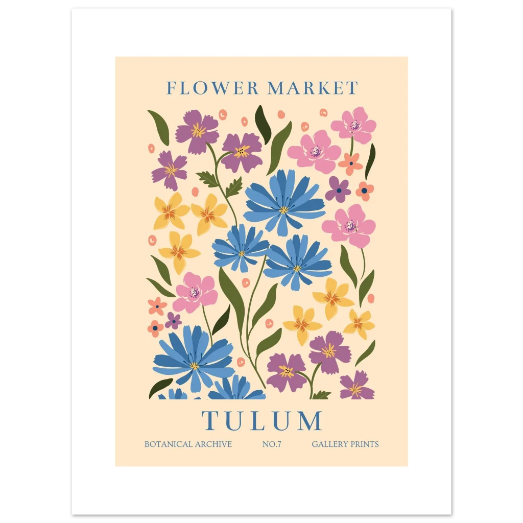 Bring the joyful exuberance of a sun-drenched floral paradise into your home with our Tulum Flower Market poster. Inspired by the charming, colorful chaos of a bustling botanical market, this print captures the vibrant energy and playful spirit of nature’s beauty. The semi-glossy finish enhances the lively blues, purples, pinks, and yellows, making each bloom pop with delightful clarity.