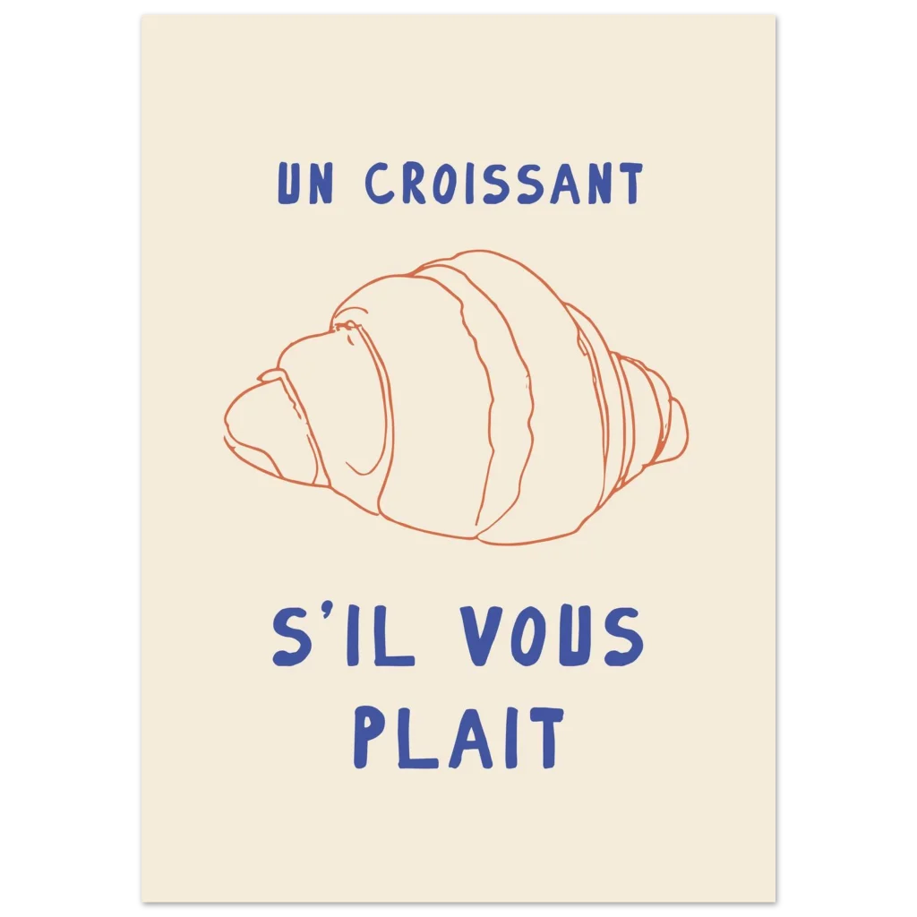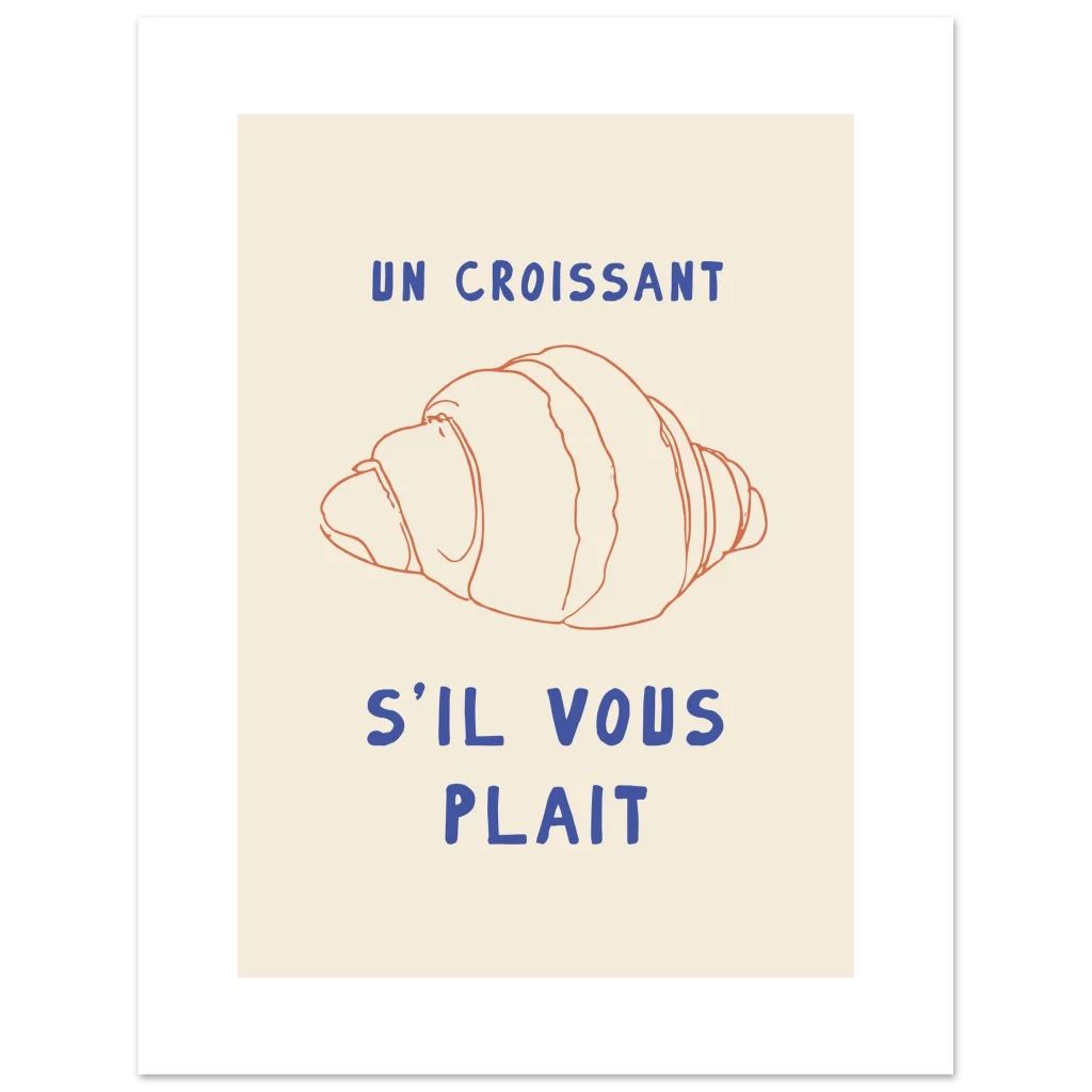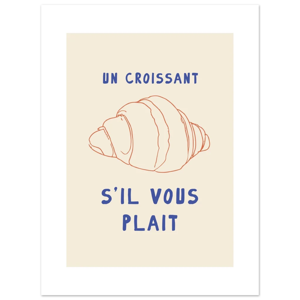 Bring a touch of Parisian charm and delightful simplicity into your home with our “Un Croissant S’il Vous Plait” art print. Featuring a playful, hand-drawn croissant illustration and the polite French phrase in a whimsical blue script, this poster evokes the joy of a perfect morning in a charming French cafe. The warm, inviting color palette of creamy beige, terracotta, and soft blue adds a cozy yet stylish accent to any kitchen, dining area, or coffee nook.