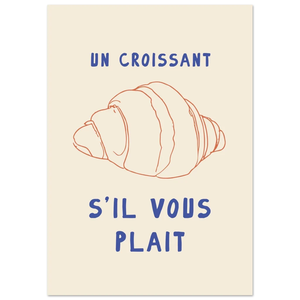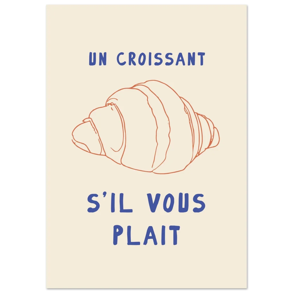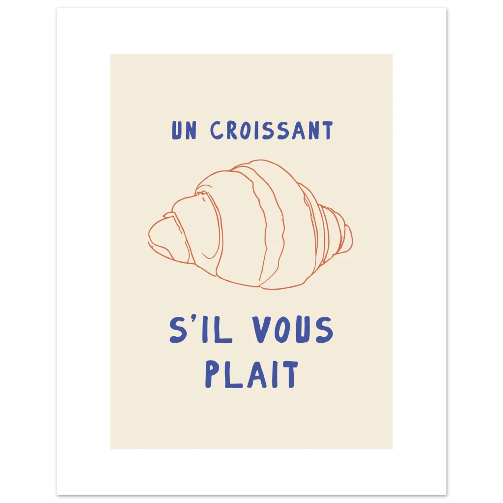 Bring a touch of Parisian charm and delightful simplicity into your home with our “Un Croissant S’il Vous Plait” art print. Featuring a playful, hand-drawn croissant illustration and the polite French phrase in a whimsical blue script, this poster evokes the joy of a perfect morning in a charming French cafe. The warm, inviting color palette of creamy beige, terracotta, and soft blue adds a cozy yet stylish accent to any kitchen, dining area, or coffee nook.