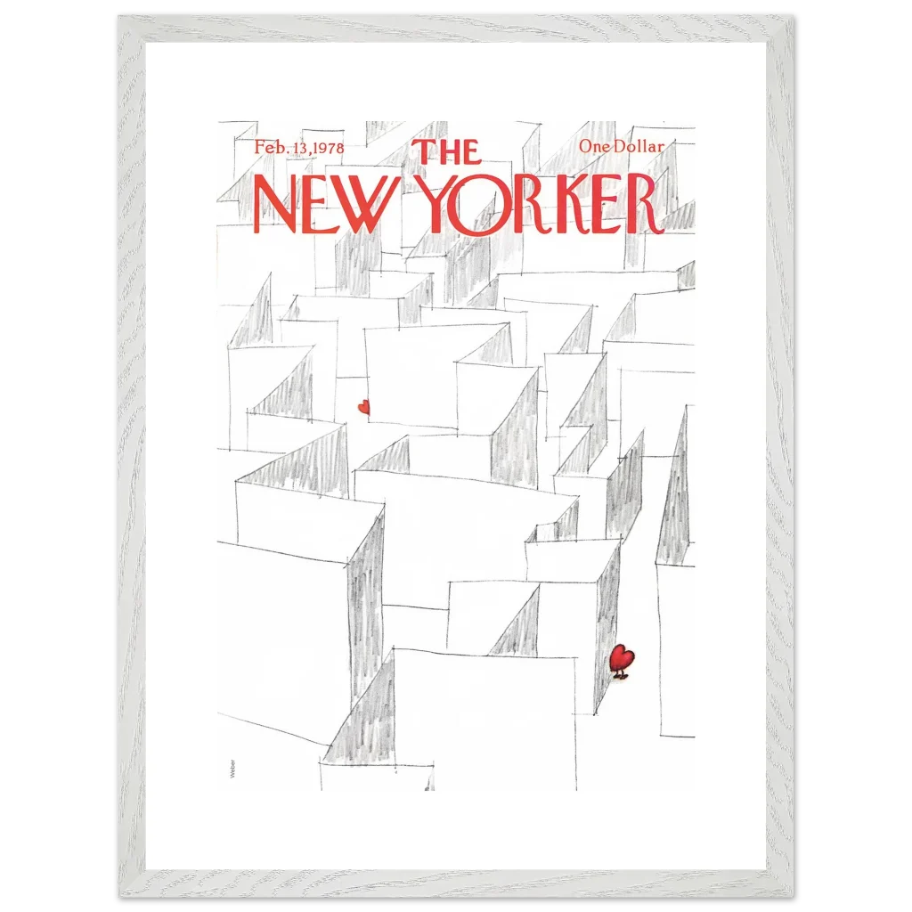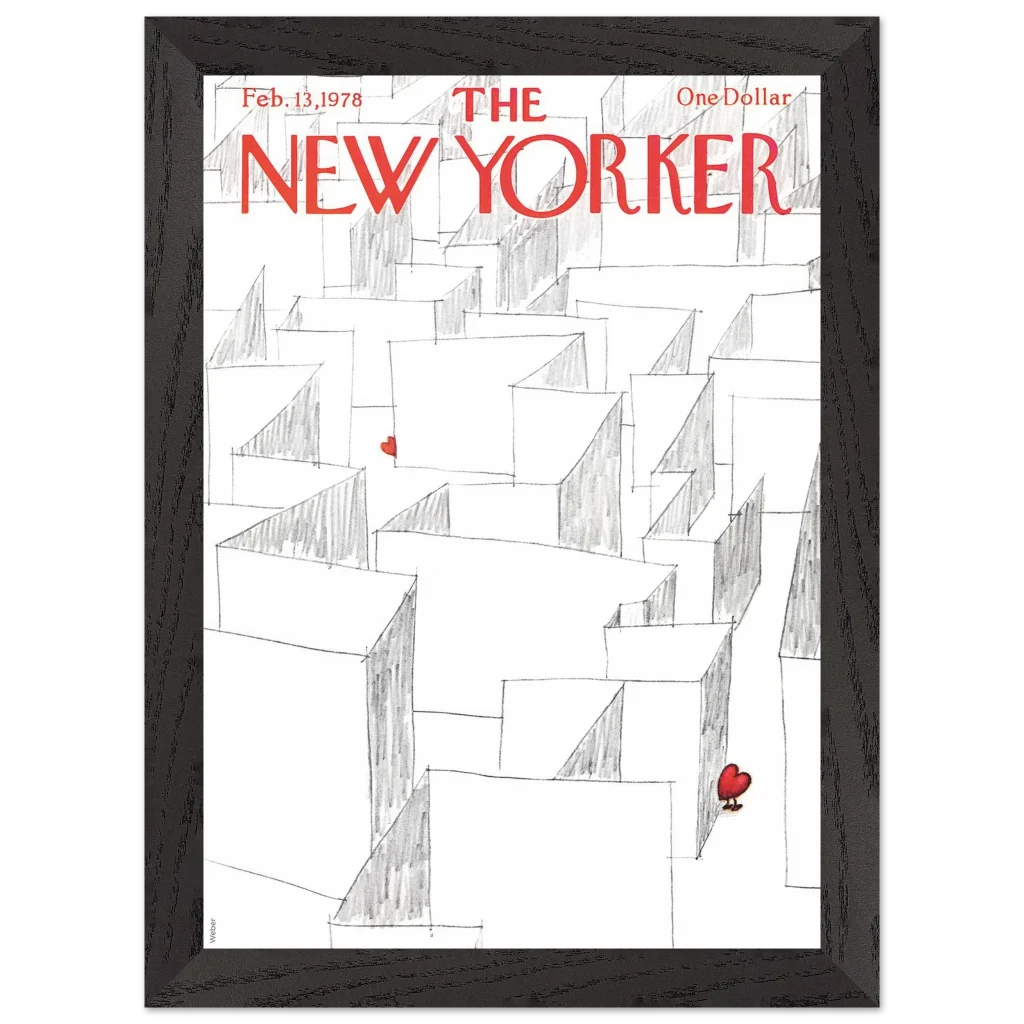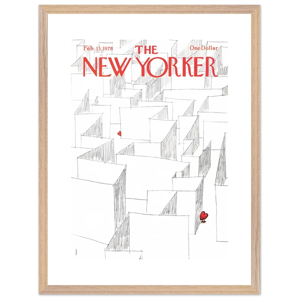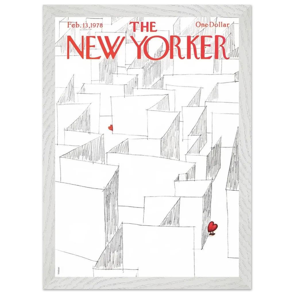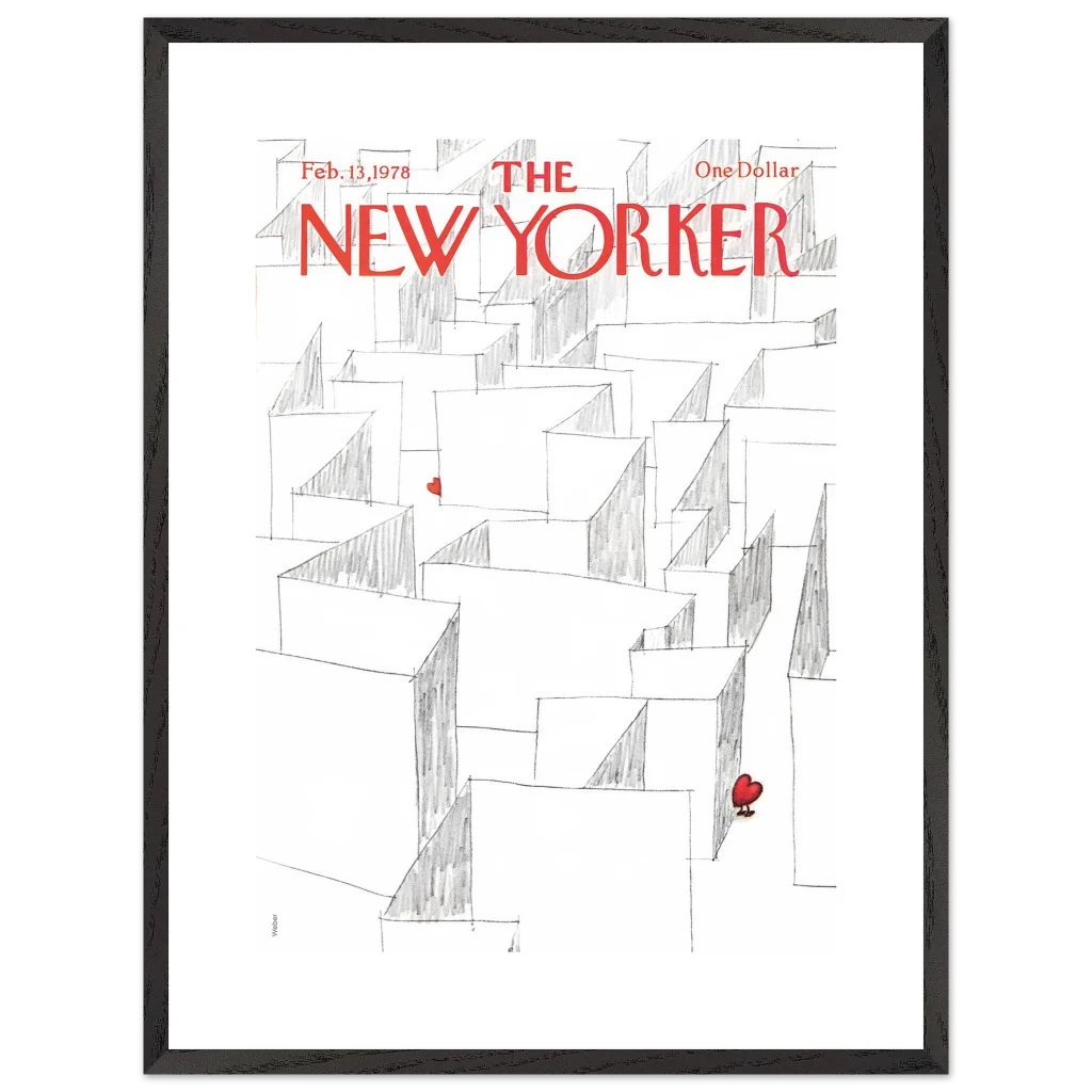 Capture the essence of playful romance with our Valentine’s Day Heart Maze framed poster, featuring an iconic New Yorker cover. This charming illustration, with its whimsical maze and a single, vibrant red heart, brings a touch of lightheartedness and nostalgia to any space. It’s the perfect statement piece for those who appreciate art with a story, transforming your wall into a focal point of unique character.