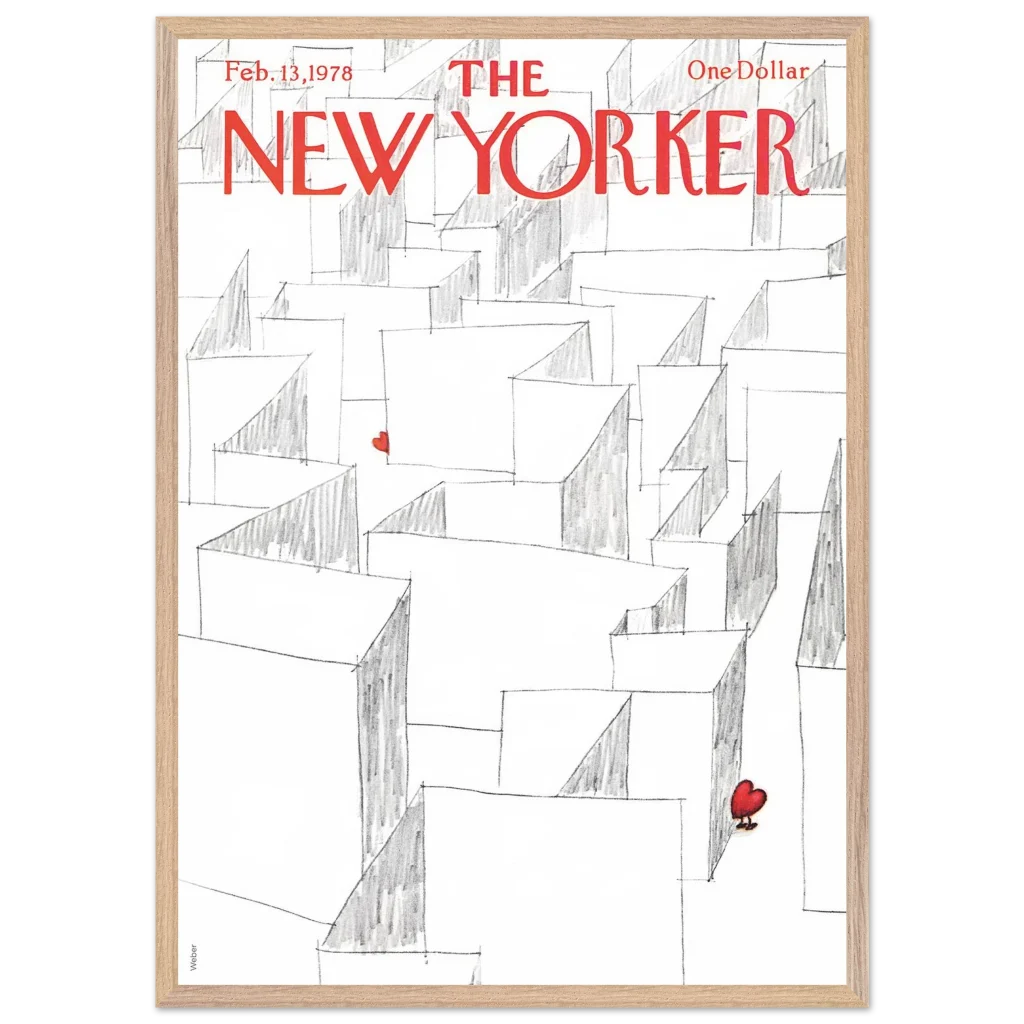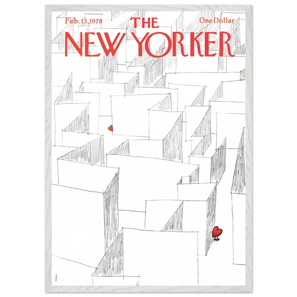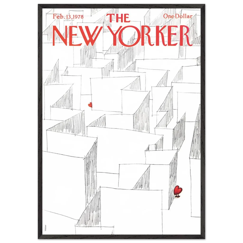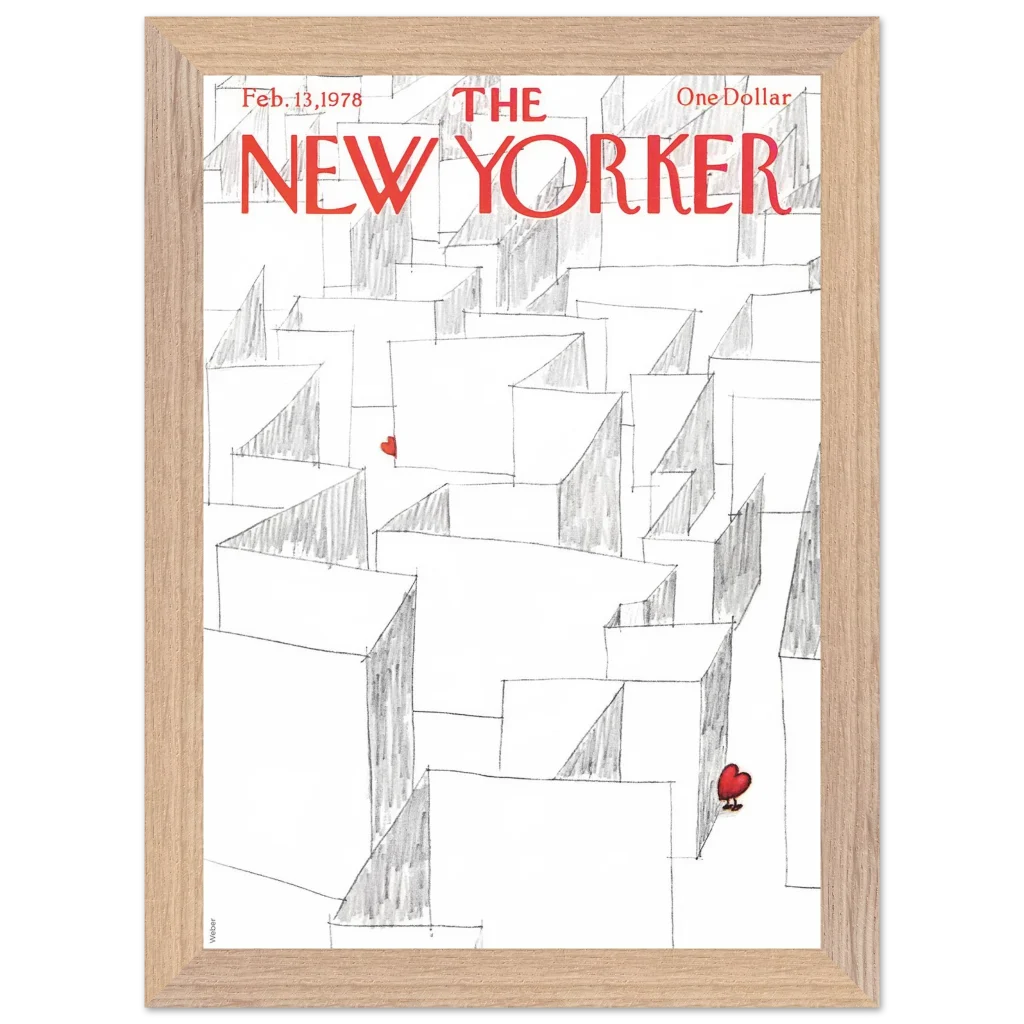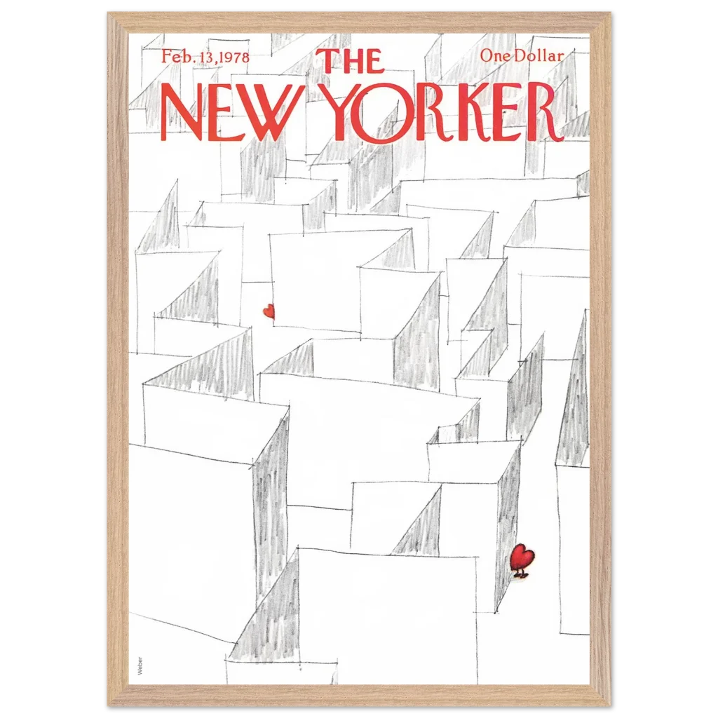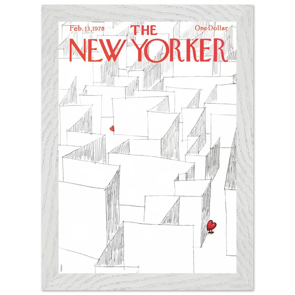 Capture the essence of playful romance with our Valentine’s Day Heart Maze framed poster, featuring an iconic New Yorker cover. This charming illustration, with its whimsical maze and a single, vibrant red heart, brings a touch of lightheartedness and nostalgia to any space. It’s the perfect statement piece for those who appreciate art with a story, transforming your wall into a focal point of unique character.