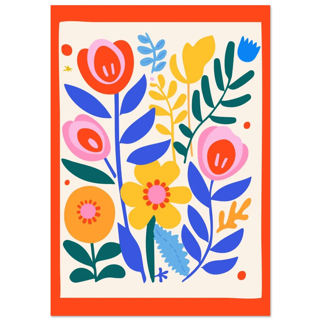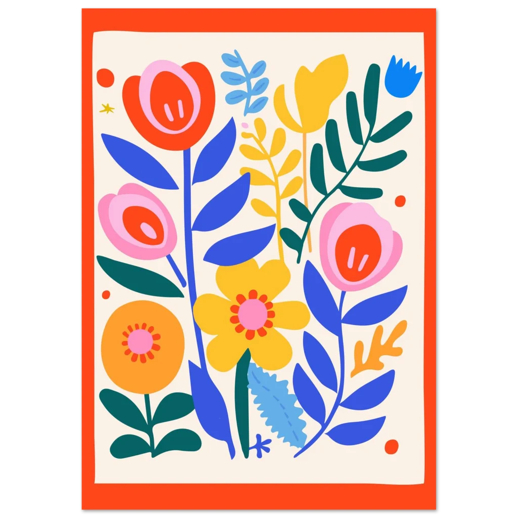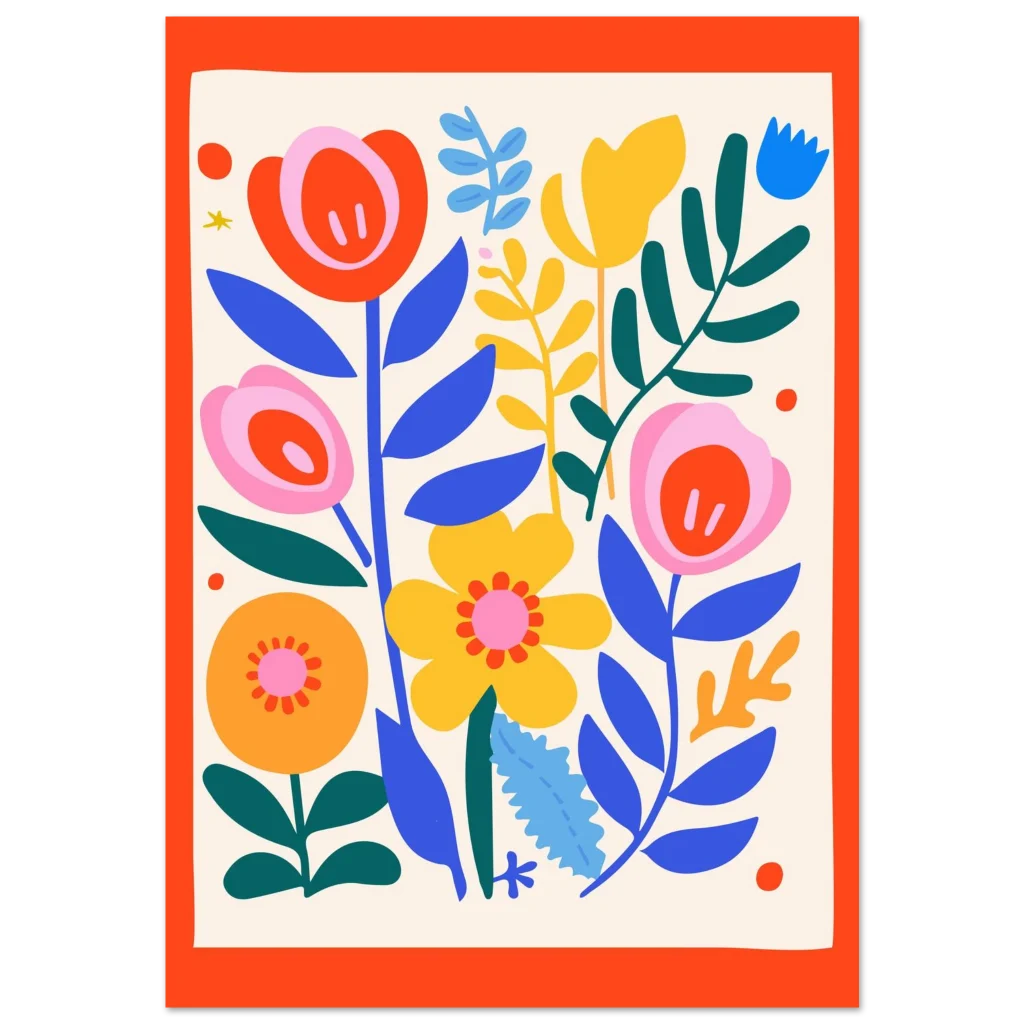 Infuse your space with a burst of joyous color and playful botanical charm with our Vibrant Abstract Floral poster. Featuring an exuberant palette of fiery reds, deep blues, sunshine yellows, and soft pinks, this art print captures the essence of a whimsical garden in full bloom. Its clean lines and bold shapes offer a modern take on nature, perfect for brightening up any room and sparking conversation.