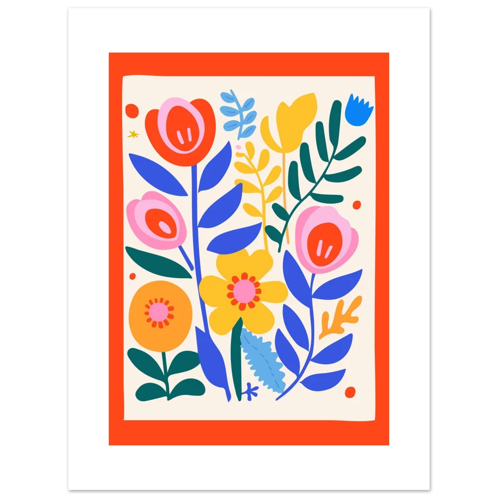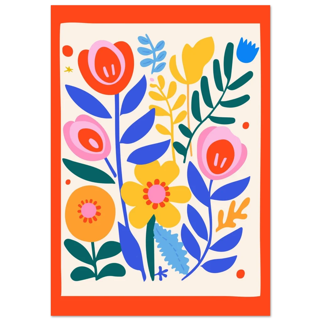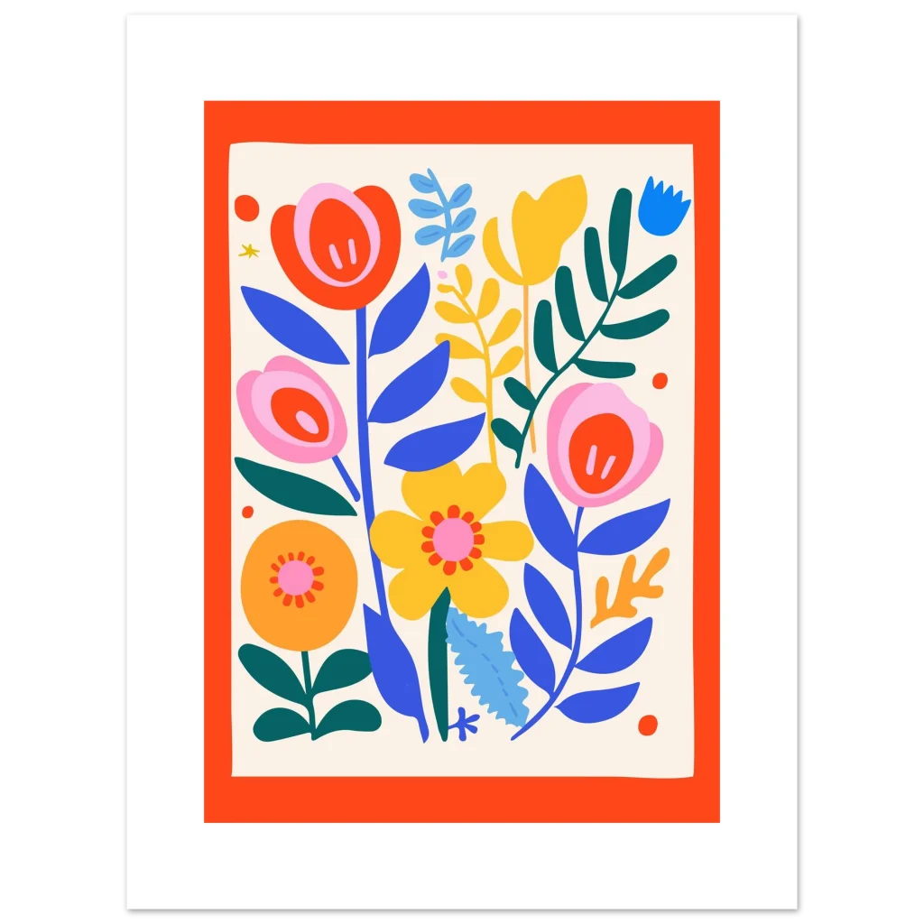 Infuse your space with a burst of joyous color and playful botanical charm with our Vibrant Abstract Floral poster. Featuring an exuberant palette of fiery reds, deep blues, sunshine yellows, and soft pinks, this art print captures the essence of a whimsical garden in full bloom. Its clean lines and bold shapes offer a modern take on nature, perfect for brightening up any room and sparking conversation.