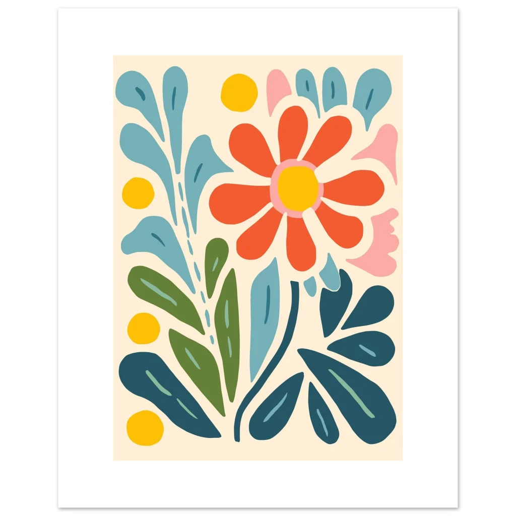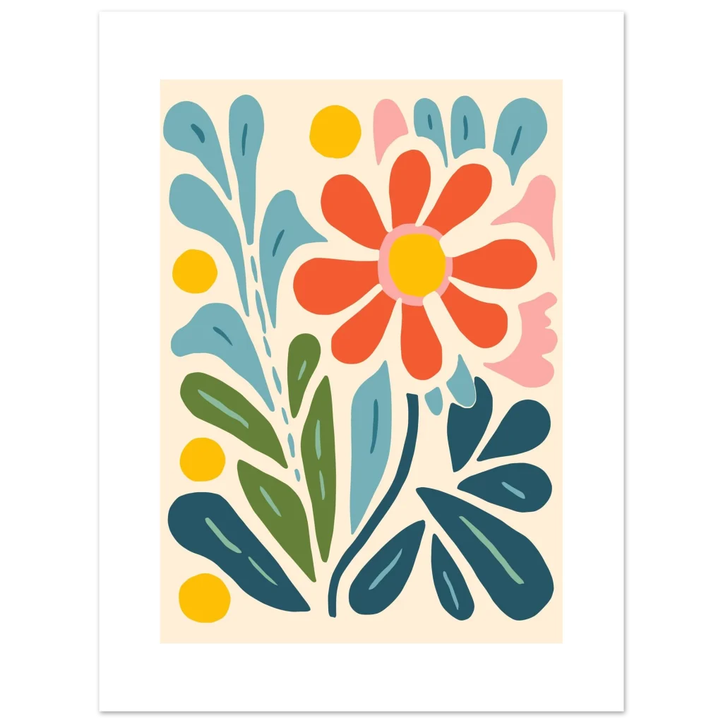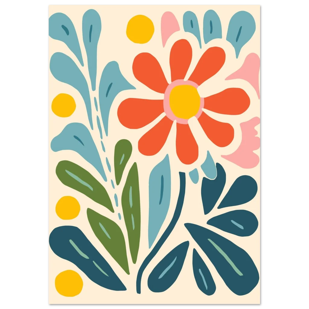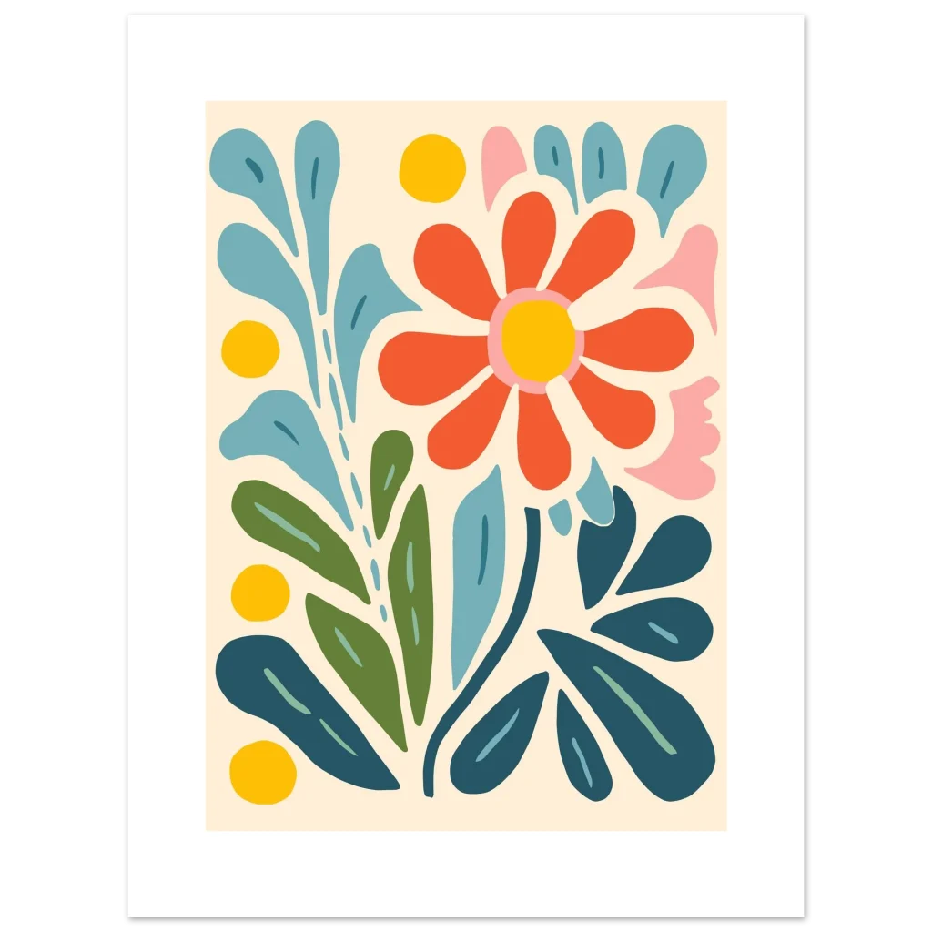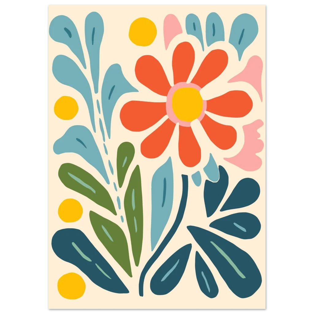 Infuse your space with a burst of joyous color and playful design! This vibrant abstract floral poster, with its delightful mid-century modern aesthetic, brings a cheerful and artistic touch to any room. Featuring bold shapes and a captivating palette of warm oranges, cheerful yellows, and cool blues, this print is designed to inspire happiness and creativity.