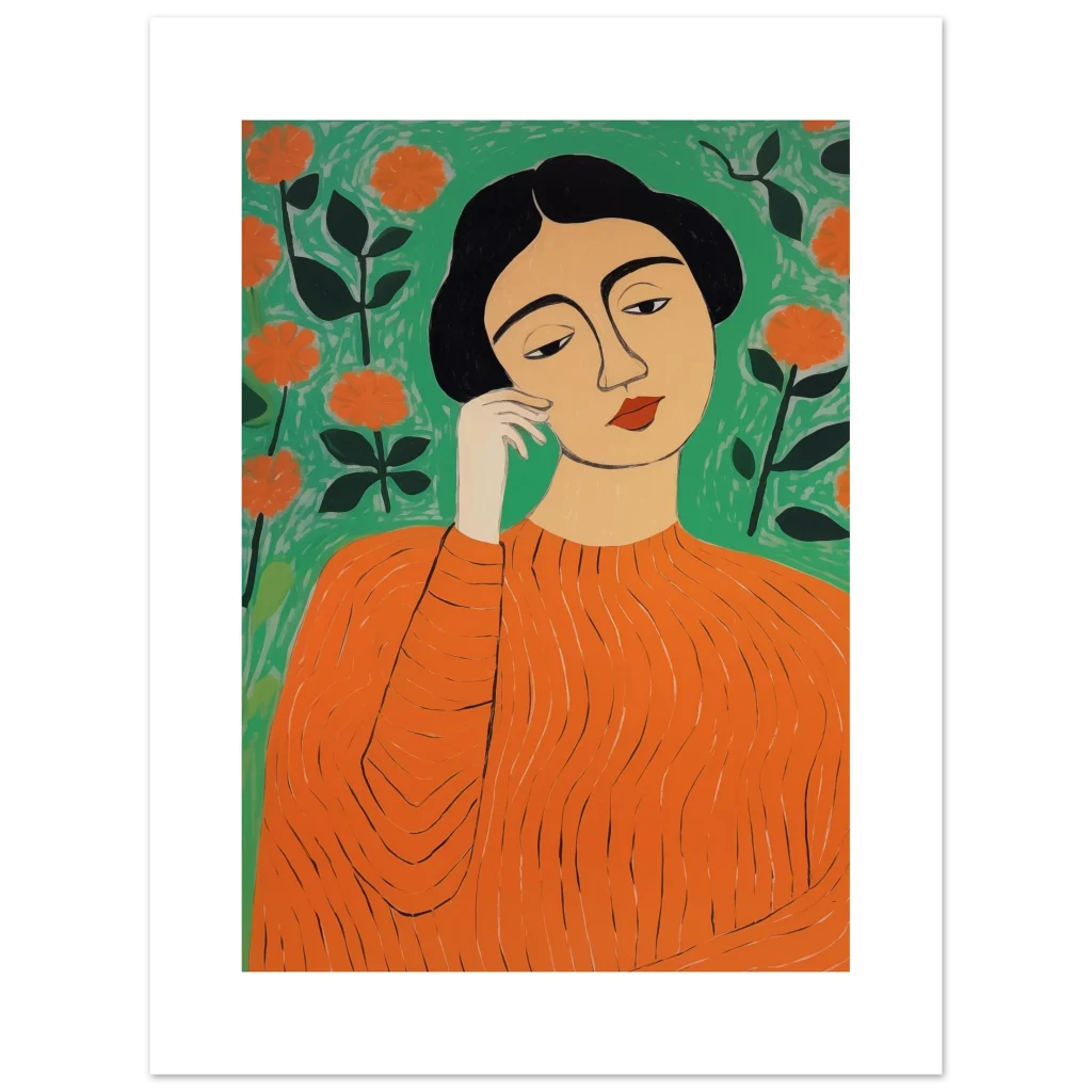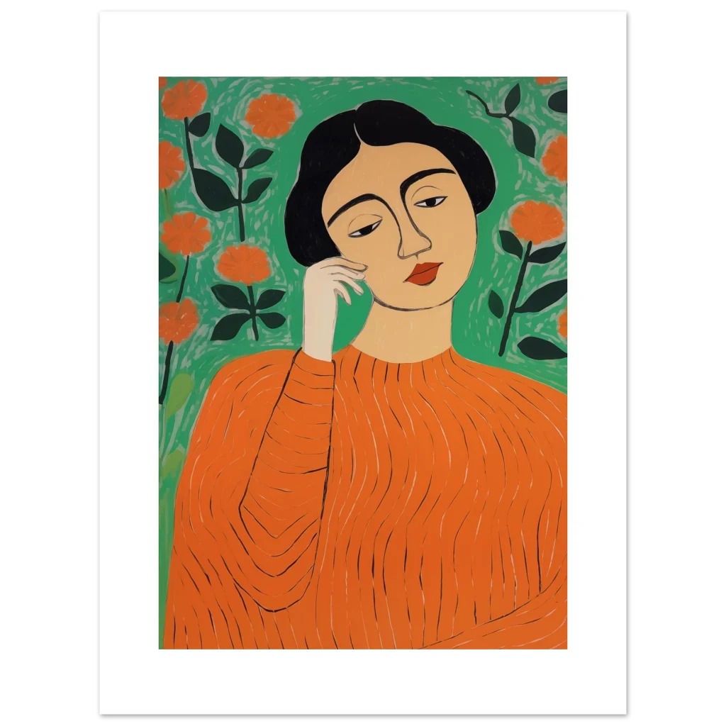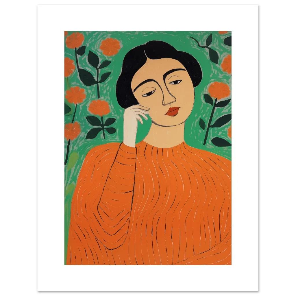 Bring a touch of modern sophistication and vibrant energy to your space with this stunning art print. Featuring an abstract portrayal of a woman amidst blossoming flowers in a striking palette of orange and green, this piece exudes a thoughtful, calming yet lively mood. Its unique artistic style makes it a perfect focal point for any room, adding personality and a splash of color that captivates.