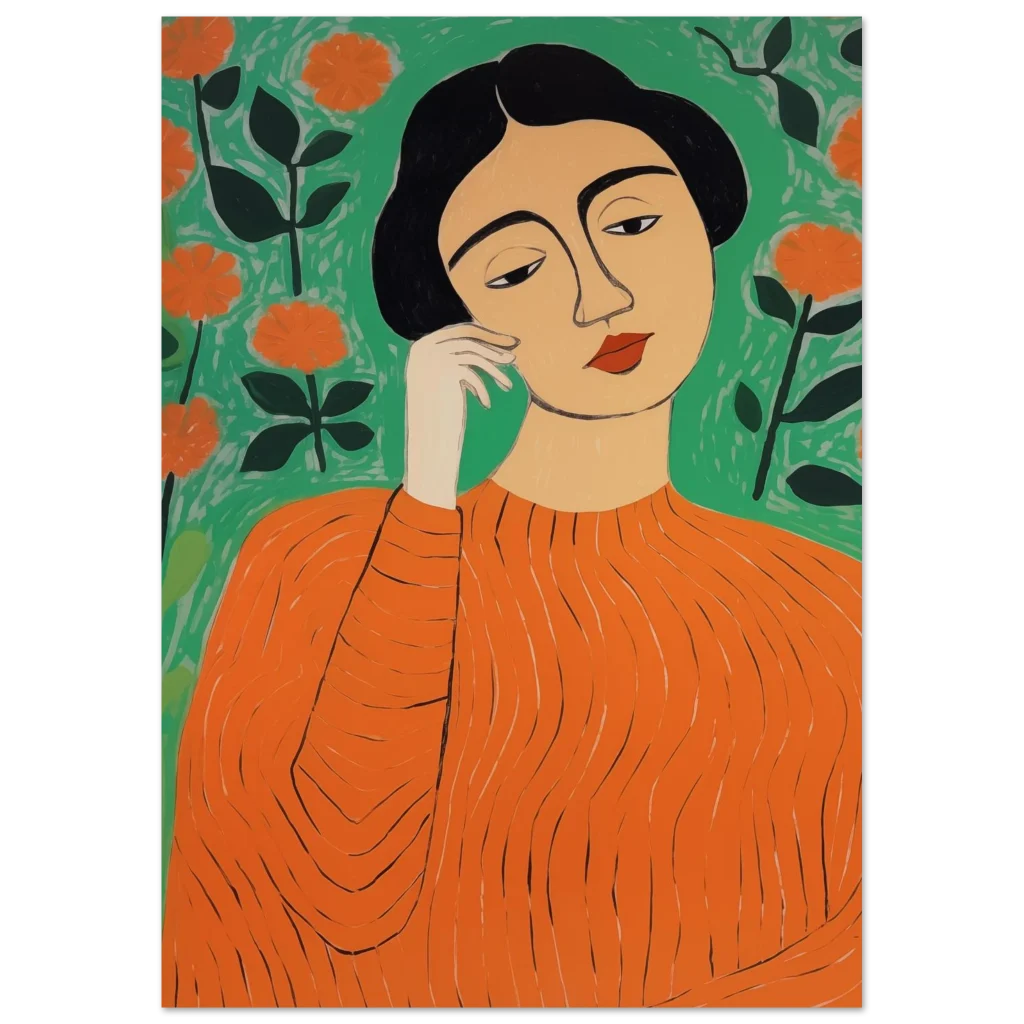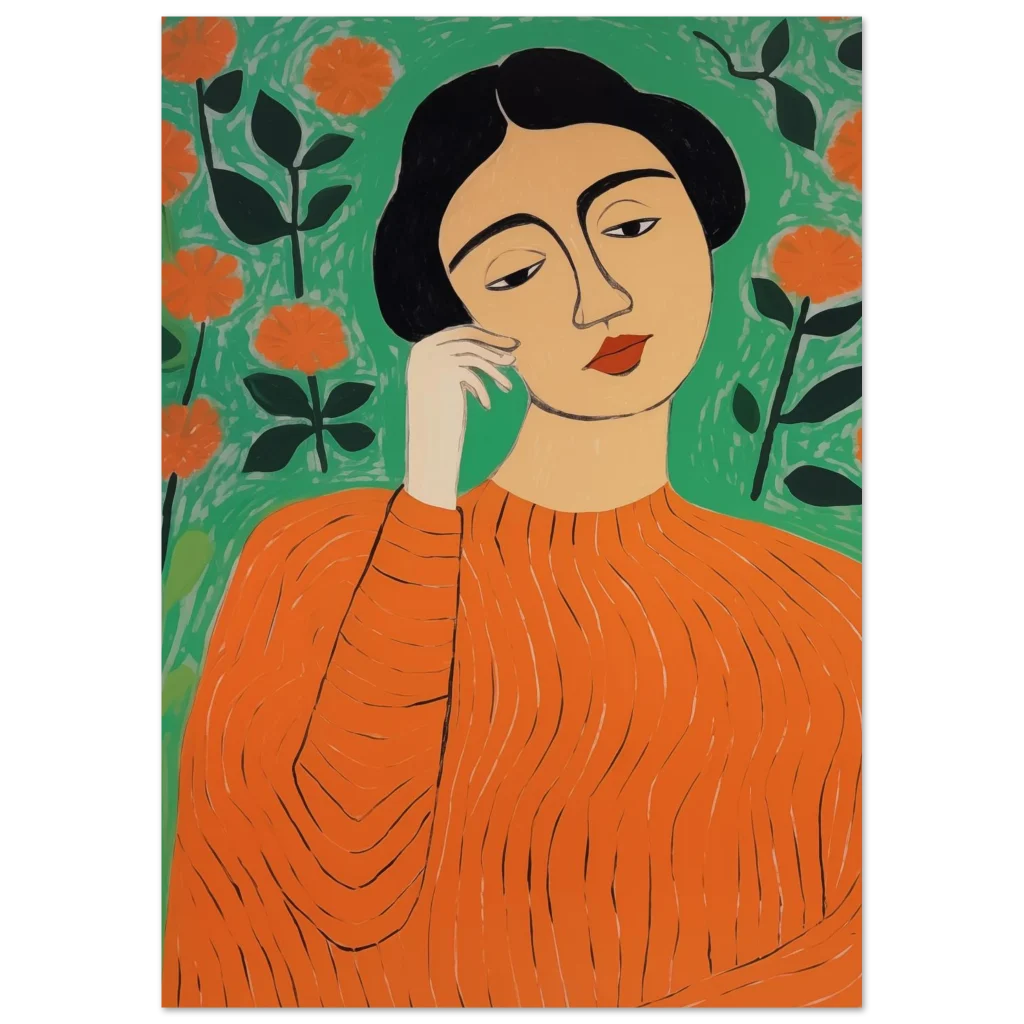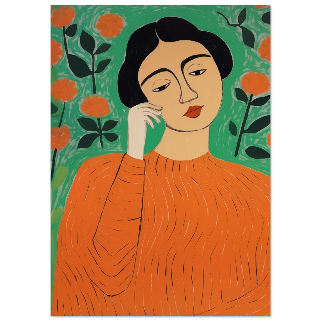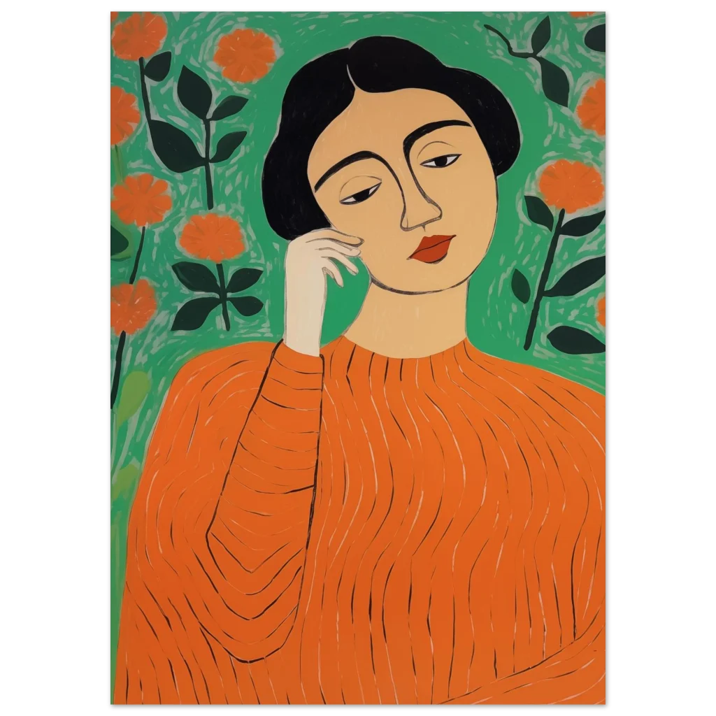 Bring a touch of modern sophistication and vibrant energy to your space with this stunning art print. Featuring an abstract portrayal of a woman amidst blossoming flowers in a striking palette of orange and green, this piece exudes a thoughtful, calming yet lively mood. Its unique artistic style makes it a perfect focal point for any room, adding personality and a splash of color that captivates.