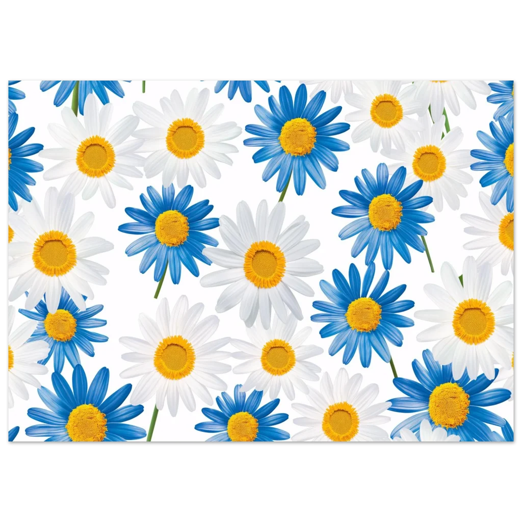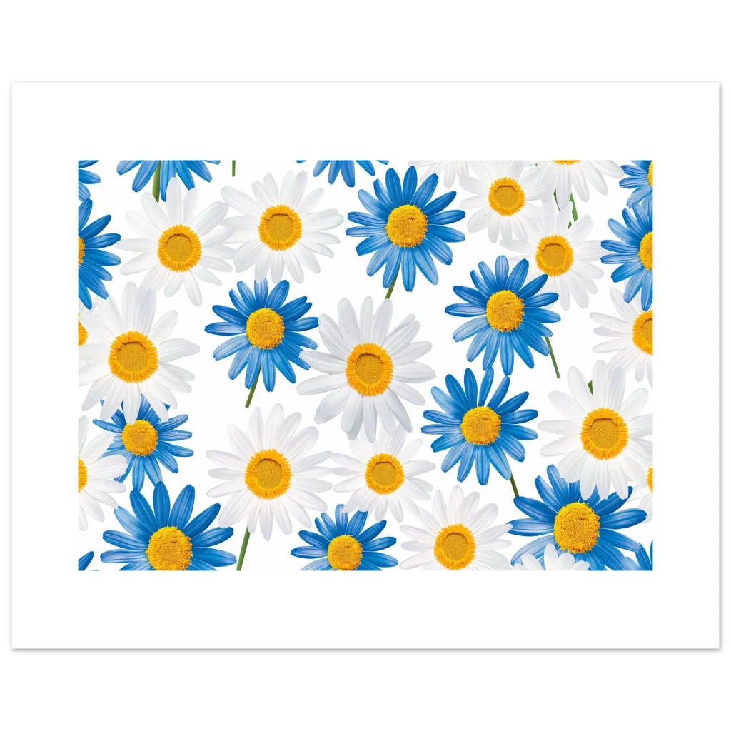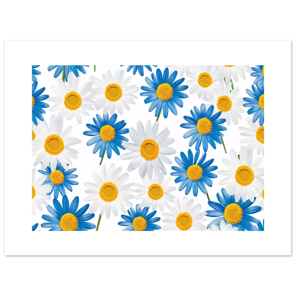 Bring the cheerful beauty of a daisy field indoors with this vibrant blue and white floral poster. Capturing the fresh, calming essence of nature, this artwork adds a pop of bright color and a serene mood to any room. Perfect for those who appreciate botanical elegance and a touch of playful charm.