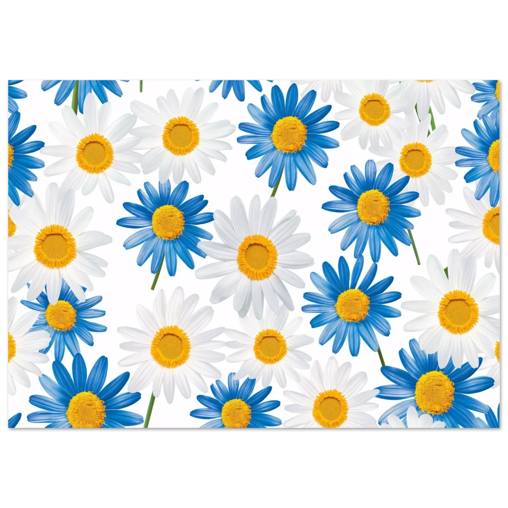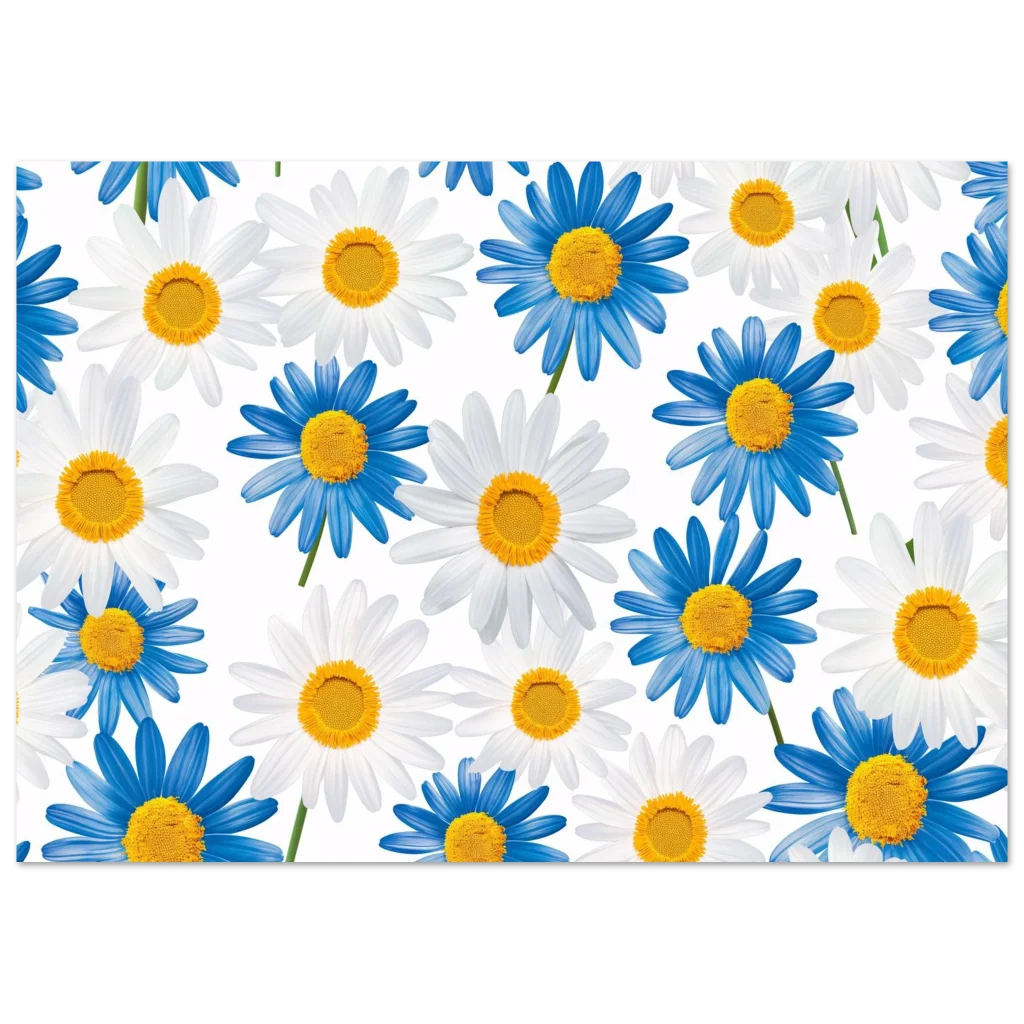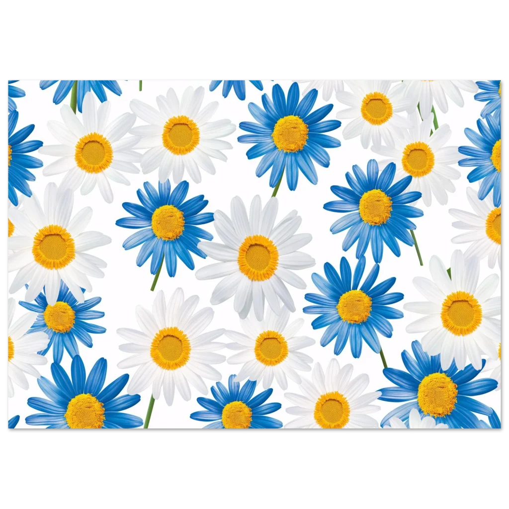 Bring the cheerful beauty of a daisy field indoors with this vibrant blue and white floral poster. Capturing the fresh, calming essence of nature, this artwork adds a pop of bright color and a serene mood to any room. Perfect for those who appreciate botanical elegance and a touch of playful charm.