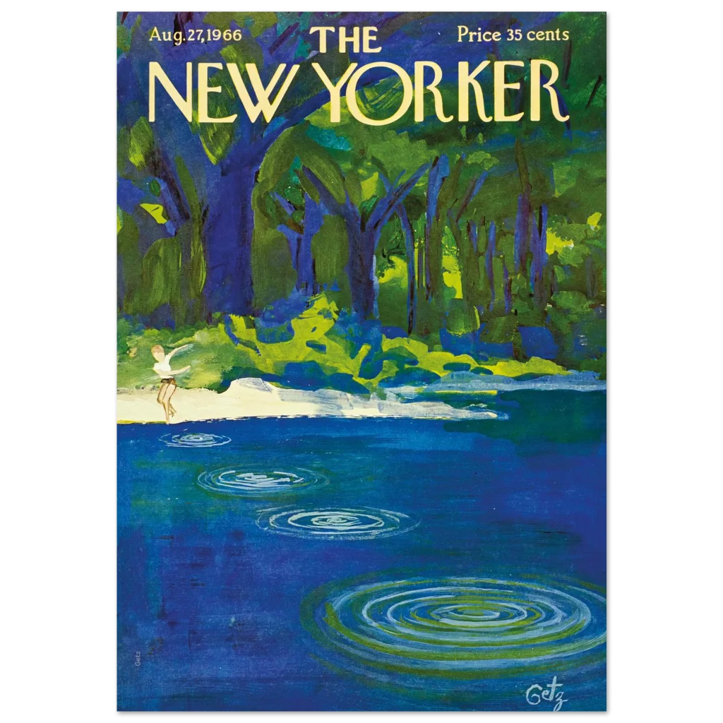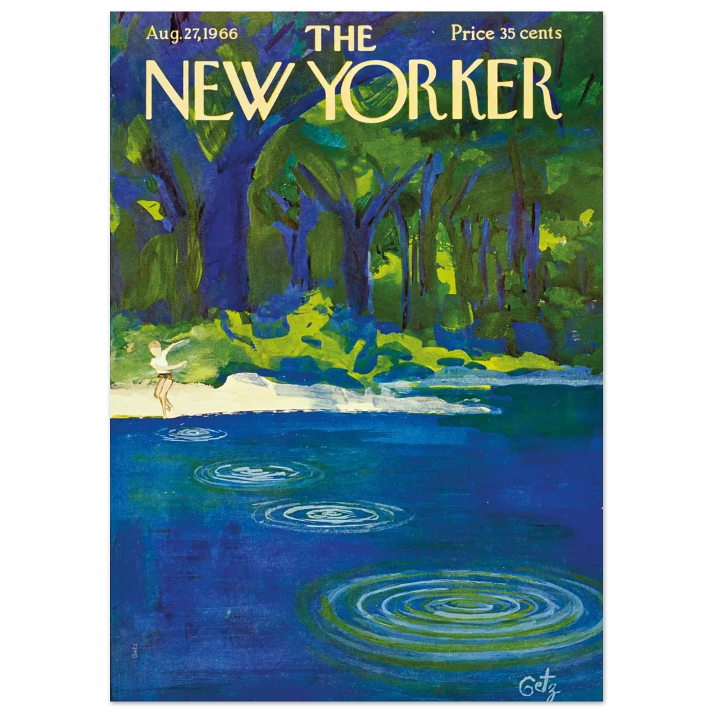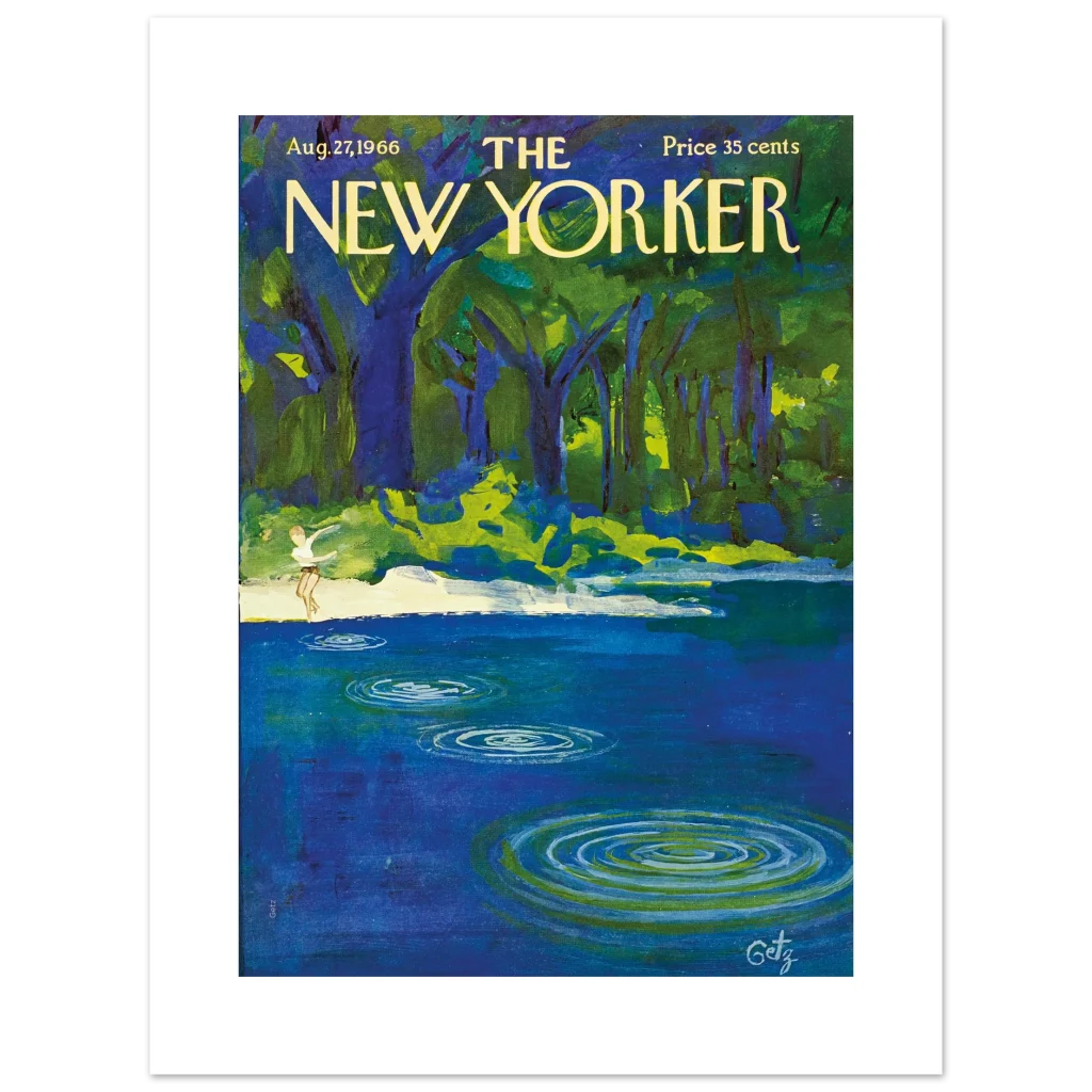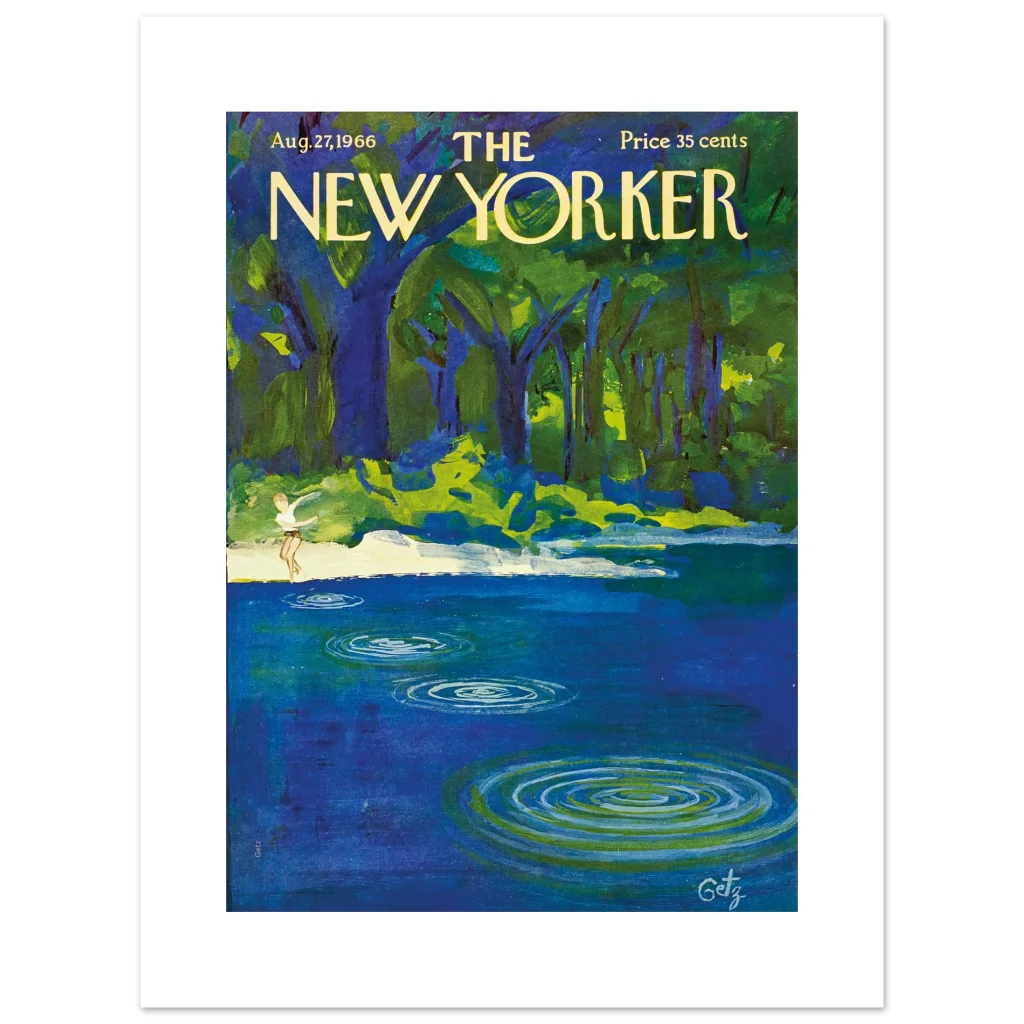 Capture the essence of a serene summer day with this stunning Premium Matte Paper Poster, showcasing a timeless New Yorker cover. The rich, vibrant hues of deep blue and lush green create a tranquil scene, inviting you to pause and reflect on the simple joys of nature. This expressive art piece features a playful figure by the water’s edge, evoking a sense of carefree bliss and nostalgic charm that will bring a breath of fresh air to any room.