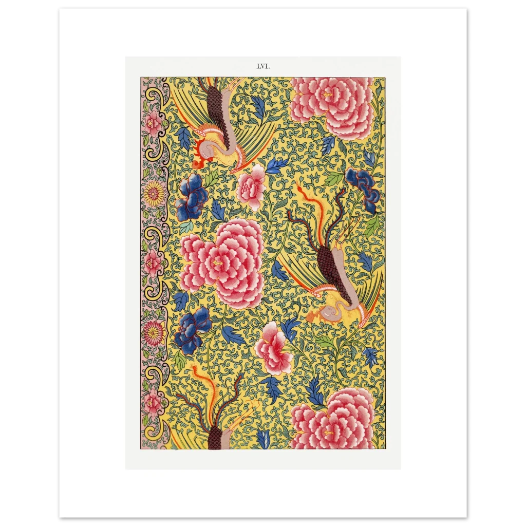Infuse your space with the captivating charm of traditional Chinoiserie with this stunning art print. Featuring an intricate dance of lush pink peonies, deep blue florals, and mystical phoenixes against a vibrant yellow background, this design brings a rich sense of history and opulent color to any room. It’s an ideal choice for adding a touch of classic elegance and a bold pop of color to your decor.