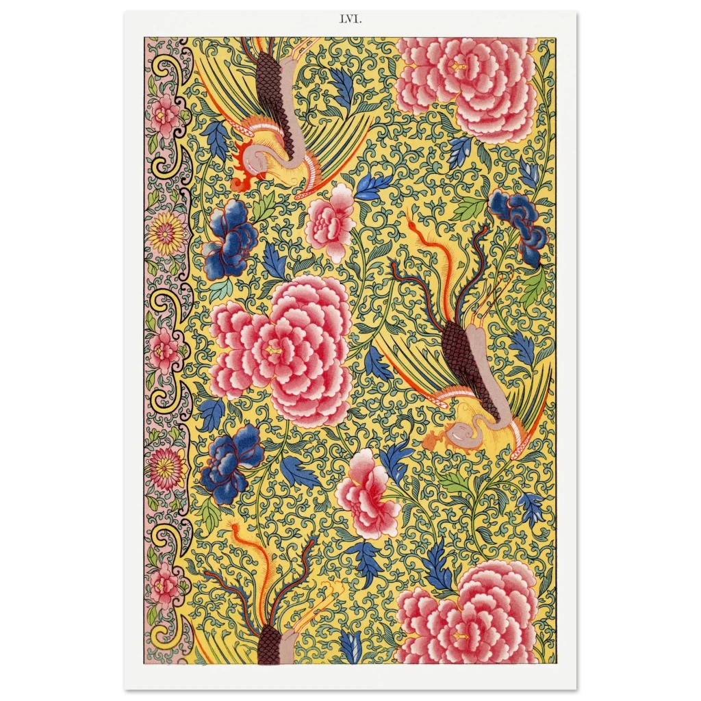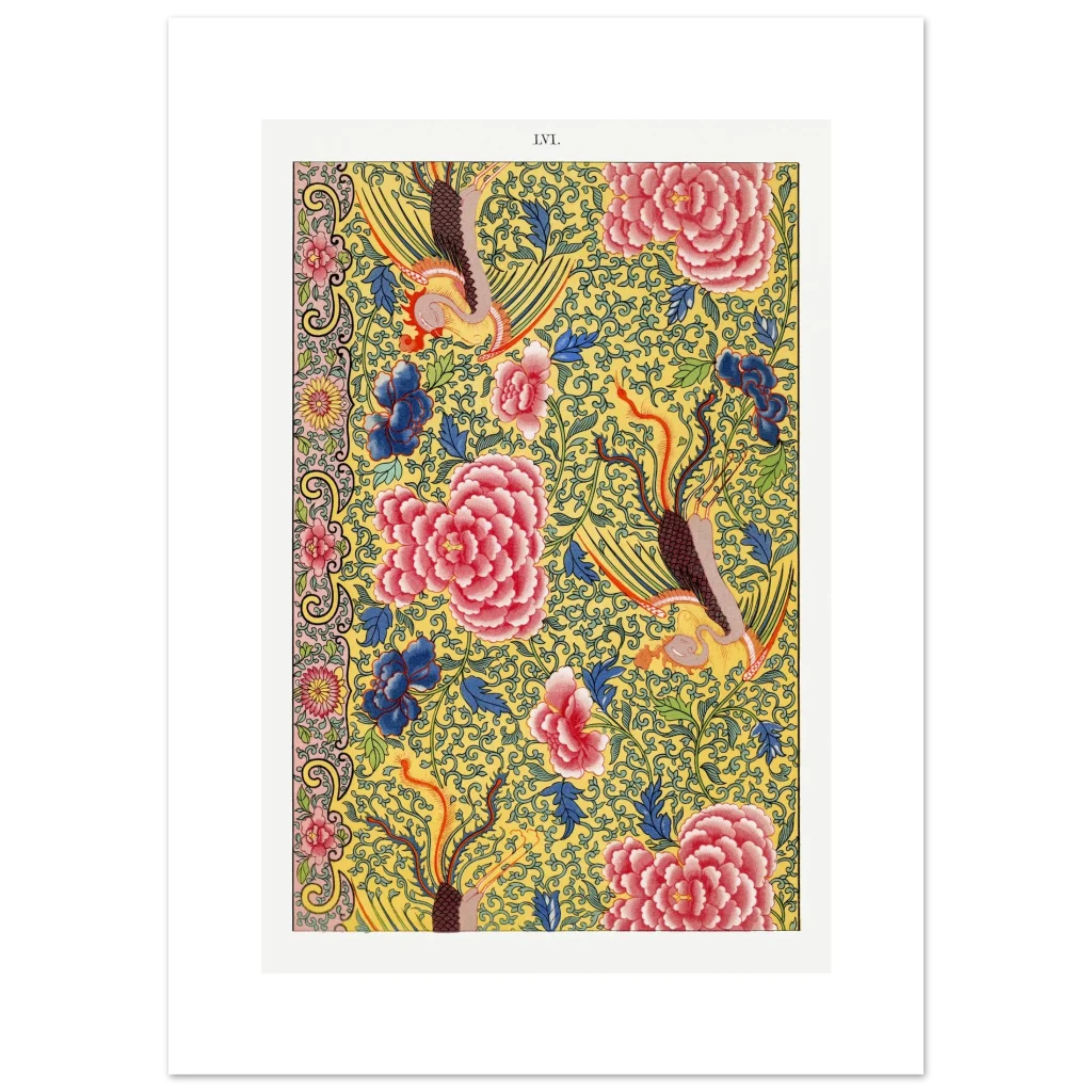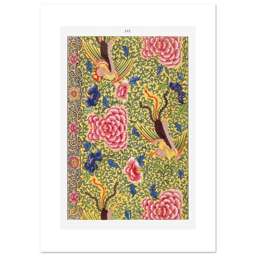Vibrant Chinoiserie Floral & Phoenix Art Print – Premium Matte Paper Poster in Multiple Sizes
