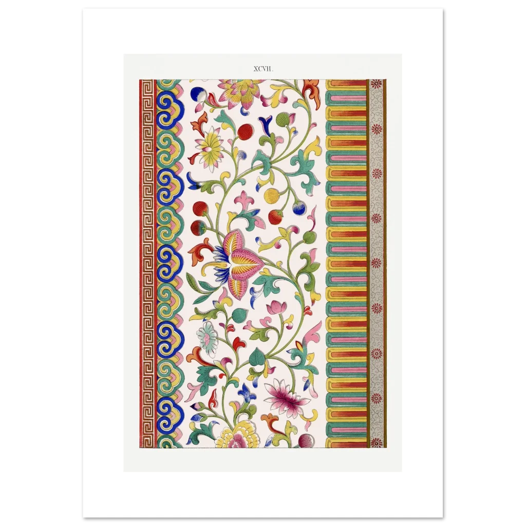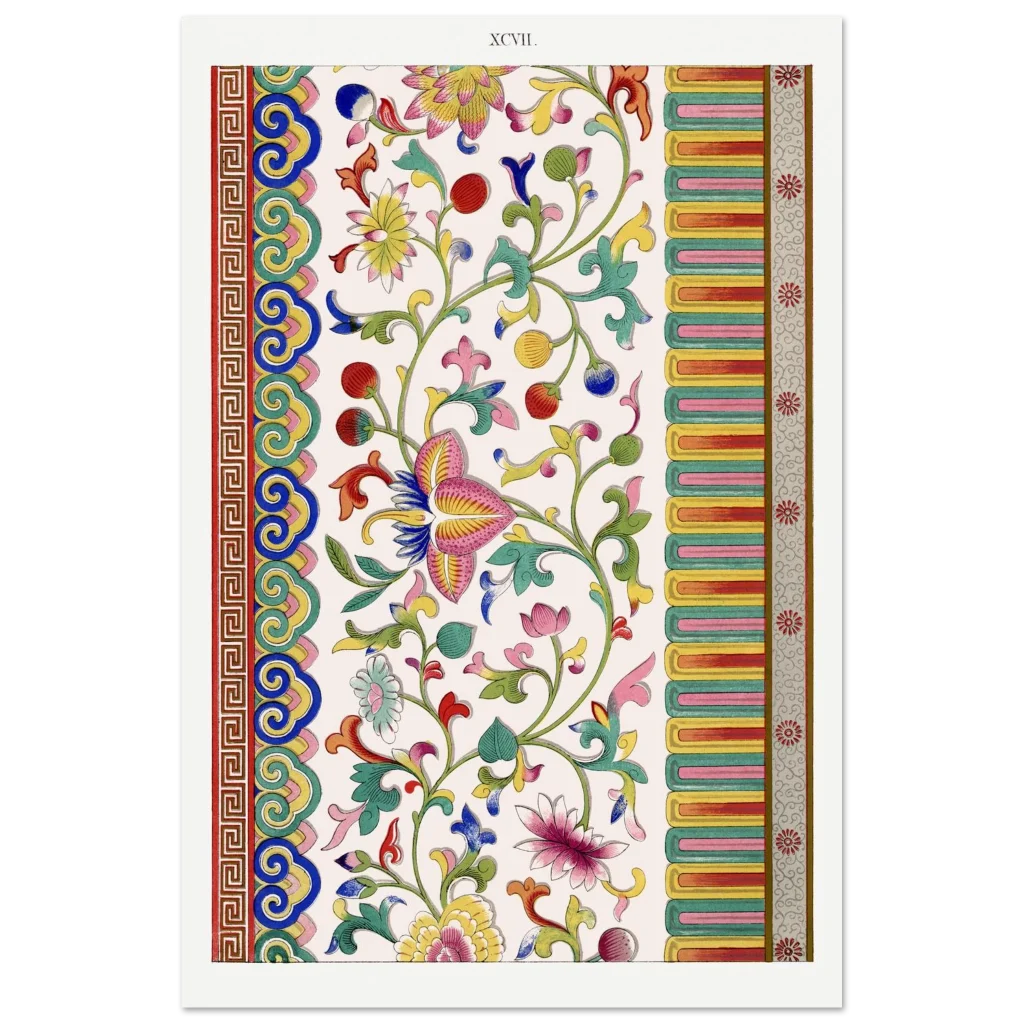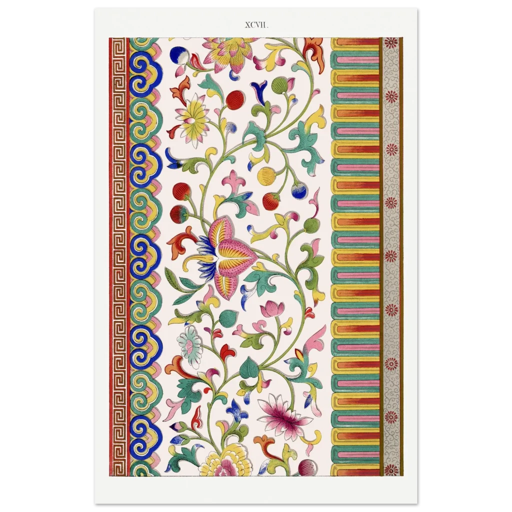 Bring the timeless elegance and vibrant energy of traditional Chinoiserie into your living space with this exquisite floral art print. Featuring a lively botanical vine adorned with colorful blooms, intricate leaves, and classic patterns like the Greek key and cloud motifs, this poster adds a sophisticated touch of artistic heritage. The rich color palette and detailed design will captivate any admirer of classic art, making it a focal point in any room.